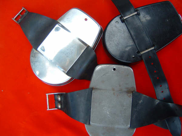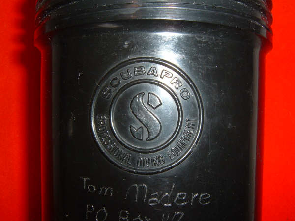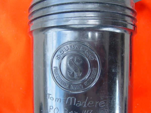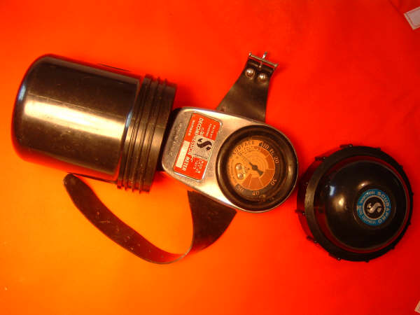 The Italian made SOS Decompression meter was marketed by many different dive manufactures in many different styles. Here I have a few. Please note the black one is a plastic case. Many divers affectionately called these mechanical dive computers BENDOMATICS. The Decompression meter came with an egg shaped carrying case designed to allow it to be transported on aircraft safely. This particular case on display was donated to The Scuba Museum by Tom Madere, a plank owner of Sand Dog.