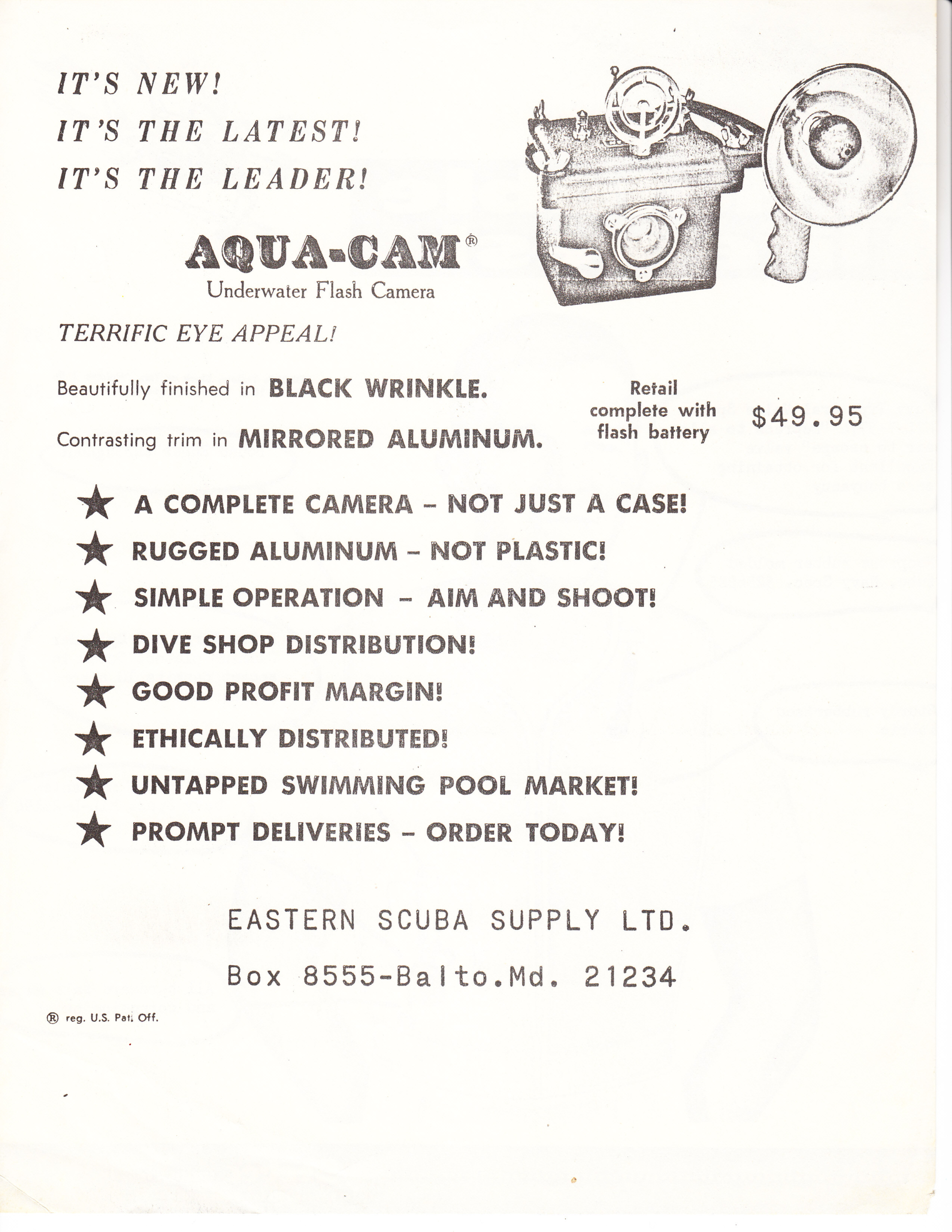 This Aqua Cam camera housing is made of aluminum and comes with a flash. It was compact and very easy to handle under the water. It sold for under 50 dollars. A special thanks to Alec Pierce of Scuba 2000 for a copy of the original advertisement.