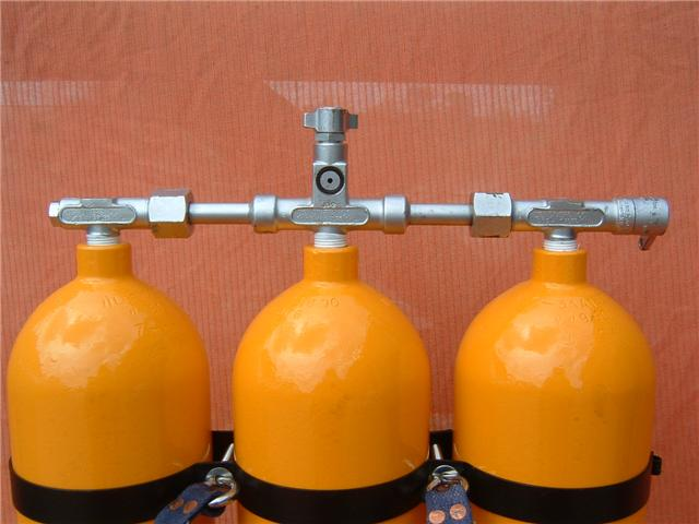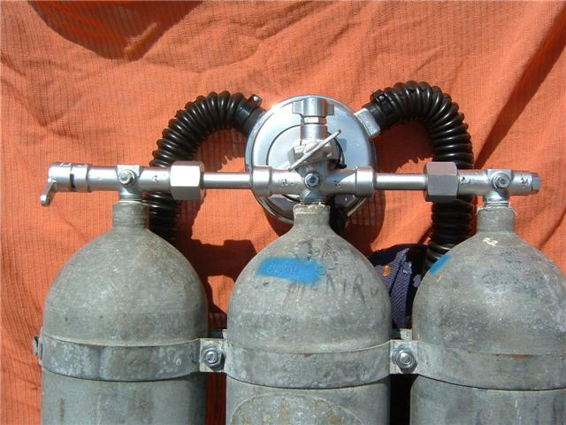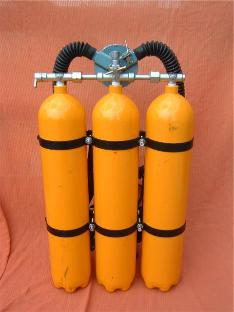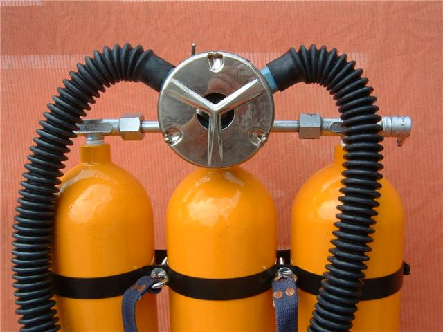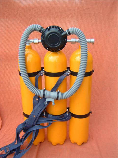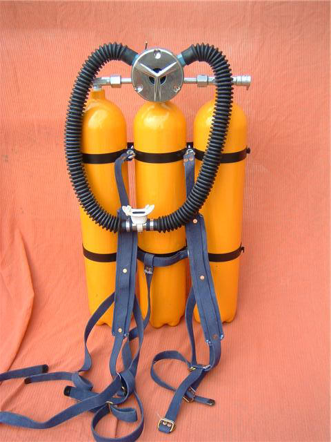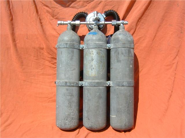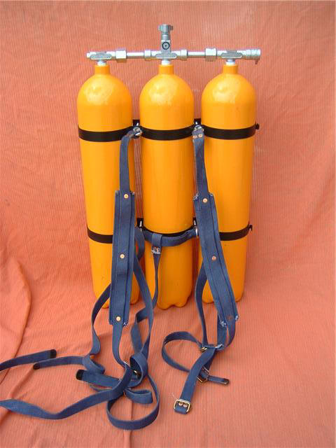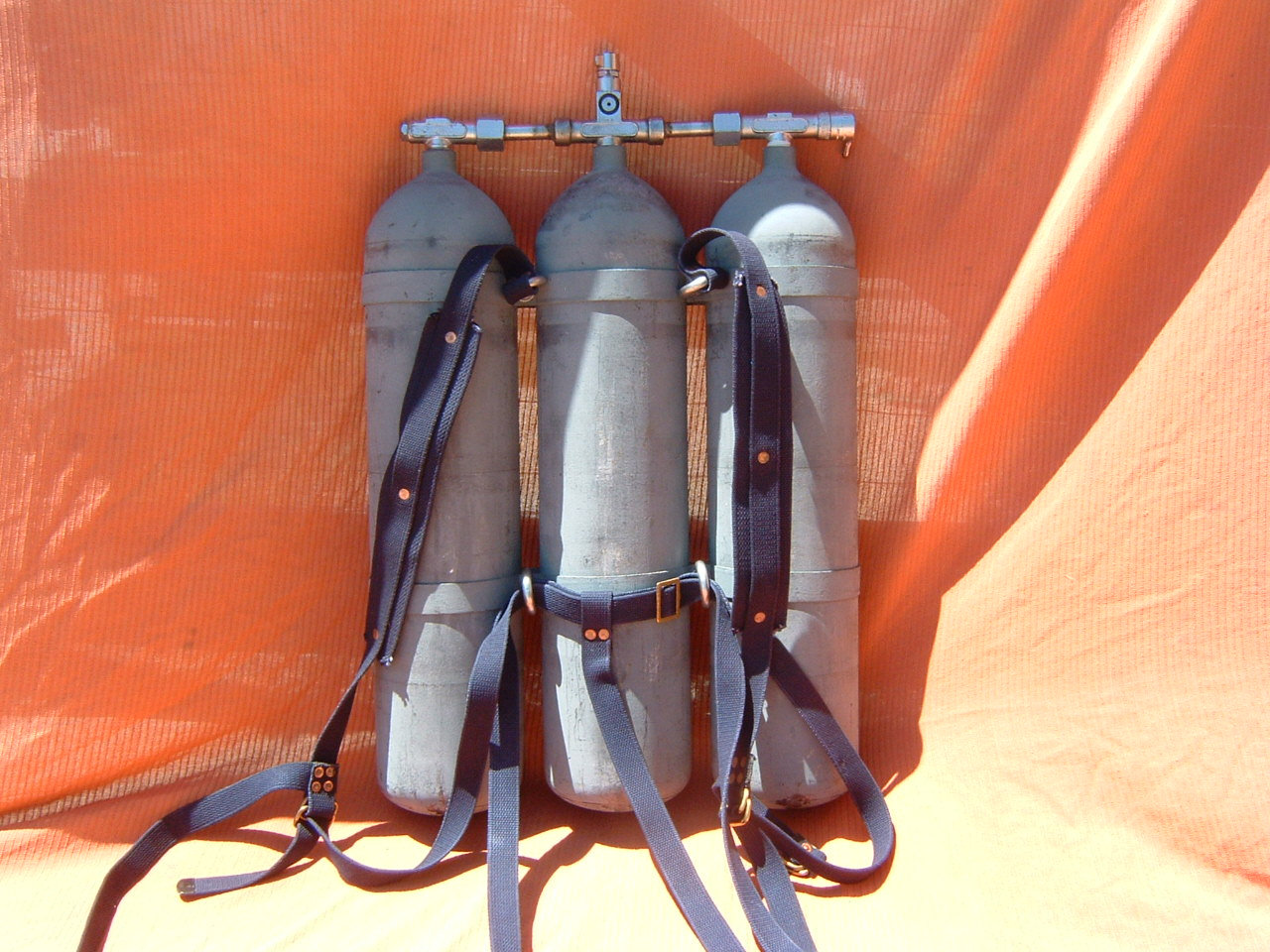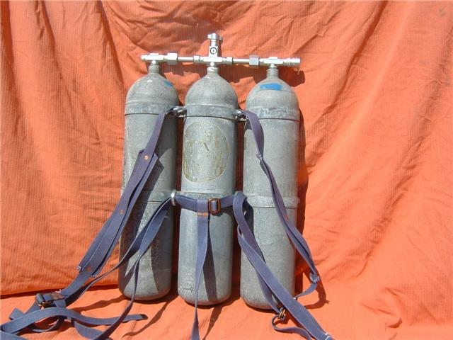 These are perhaps the coolest tanks ever made for mankind. The USD triple 44 CF tanks. When I located these tanks they had not been hydroed since the 60s, but they passed with flying colours. The harness was long gone so a reproduction harness by Allan K. was in order. These are probably my favorite tanks to dive just for the cool factor, but they are surprisingly buoyant for steel tanks. They really look great with my broxton on them.