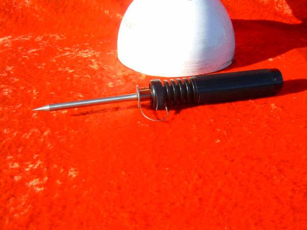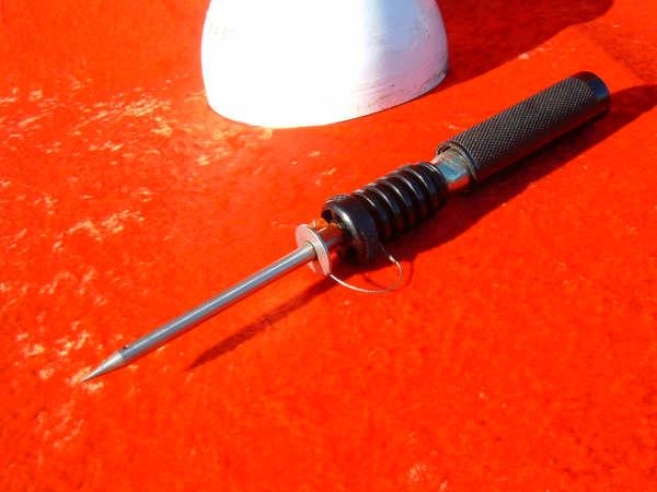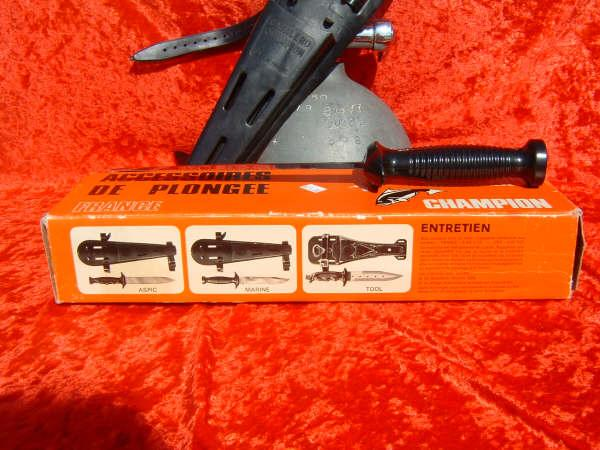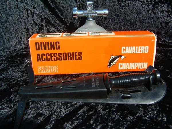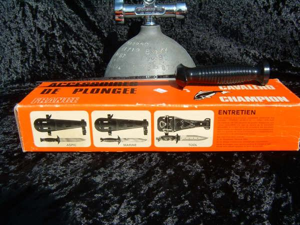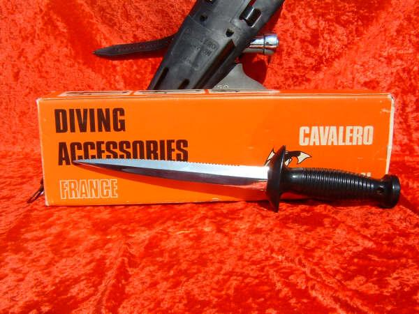 This French made Cavalero Stiletto style knife came to TheScubaMuseum.com NIB (New in Box). The price tag on the box showed retail at the time was only $25.00. This knife was marketed for use by spearos and was used to quickly dispatch speared fish.