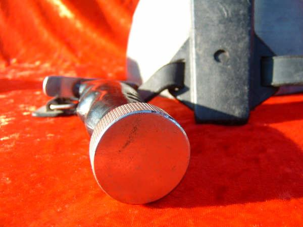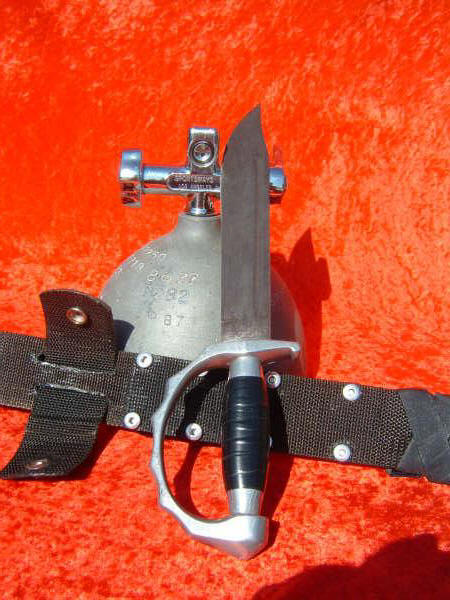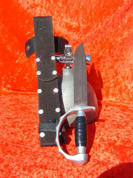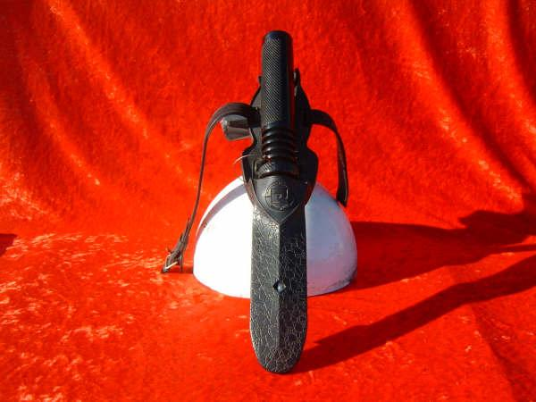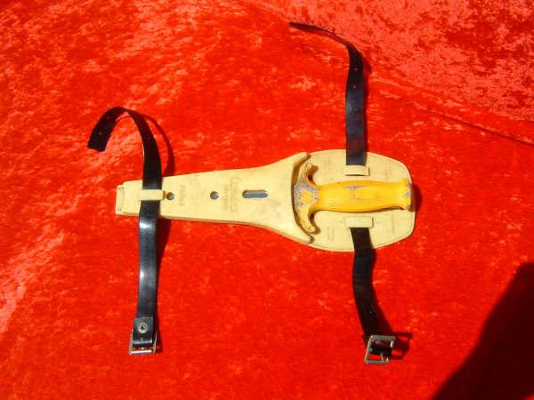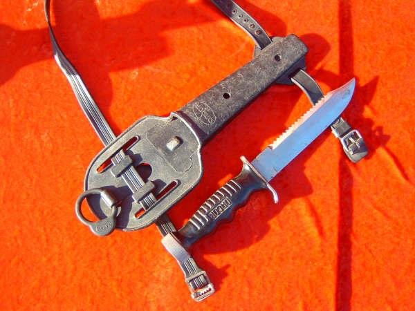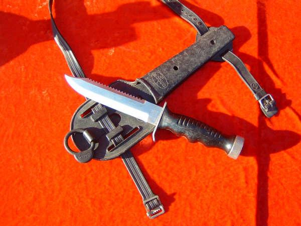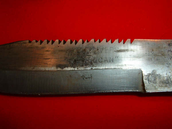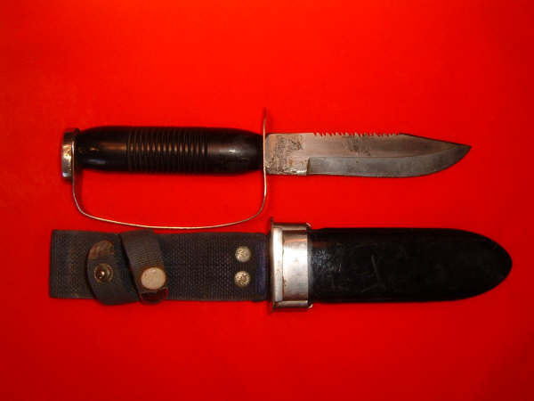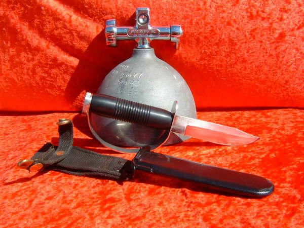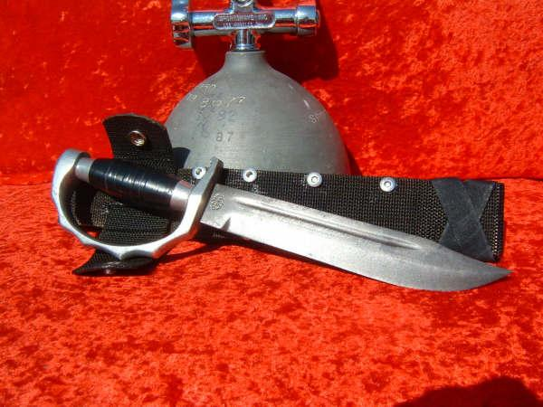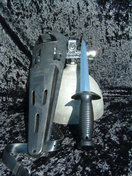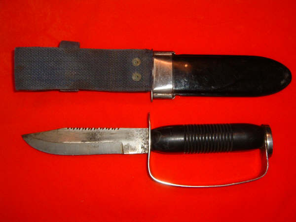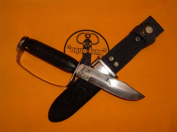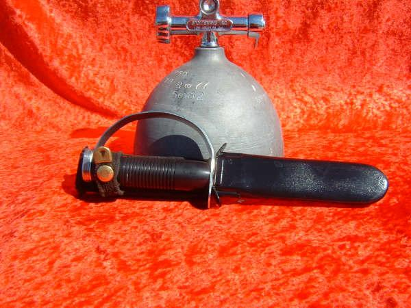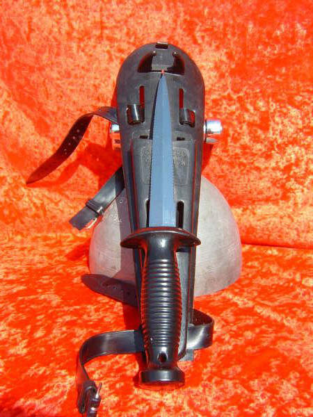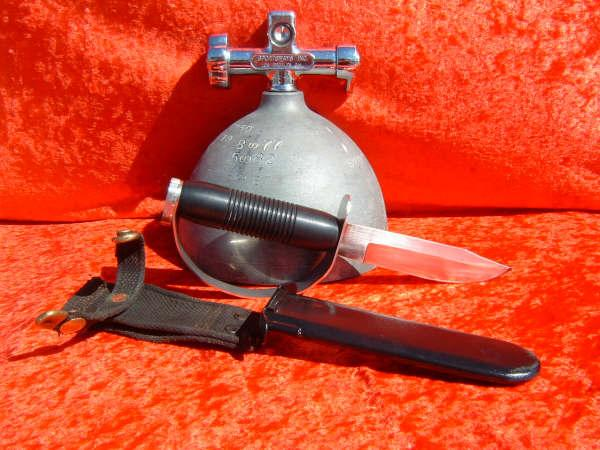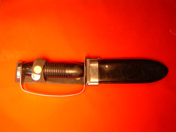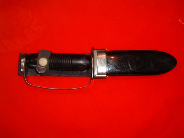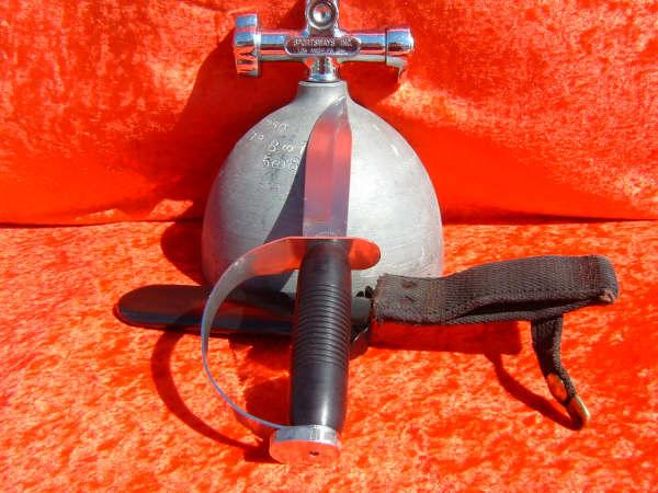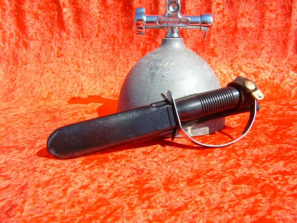 This knife was donated to The Scuba Museum by Dave Thomas of Australia. This knife was not really known to be made of high quality materials, but was made famous in the 1950’s TV series SEAHUNT. Many examples are in very poor condition today and have cracked or shattered sheaths. This example is in very nice shape and is one of my favorites.