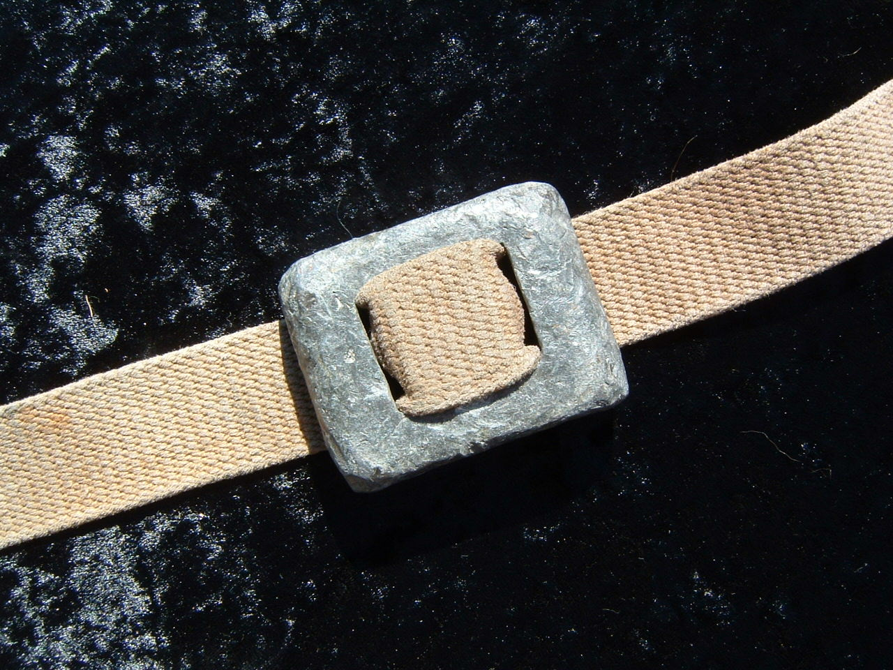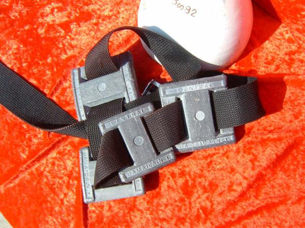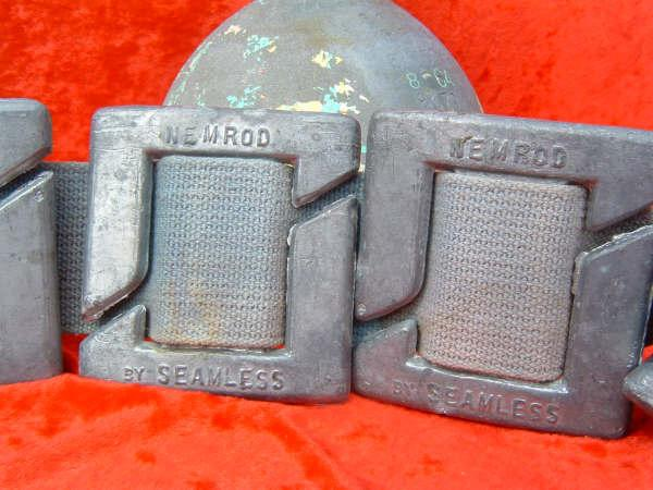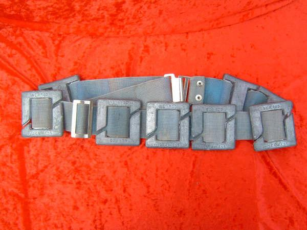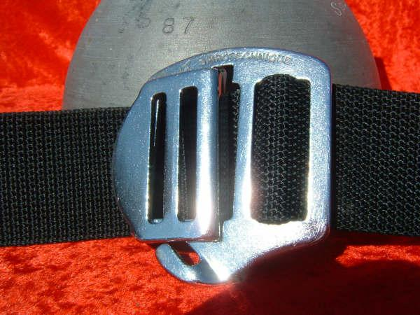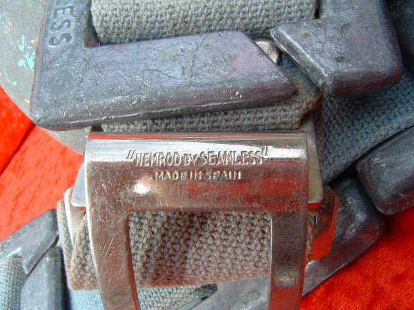 This Nemrod weight belt by Seamless features a quick on off feature for the weights. The weights are individually slotted to allow them to be placed or removed from the belt without having to unstring the buckle. This was a neat feature for the vintage scuba diver, but it only works on belt material that is soft like the original cotton seen here. Modern nylon does not usually work well with this concept I have found.