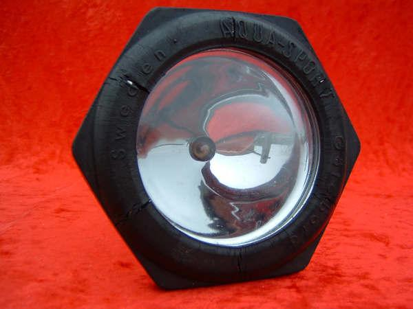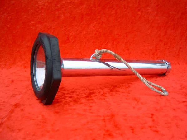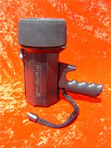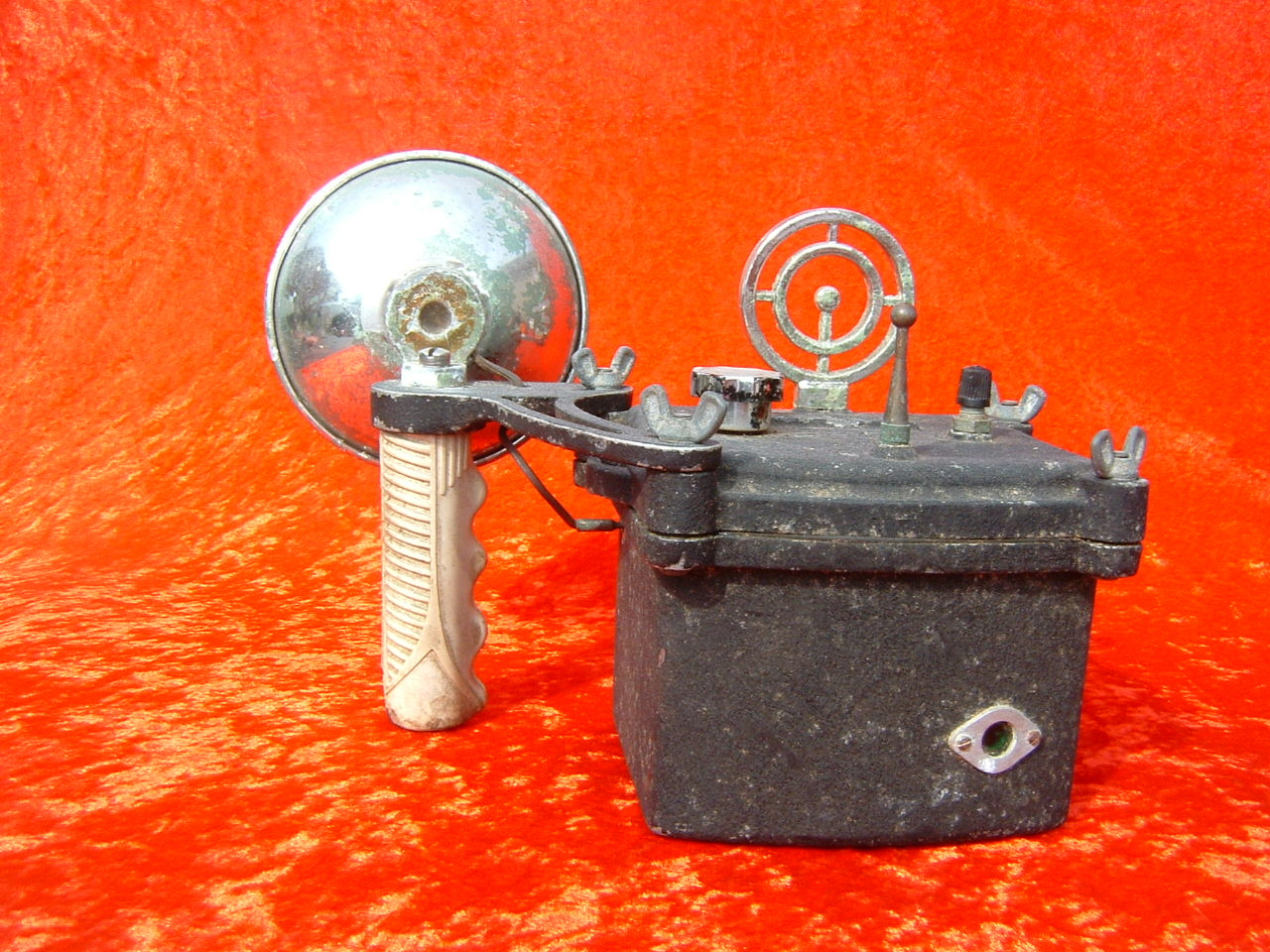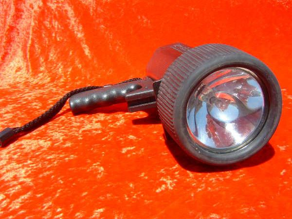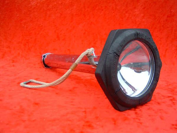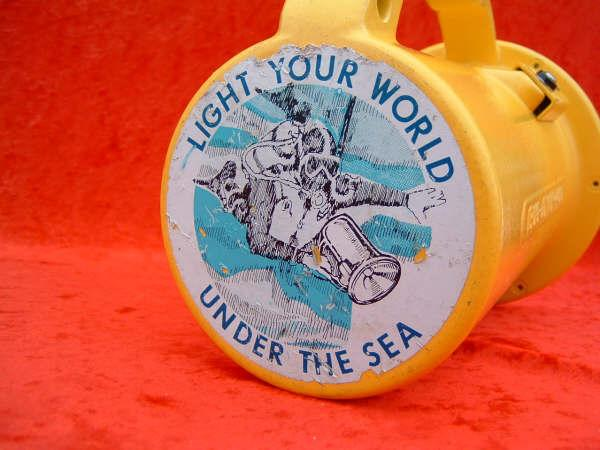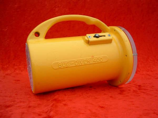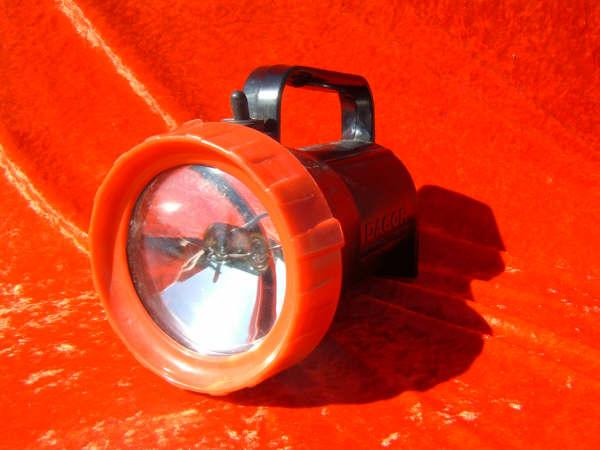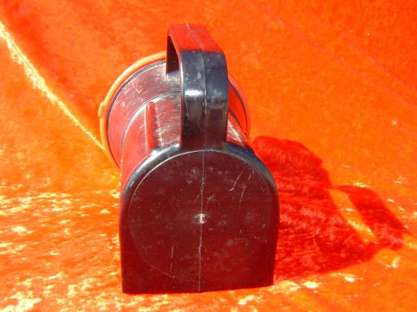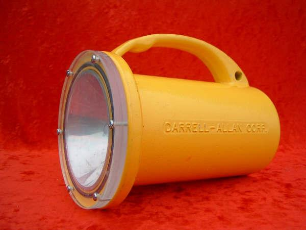 The Darrel Allan bug light is a very heavy duty industrial quality light. The case is cast aluminum. Later models were made of plastic, but this one is the older cooler one. This particular sample is in fantastic condition with most of the decal and paint still intact. This light even works, but really uses a lot of batteries. This particular model is dated 1976 inside.