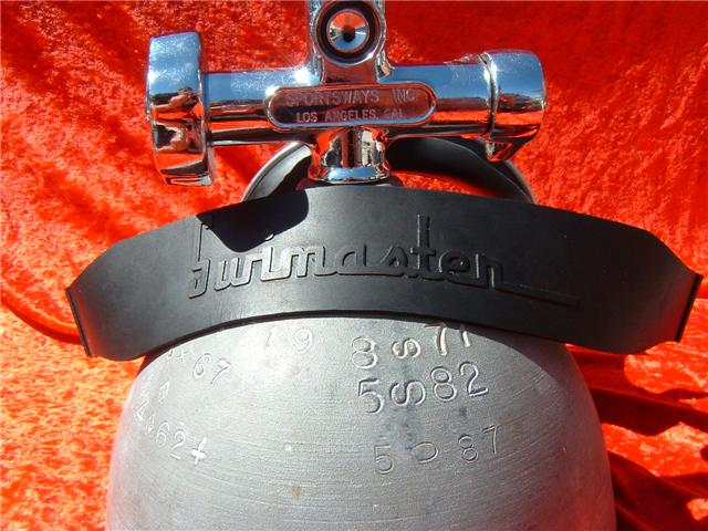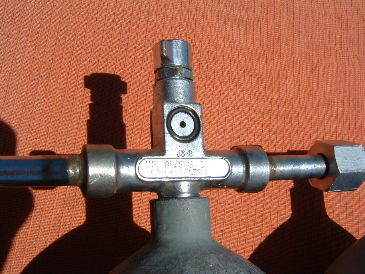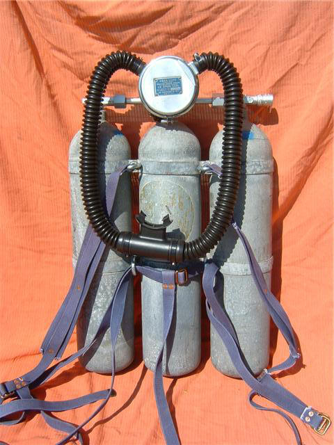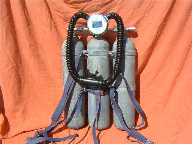 These triples are most likely 1800 PSI fire extinguisher bottles mated to a very nice US Divers triple manifold. They have been painstakingly restored here in Ohio and given a new Allan K harness. The tanks are longer than the Museum’s triple tanks and have dimpled bottoms. These tanks are on loan to the Museum by WWW.vintagedoublehose.com
