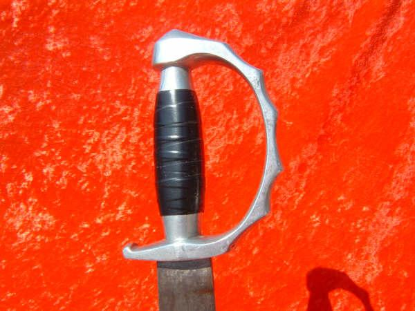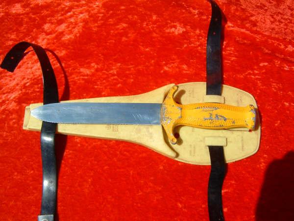 This is a French made Espadon Tarzan knife. It has a yellow metal painted handle.