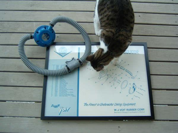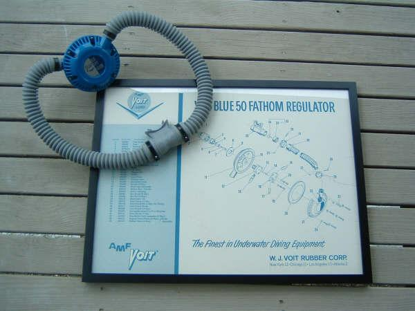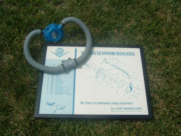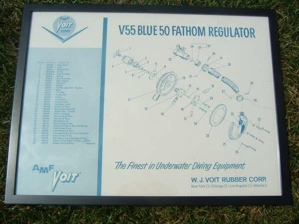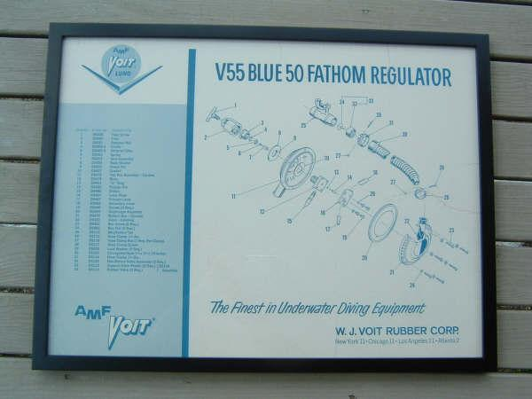 This original exploded diagram of the V55 Blue 50 Fathom regulator was donated to WWW.theSCUBAmuseum.com by Roger VanFrank. This is a very rare an highly sought after poster and is very handsome with the FX 50 Fathom displayed next to it. Bob the cat gave his approval.