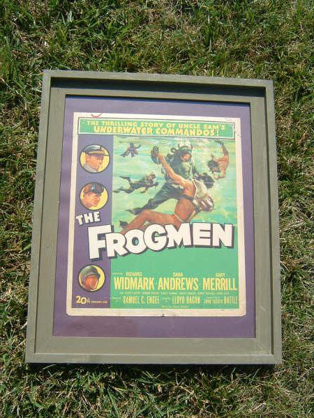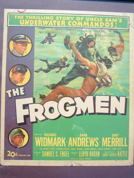 The Frogmen is perhaps one of the coolest vintage scuba movies ever made. Hollywood sacrificed accuracy, but made some great underwater fight scenes. This is a rare window card from a cinema that showed the 1951 film. The US UDT divers used Aqualungs, drysuits, and triple tanks even though the Cousteau Aqualung only existed in France under the control of the Germans. The Japanese divers used rebreathers.