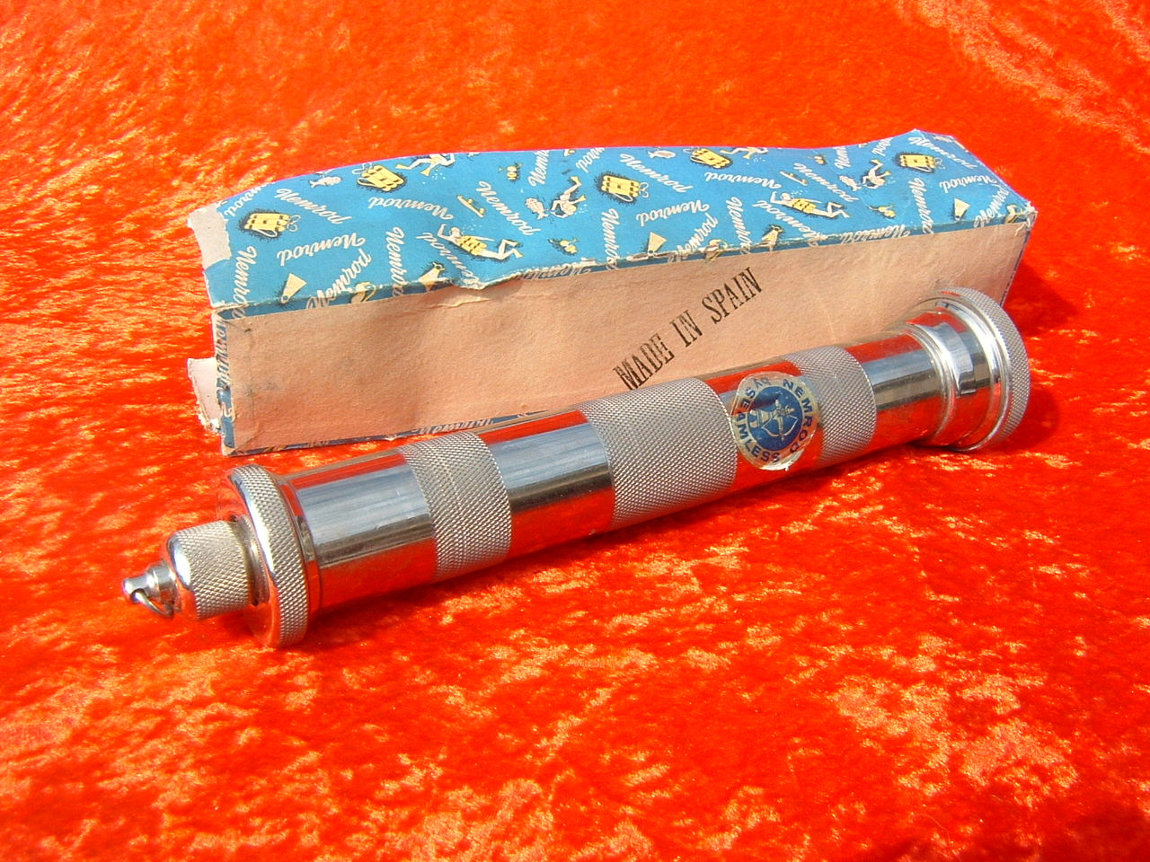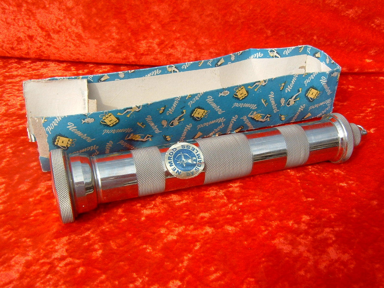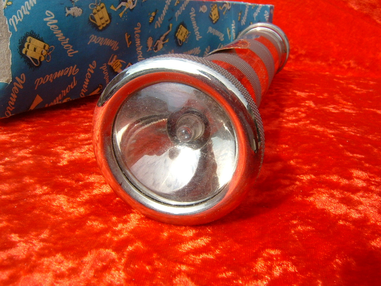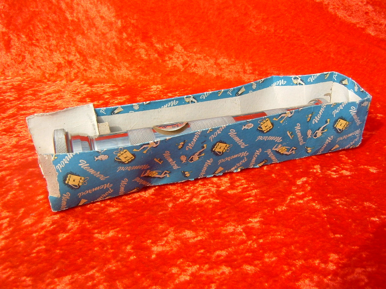 This all metal Nemrod flashlight came to the museum NIB. The box has seen a lot of shelf wear, but has a lot cool graphis. The light is a fine example of Spanish craftsmanship. A special thanks to Enrique in Spain for the catalog page.