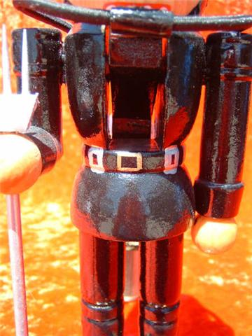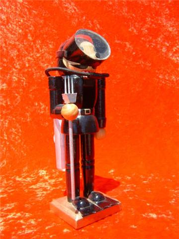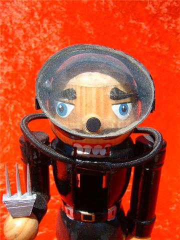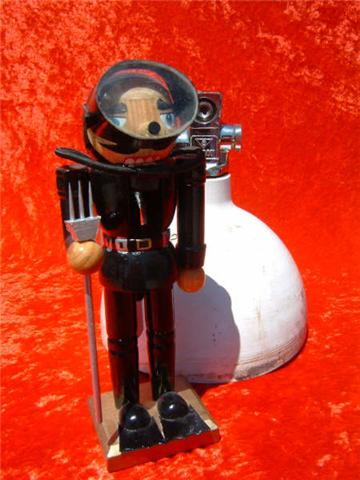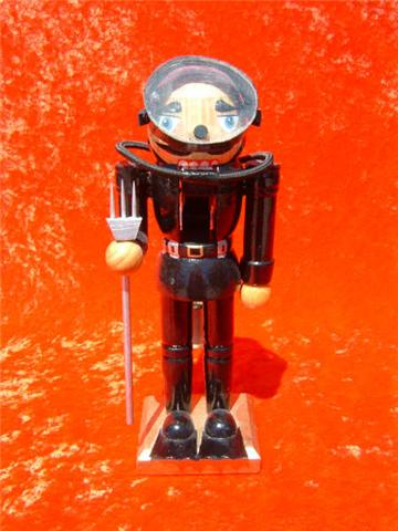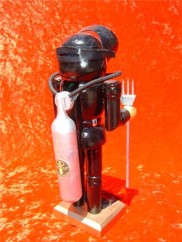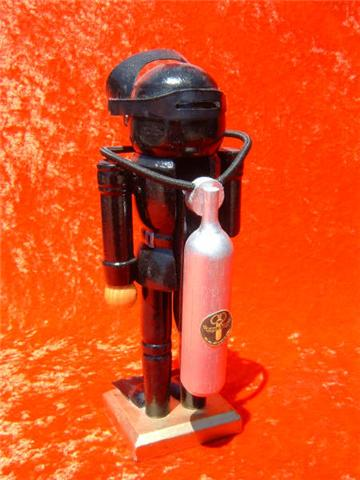 The Scuba Nutcracker was donated to The Scuba Museum by Allan Klauda of Rochester NY. Allan is a craftsman of many talents and this is just one of his many accomplishments. Please note the detail Allan put into this Vintage Scuba Diver AKA Nutcracker. The trident, oval mask with purge, 2 hose regulator, low slung USD tank, and weight belt. The Scuba Nutcracker is seen every year on the fireplace around the holidays.