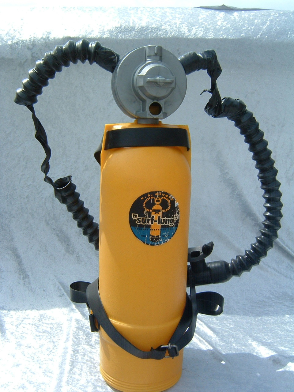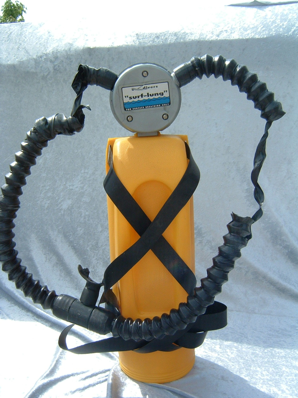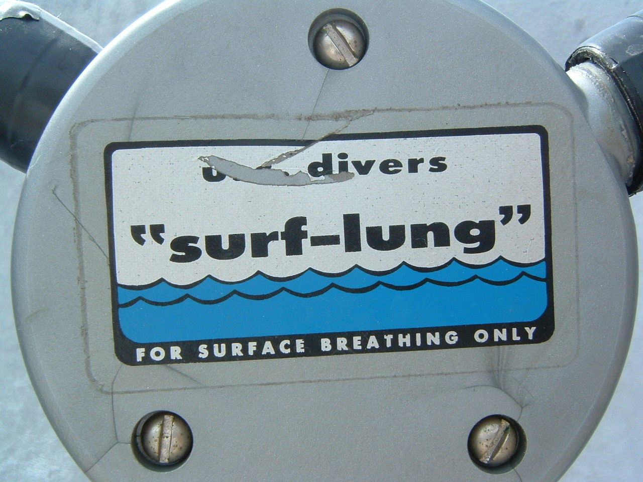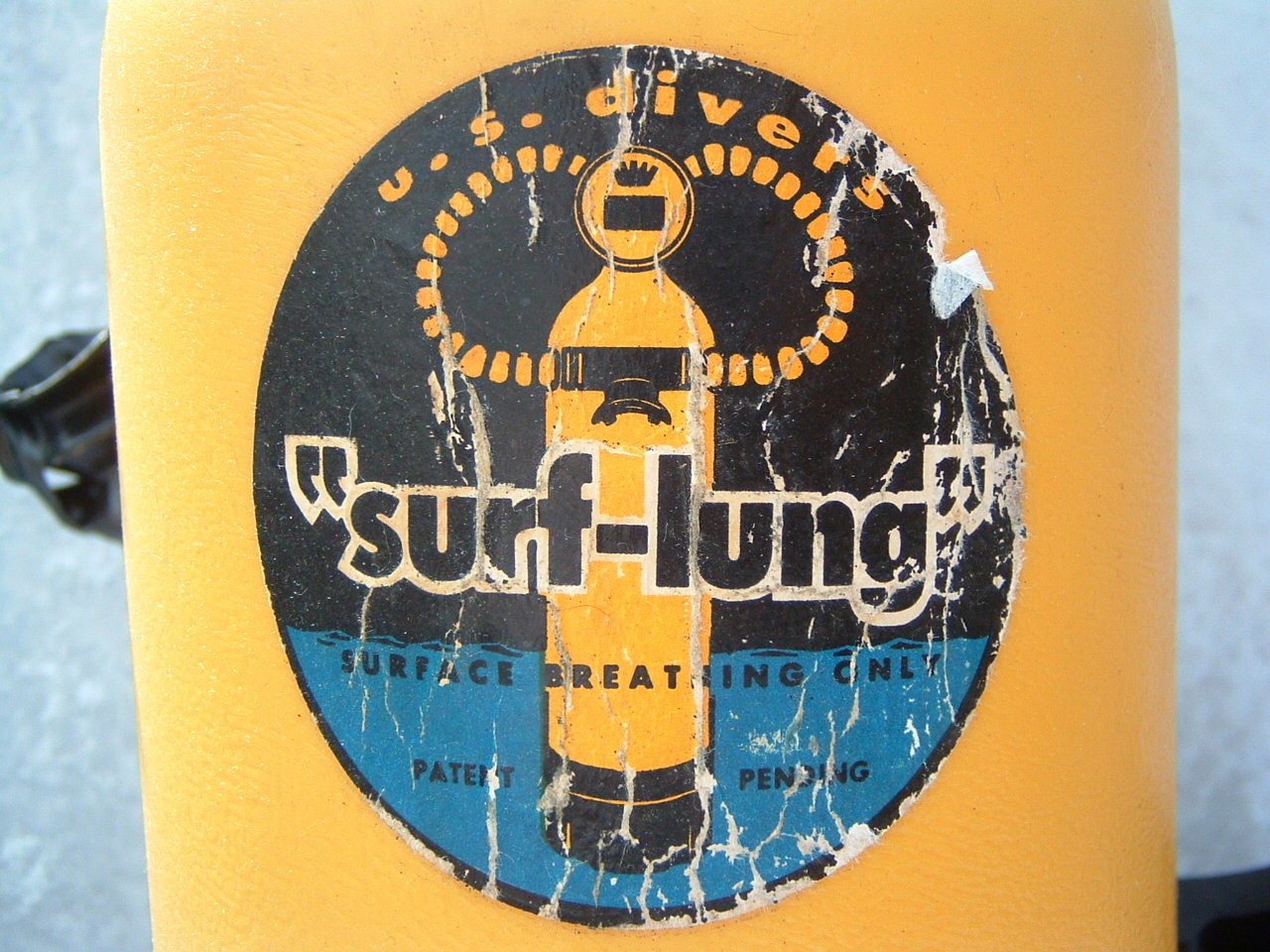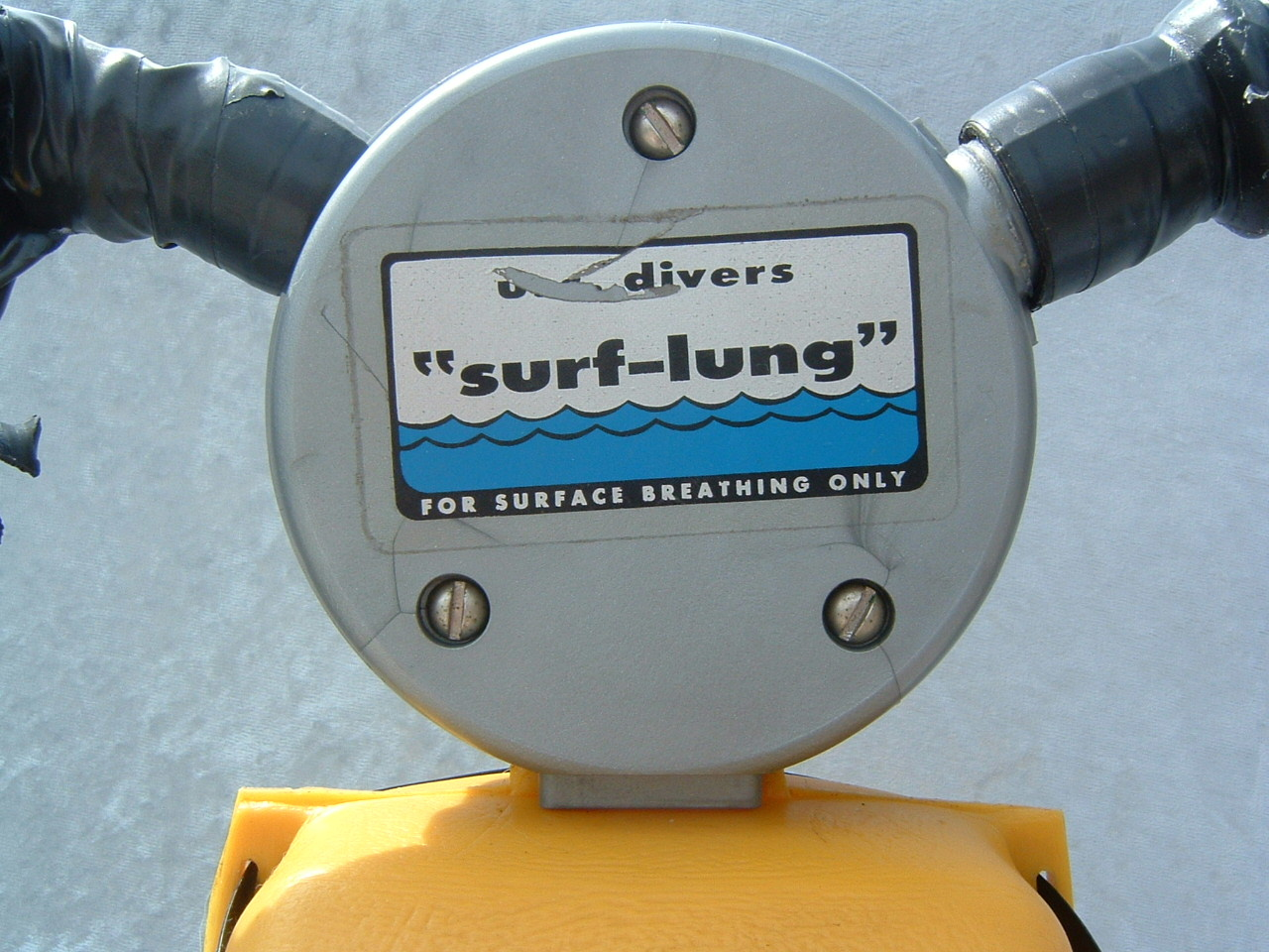 The US Divers Surf Lung was a toy that allowed a child to swim on the surface only while breathing through a double hose snorkel. Any kid that got this toy thought they had the coolest Dad in the world. It is very cool indeed. This one was donated to the Museum by an anonymous benefactor. This one has seen a lot of play and the hoses are in very sad shape, but it is still very neat.