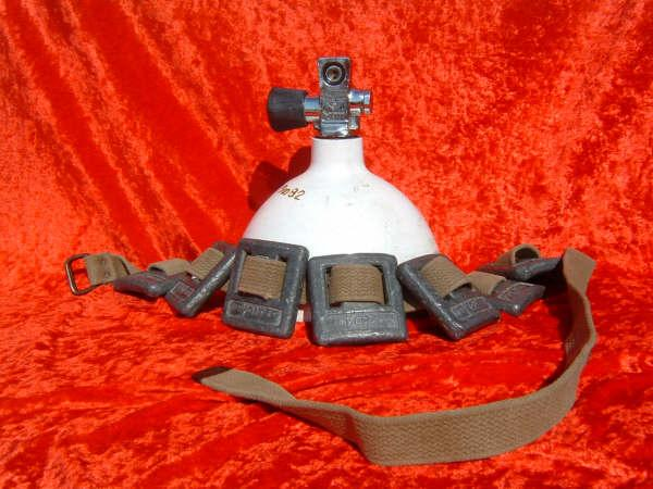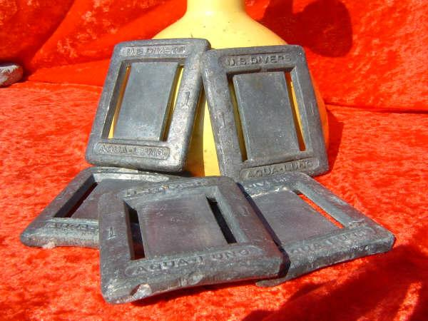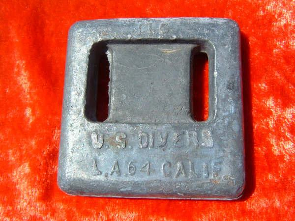 This is a one pound US Divers weight used on a 1 inch cotton weight belt. They are somewhat rare today. This one was donated to the museum by an anonymous benefactor. I am actively searching for more to complete the display.