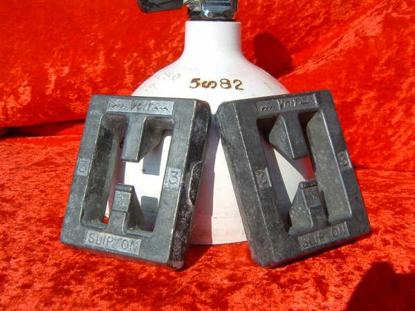 These are really cool vintage scuba Voit 3 pound weights. They are “Slip on” meaning you can put them on or take them off a weight belt without having to unthread the buckle or remove a weight in front of this one. These are in great shape and I really like them.