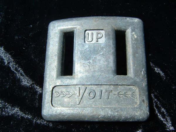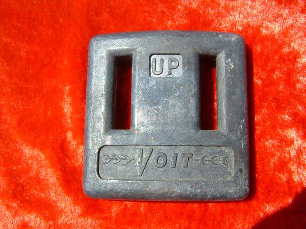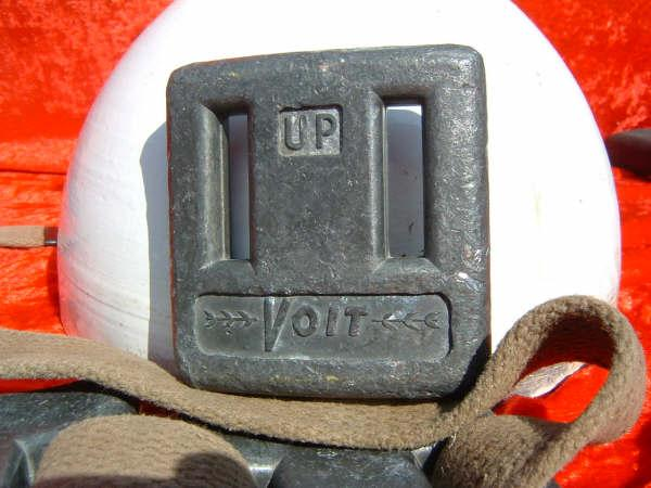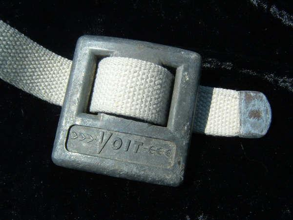 This is a Voit one pound weight intended to be used on a one inch cotton webbing belt. This one is in fantastic shape and was donated to the Scuba Museum by an anonymous benefactor. The Museum is actively seeking more weights like these to complete the display.