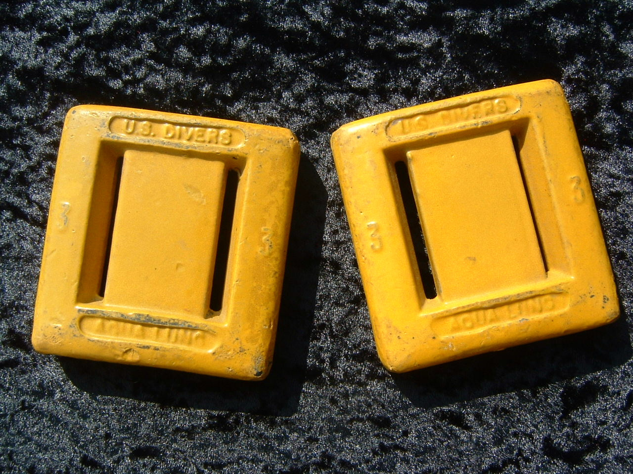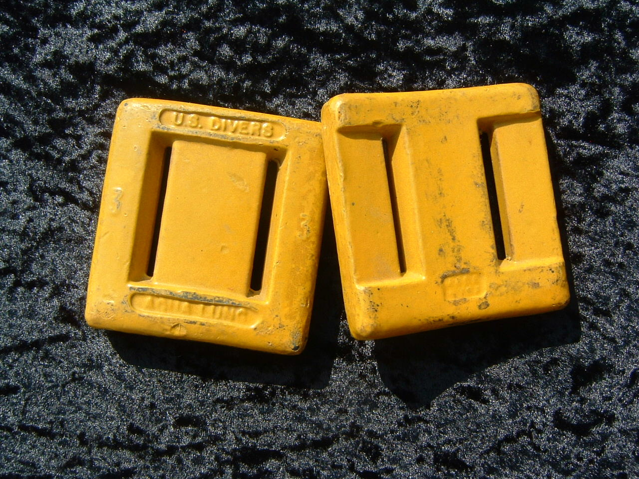 These 3 pound US Divers weights are plastic coated in a bright yellow and are probably from the late 70’s.