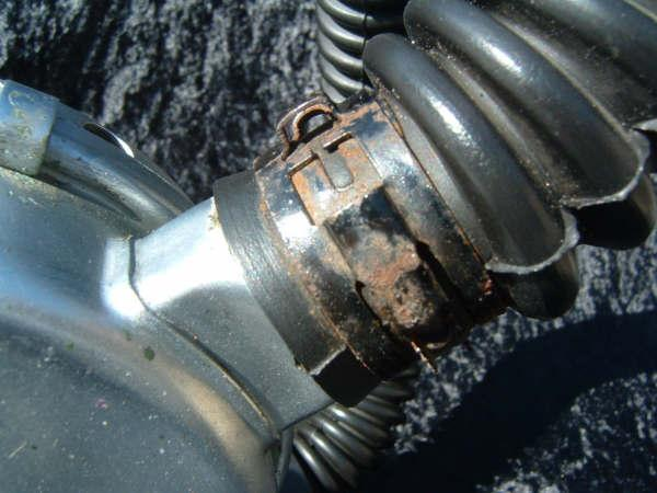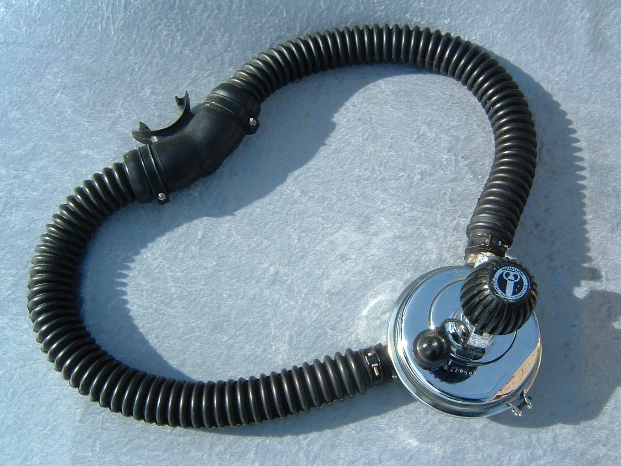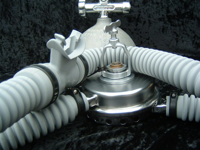 The 1950s US Divers Over Pressure originally came with a small tube going down the supply side hose to the metal mouthpiece.  It is very rare to see one complete today.  The little hose became more brittle more quickly than did the original corrugated hoses.  Most models were retrofitted with a three piece hose assembly like what you see on mine.  This regulator does not seem to be as collectible as many other USD models but I find it very aesthetically pleasing with the shiny chrome front can and satin rear can.  It is also interesting to note that this was probably the last USD model made that used the separate screwed on exhaust housing for the duckbill like the Broxton.  Later models made by USD like the Stream Air did away with this trait probably for ease of manufacture.