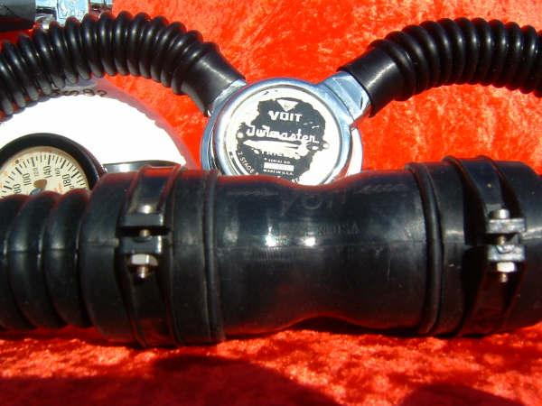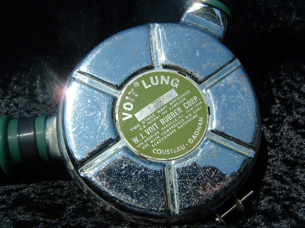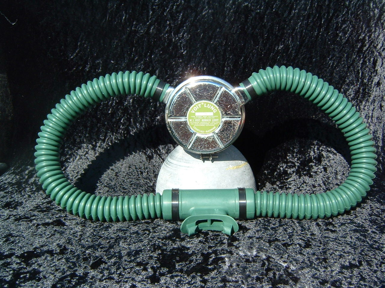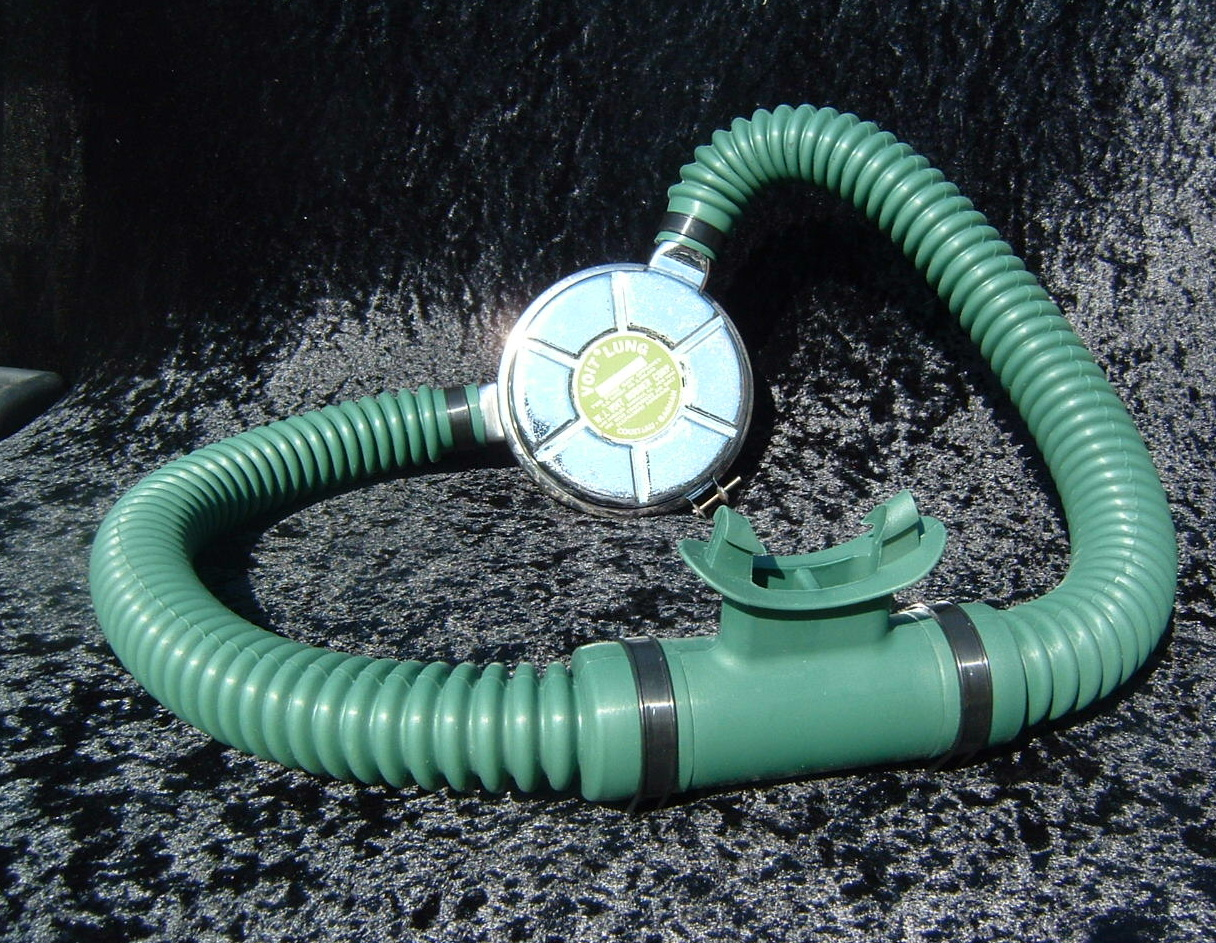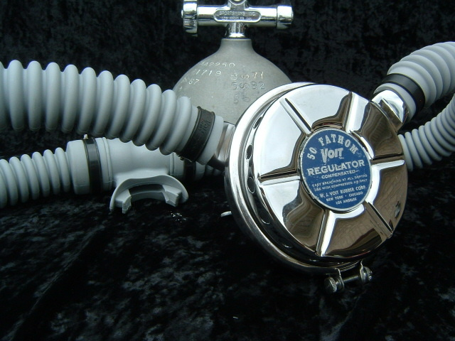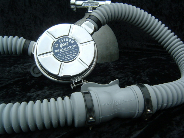 This VOIT lung is the over pressure version.  It came to me with perished hoses and mouthpiece.  I have since replaced them with new reproduction silicone.  I also did not use the tinnerman clamps as they are not conducive to diving in salt water, removal for inspection and cleaning, or hose durability.  I dive almost all of my regulators so the tinnerman clamp must go.  This regulator was rebuilt by Bryan of www.vintagedoublehose.com and it breathes like a champ.  I used this regulator on many dives in Silver Springs during the 50th anniversary  of SEA HUNT.  With these green hoses and mouthpiece it really stands out.