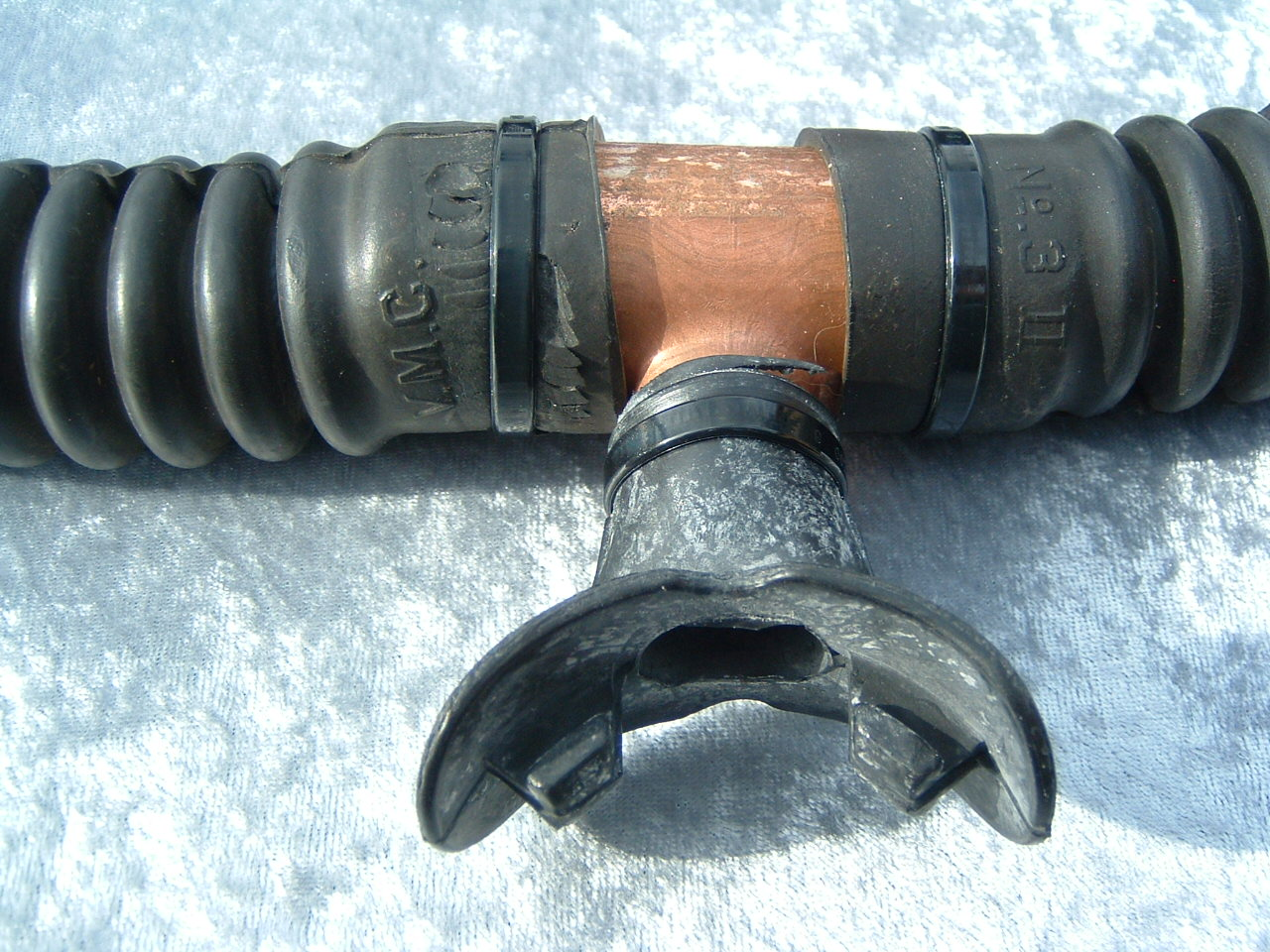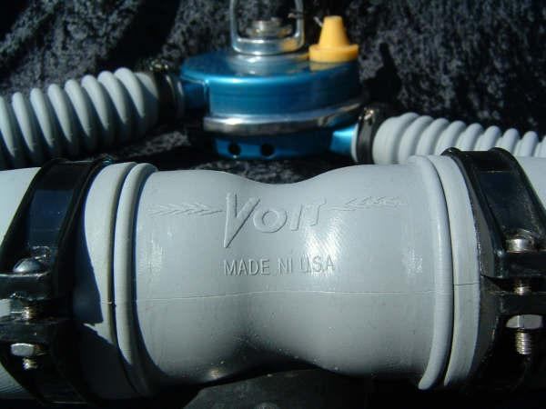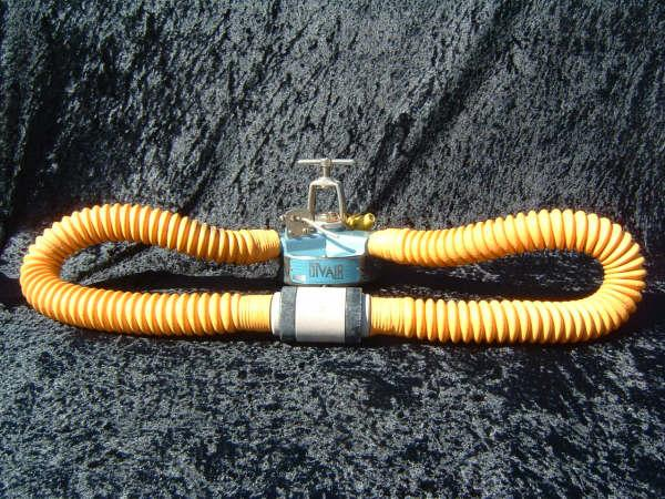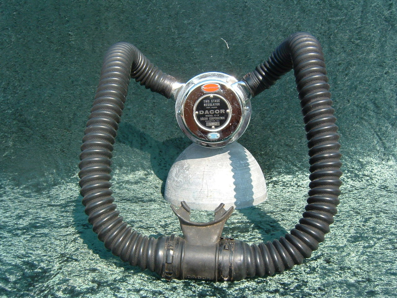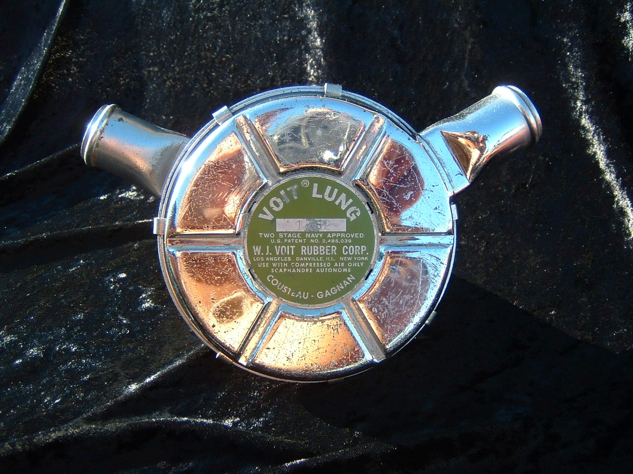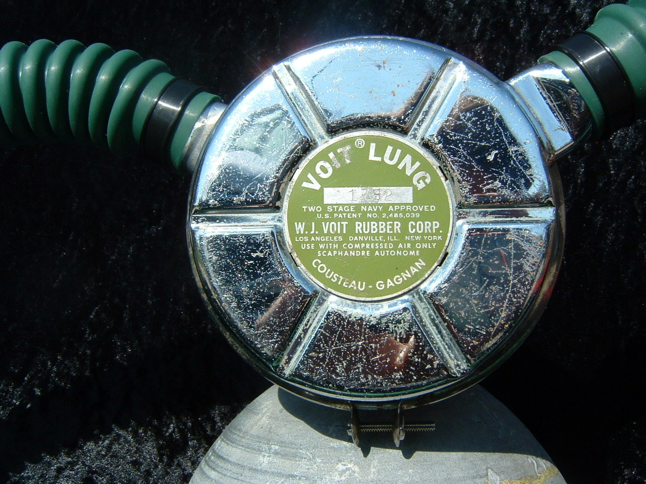 This VOIT lung is the over pressure version.  It came to me with perished hoses and mouthpiece.  I have since replaced them with new reproduction silicone.  I also did not use the tinnerman clamps as they are not conducive to diving in salt water, removal for inspection and cleaning, or hose durability.  I dive almost all of my regulators so the tinnerman clamp must go.  This regulator was rebuilt by Bryan of www.vintagedoublehose.com and it breathes like a champ.  I used this regulator on many dives in Silver Springs during the 50th anniversary  of SEA HUNT.  With these green hoses and mouthpiece it really stands out.