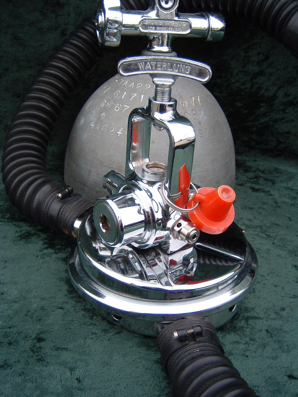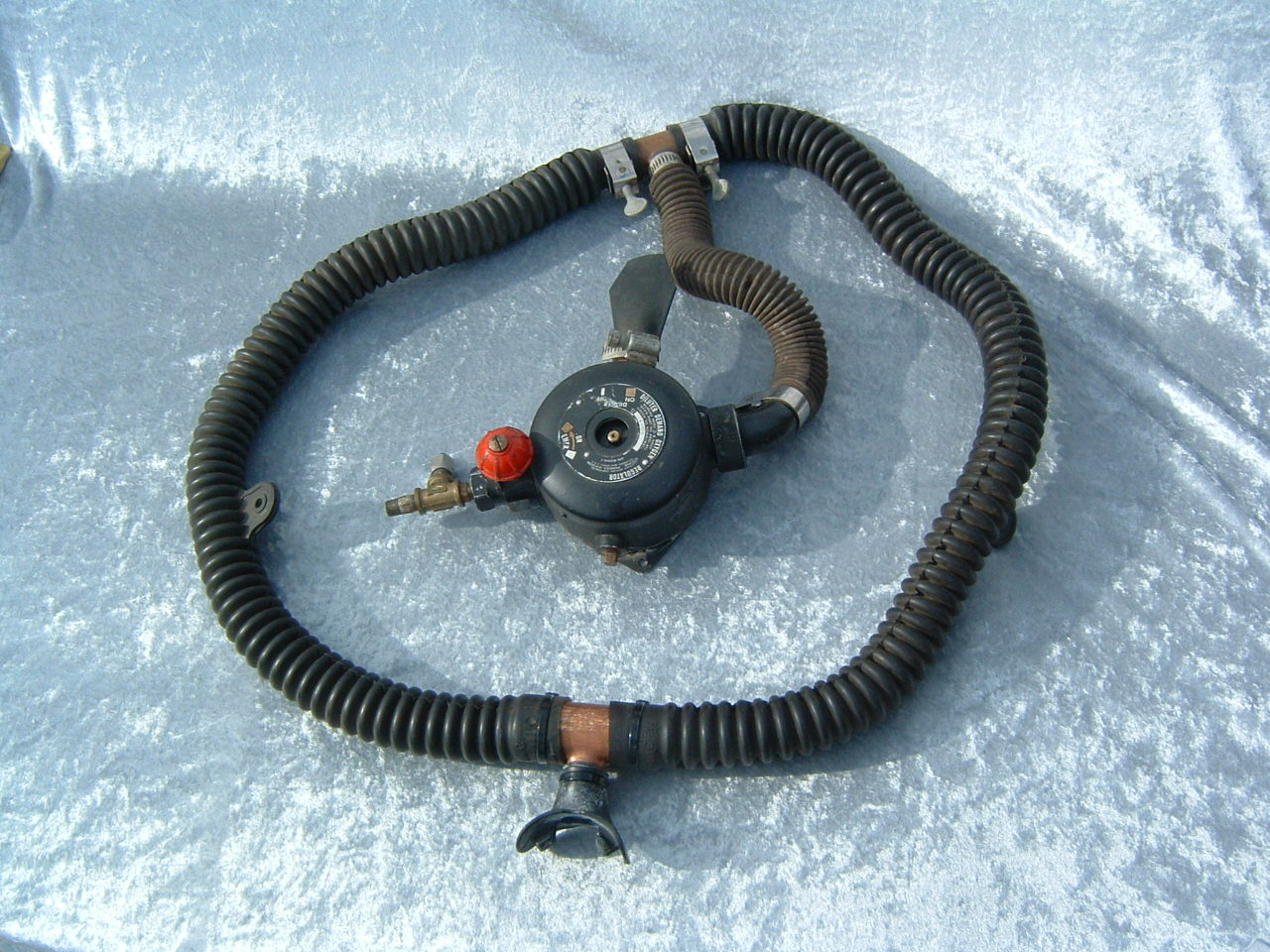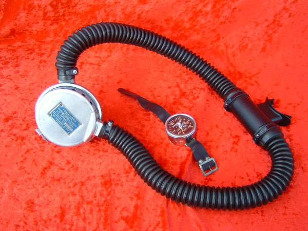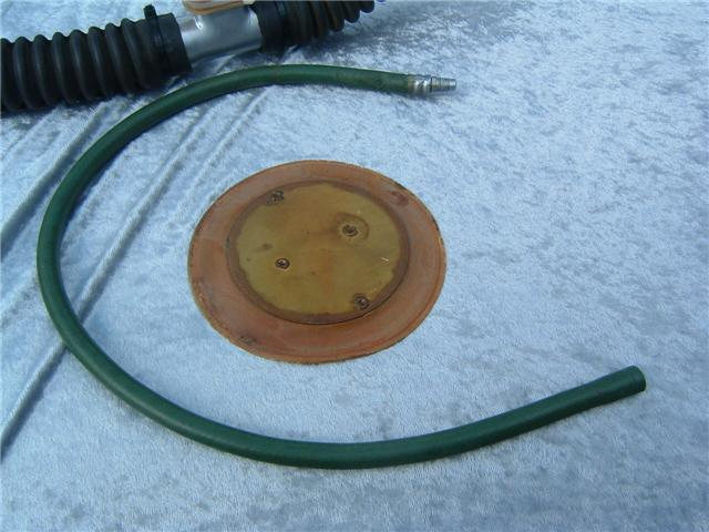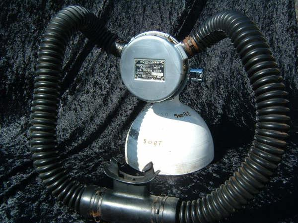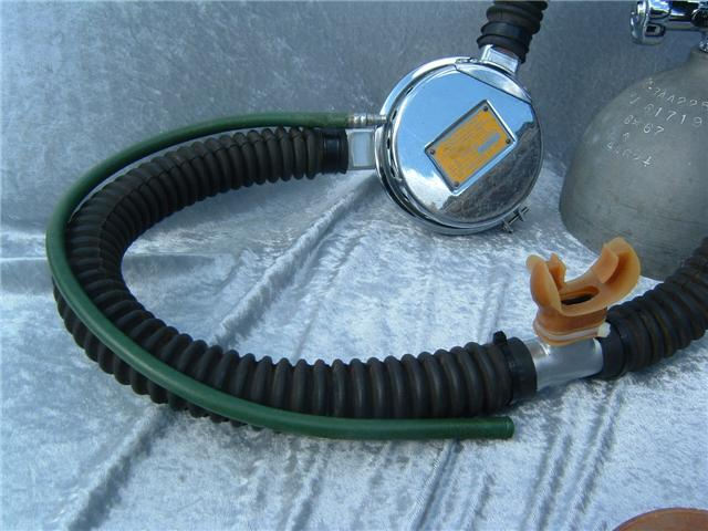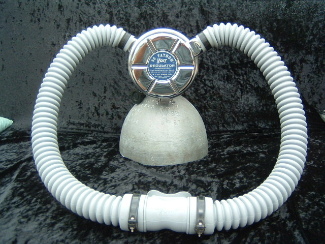 This is the Overpressure completely restored and rebuilt by Vintage double Hose.  This regulator cannot be over breathed and in fact darn near will give you an over expansion injury in the garage!  After having it restored I can see why it did not last in it’s original configuration long with most divers.  Also included in these pictures are the original riveted diaphragm, now quite crunchy, and the original green supply hose.  The original US Divers marked corrugated hoses are still in great shape even after all these years. This regulator was a favorite of Poppy Lungmeister acording to Bryan of VDH!