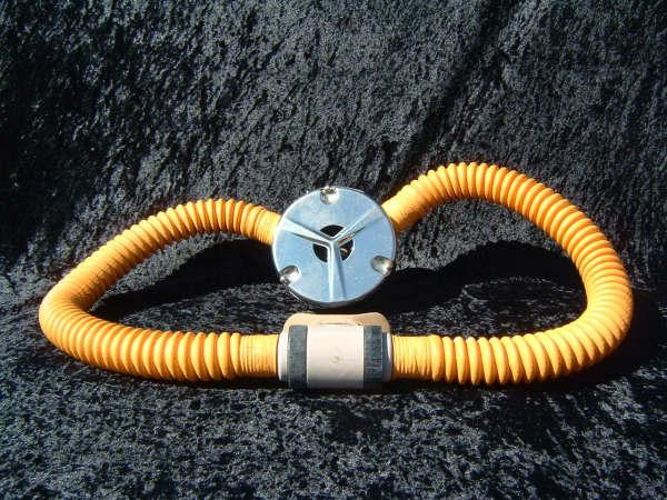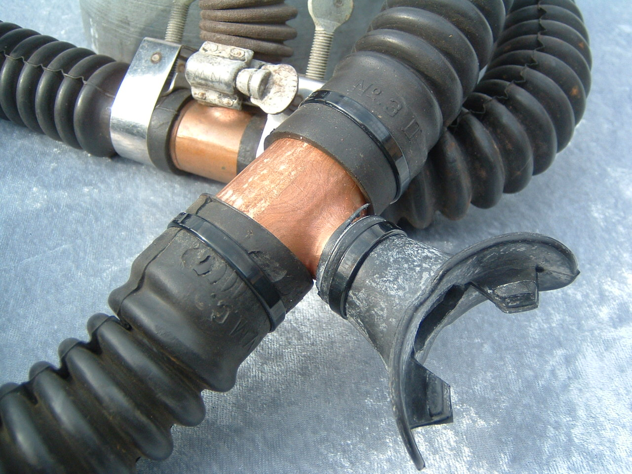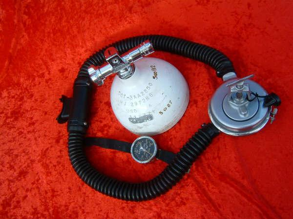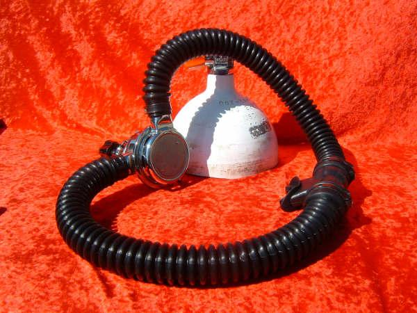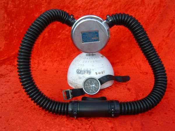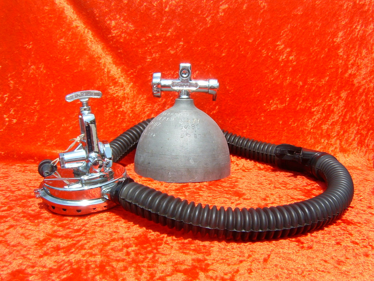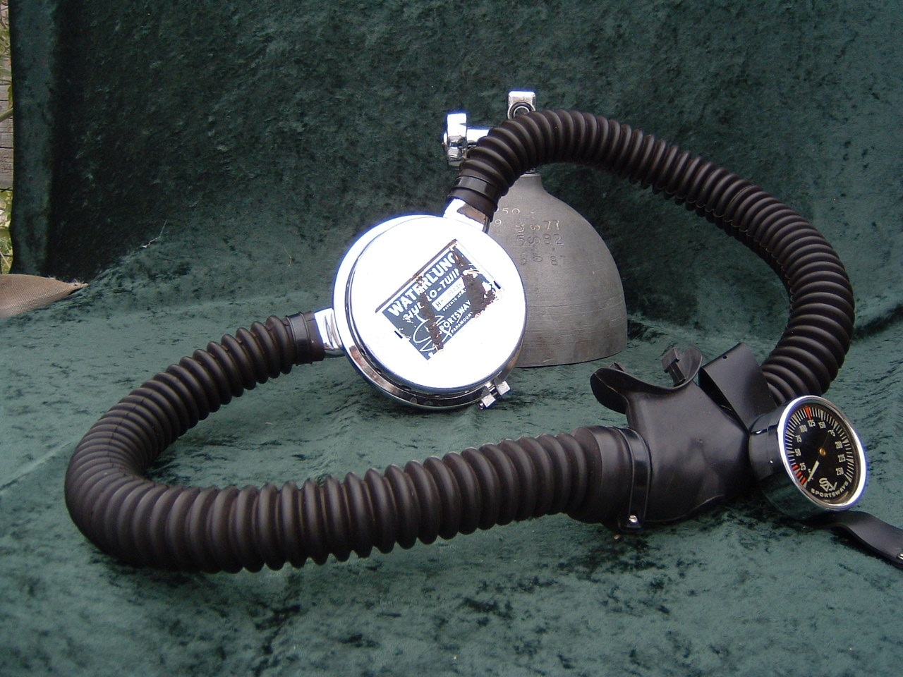 This is the Overpressure completely restored and rebuilt by Vintage double Hose.  This regulator cannot be over breathed and in fact darn near will give you an over expansion injury in the garage!  After having it restored I can see why it did not last in it’s original configuration long with most divers.  Also included in these pictures are the original riveted diaphragm, now quite crunchy, and the original green supply hose.  The original US Divers marked corrugated hoses are still in great shape even after all these years. This regulator was a favorite of Poppy Lungmeister acording to Bryan of VDH!