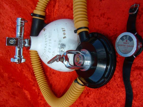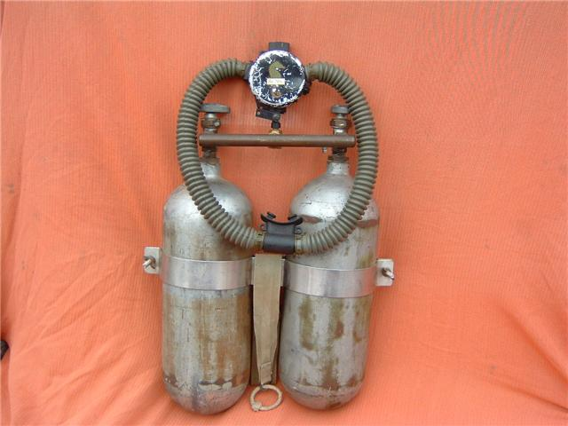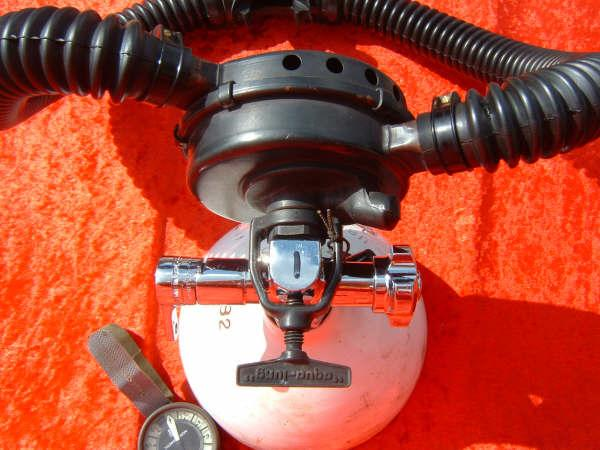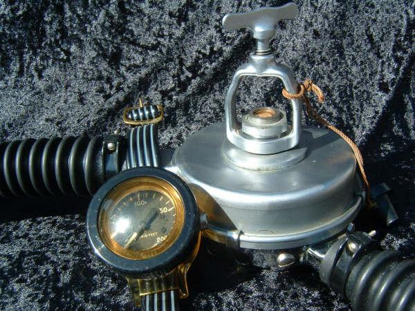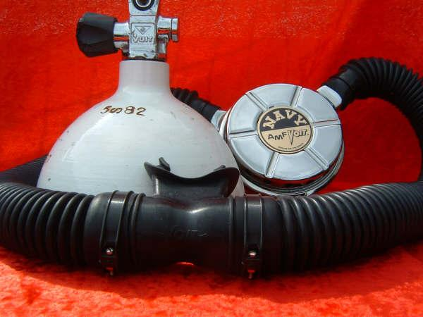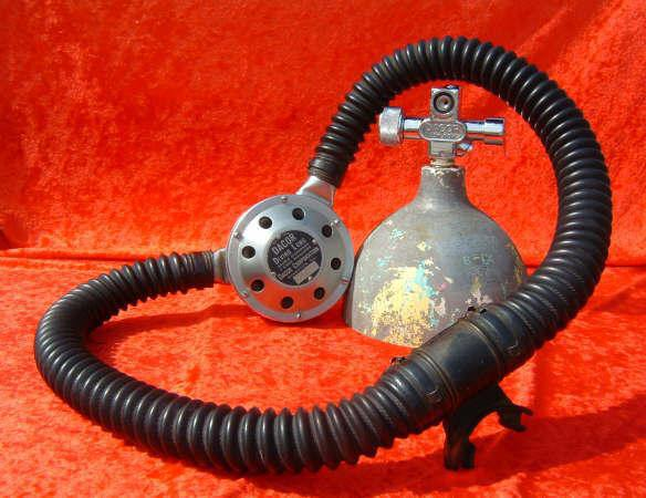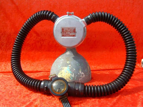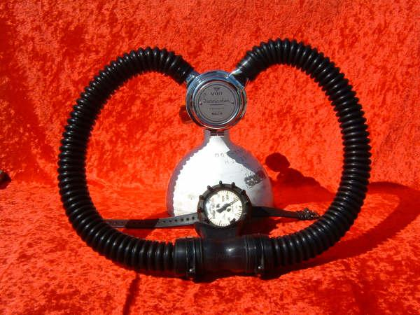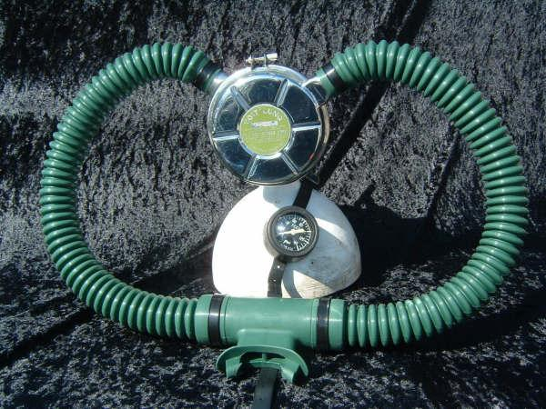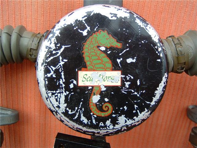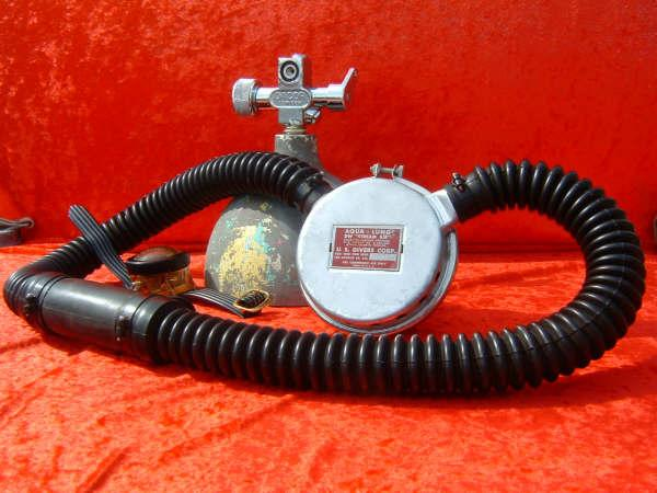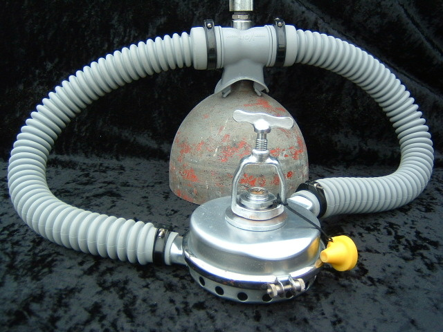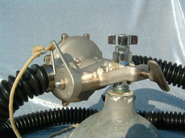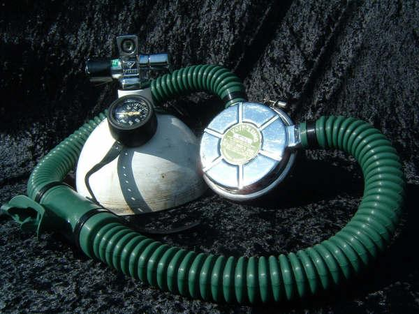 This Seahorse regulator and tank combo dates from the 50s.  It is very similar to some of the homemade rigs made by early divers using Oxygen diluter regulators from WWII aircraft.  This diving setup was sold out of Pittsburgh Pa. in the 1950s and was not very elegant.  The tanks on this specimen were last hydroed in 1967.  The company apparently took the surplus oxygen regulator and waterproofed the diaphragm, added a Seahorse logo and mounted it to a solid manifold and sold it as a diving rig.  I do not know anyone personally that has dived one of these, but perhaps with the aid of some friends and a new harness from the Allan custom harness works I will some day.