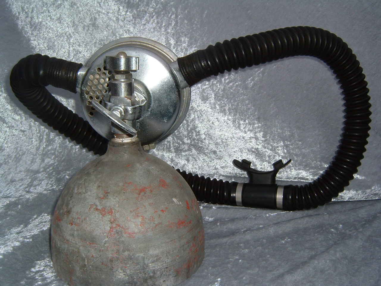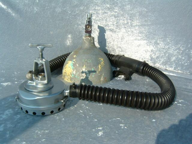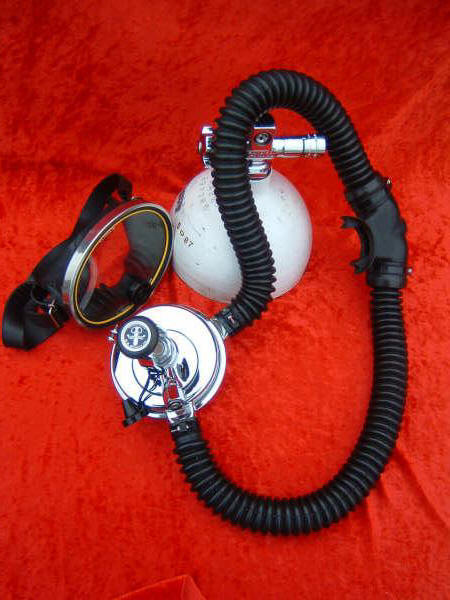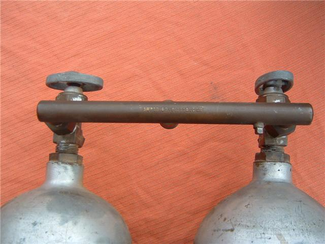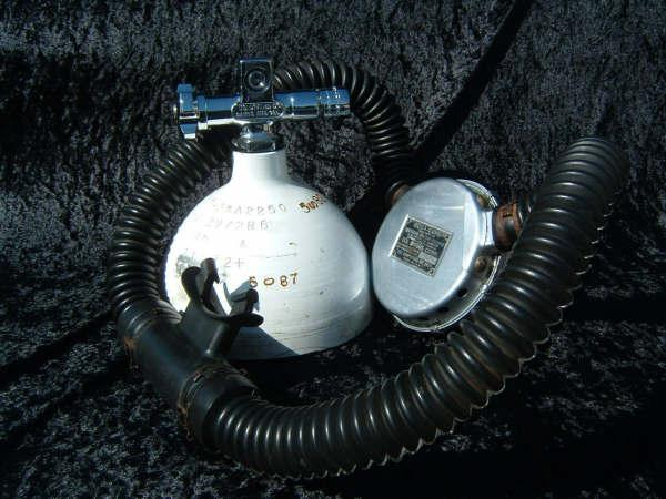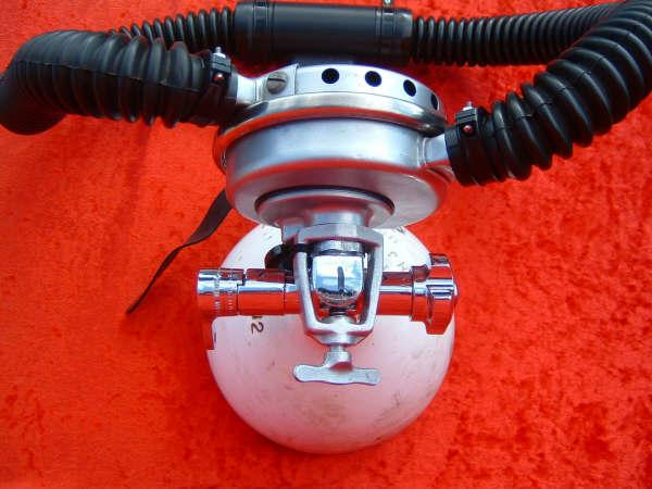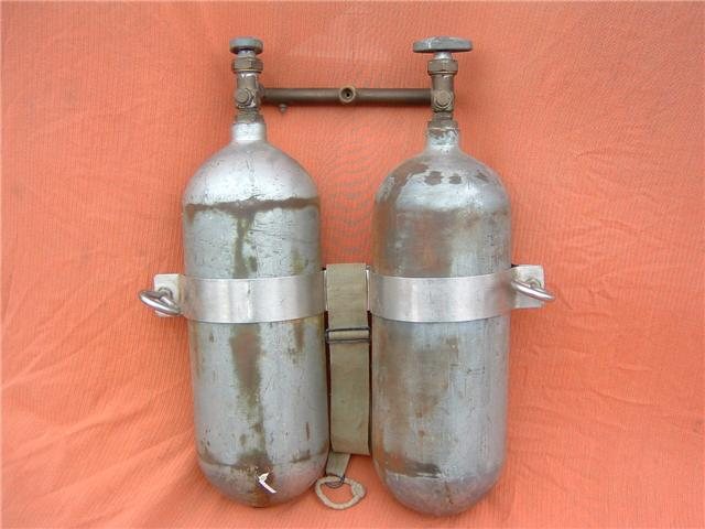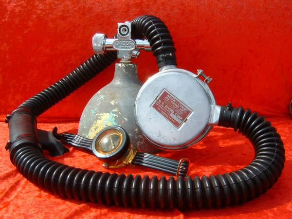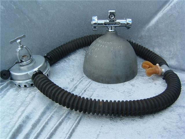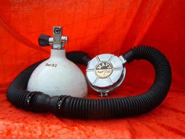 This Seahorse regulator and tank combo dates from the 50s.  It is very similar to some of the homemade rigs made by early divers using Oxygen diluter regulators from WWII aircraft.  This diving setup was sold out of Pittsburgh Pa. in the 1950s and was not very elegant.  The tanks on this specimen were last hydroed in 1967.  The company apparently took the surplus oxygen regulator and waterproofed the diaphragm, added a Seahorse logo and mounted it to a solid manifold and sold it as a diving rig.  I do not know anyone personally that has dived one of these, but perhaps with the aid of some friends and a new harness from the Allan custom harness works I will some day.