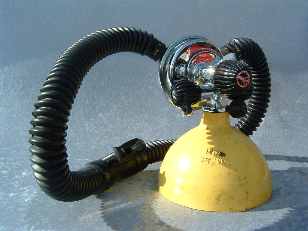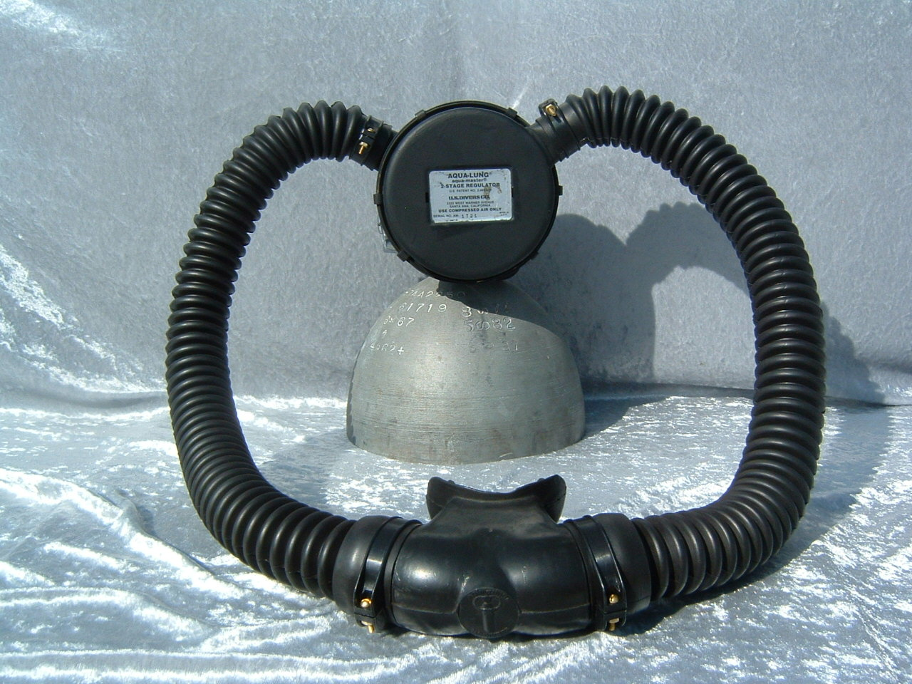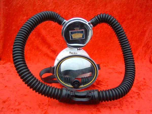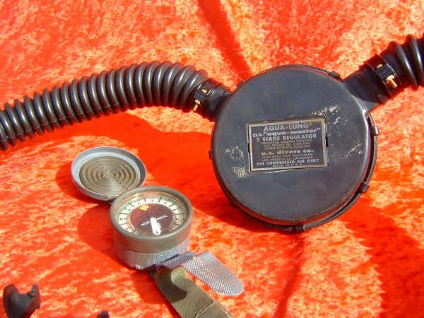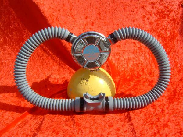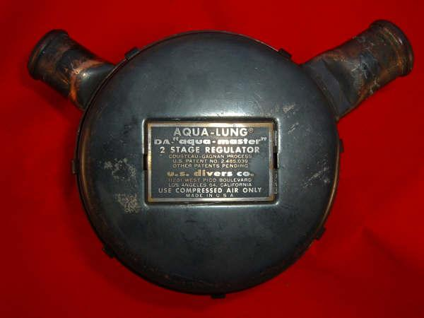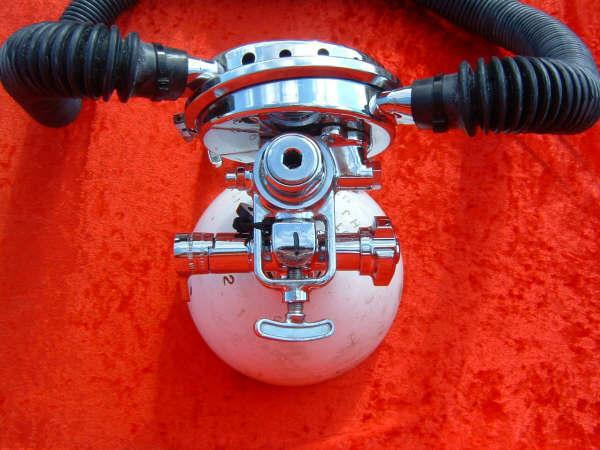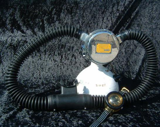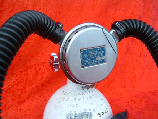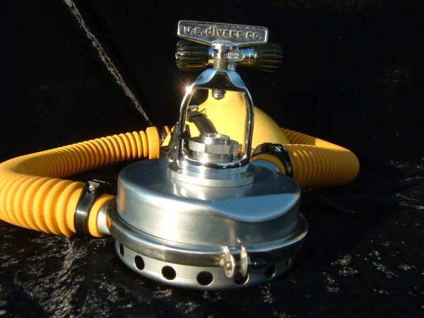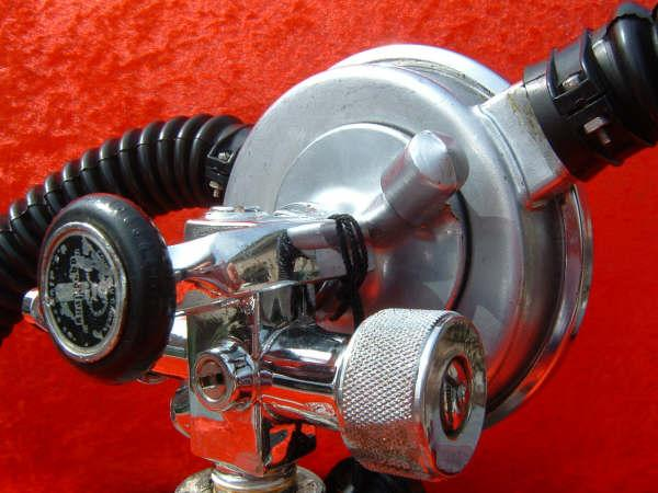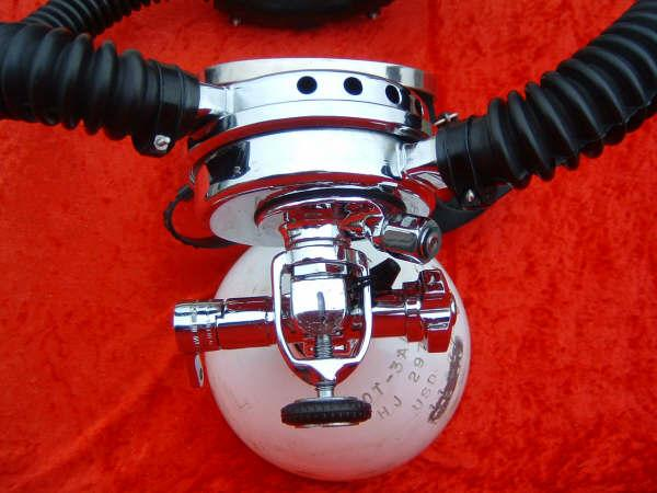 This regulator is from the 50s and is one of the earliest that US Divers had to offer in the USA.  It is one of my favorites even though not the best breather.  It takes a good technician to rebuild one of these and to get everything out of it.  This regulator was used in tests at DIVE LAB in 2007 and 2008.  It was put though it paces on the breathing machine beside a Royal Aquamaster, A Phoenix Royal Aquamaster, and the Military Mentor.  It was returned to the Museum safe and sound and still the King of the hill in it’s own mind.