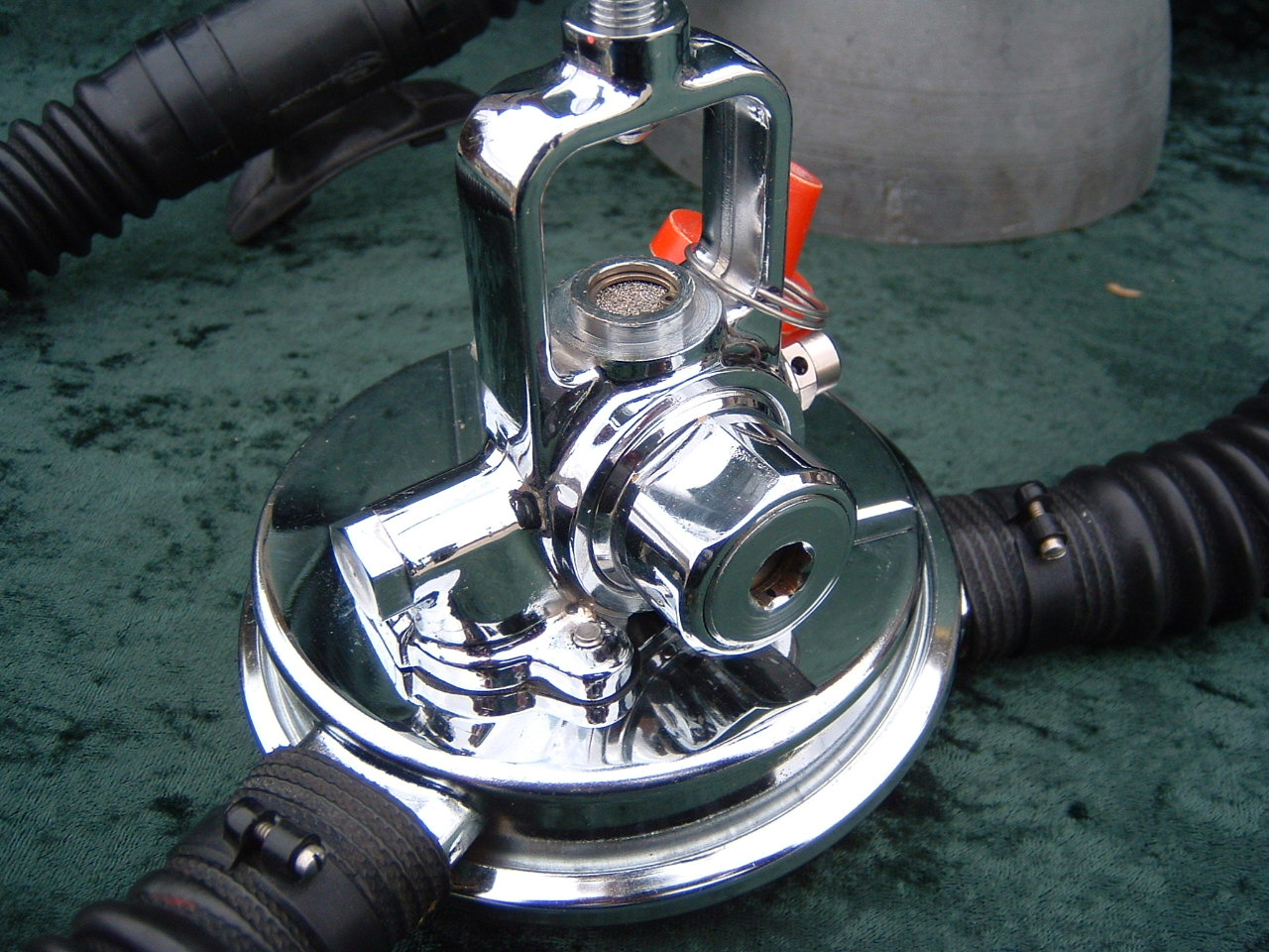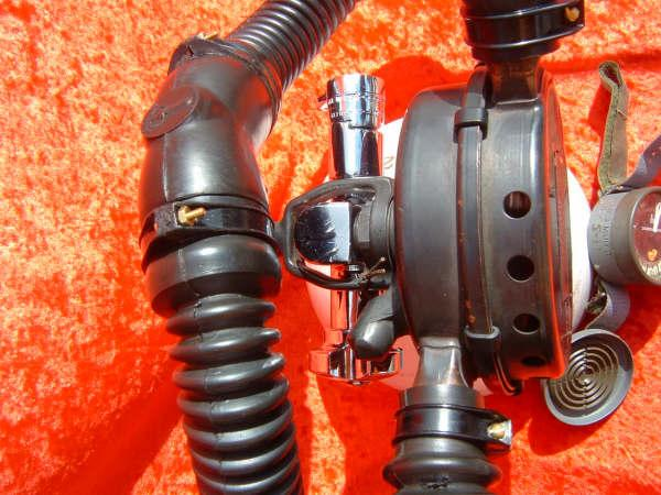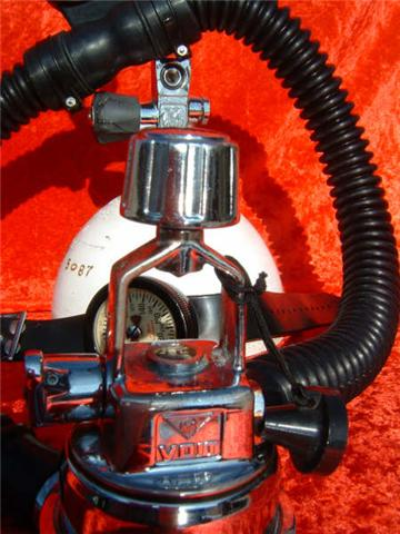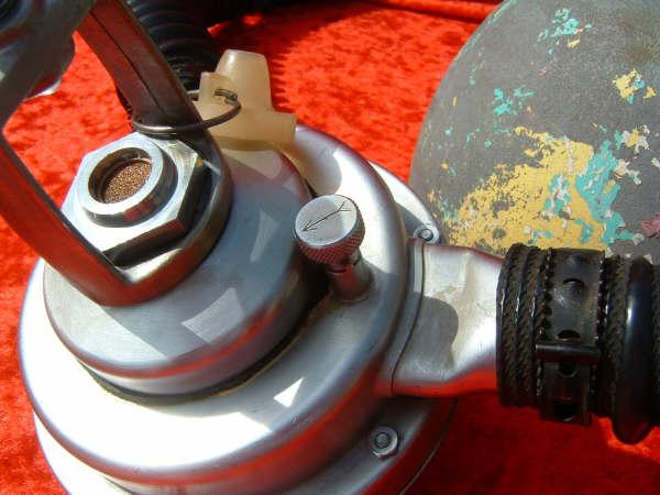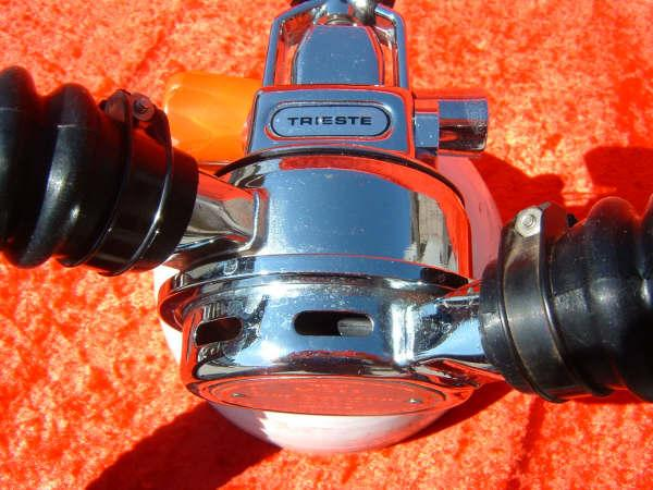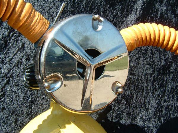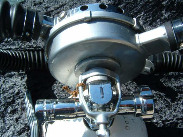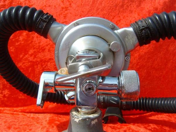 The Trieste J had a built in reserve mechanism.  Many divers liked this option so they did not have to have J valve tank vales on their tanks as the were more prone to leak.  The Trieste is described by some divers as the the best that Voit ever made.  I think this is greatly inaccurate.  While it is an elegant regulator and very unique I do not find it comparable to a US Divers Royal or Mistral.  I think that the small diaphragm casues a mechanical disadvantage as compared to other vintage double hose regulators.  I have dived many Triestes and do like them however.  One very nice feature of the Trieste regulators is the low and high pressure ports.