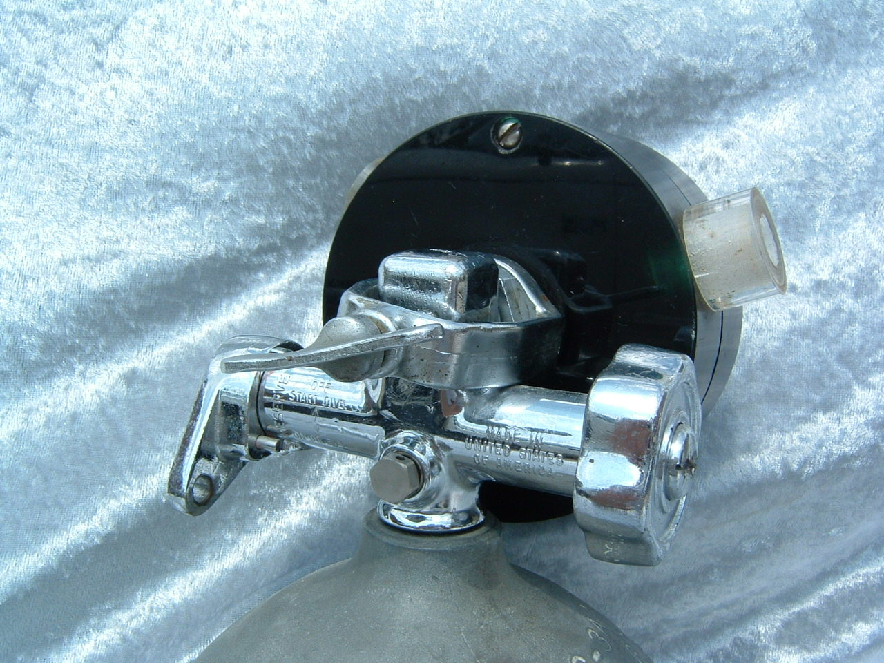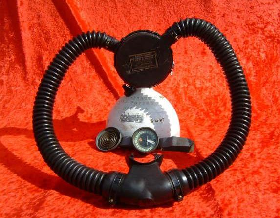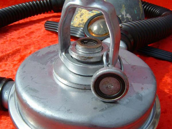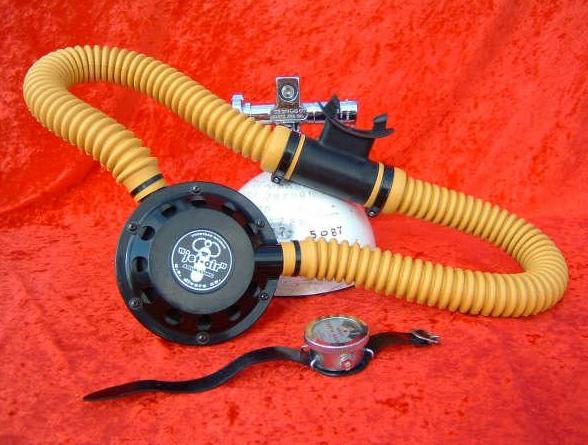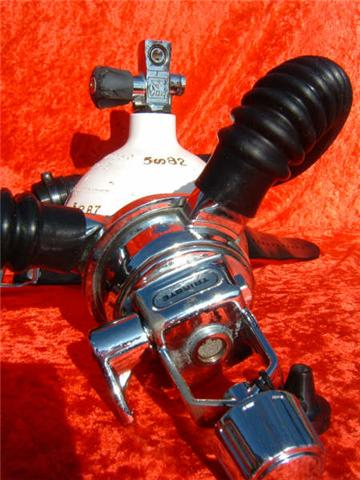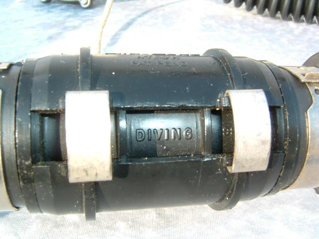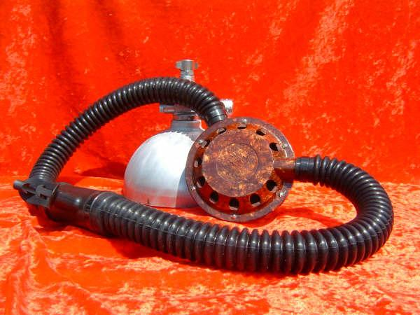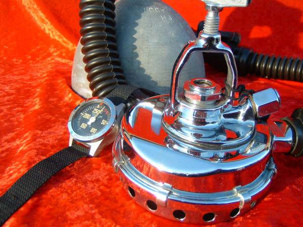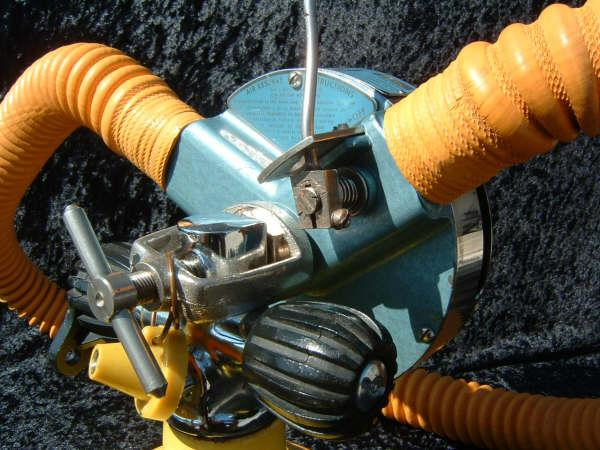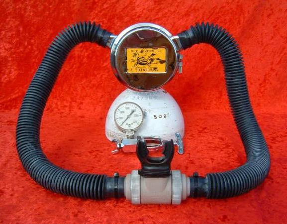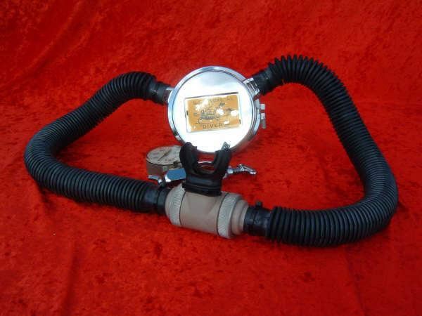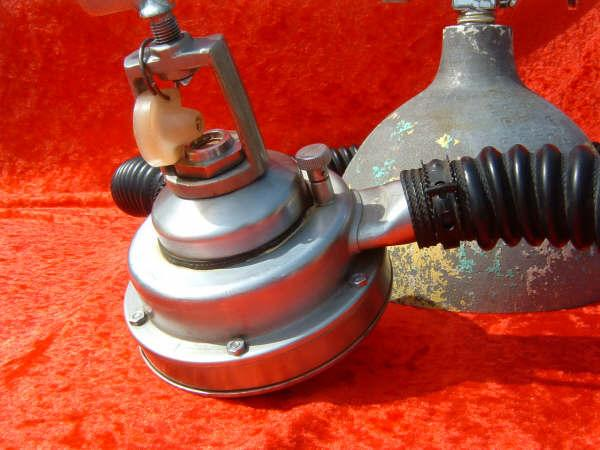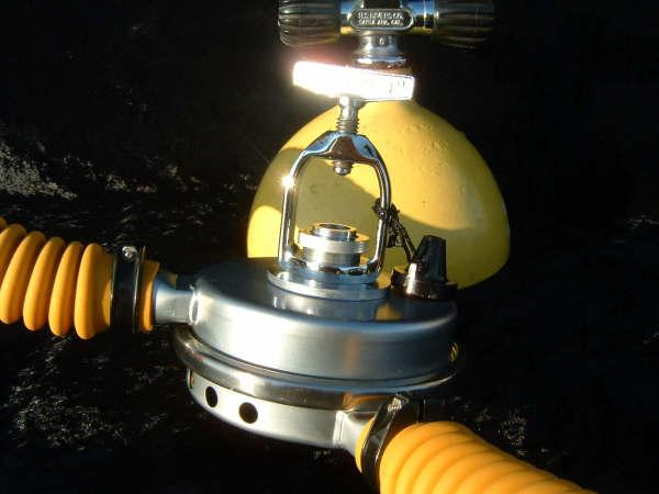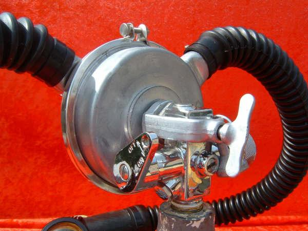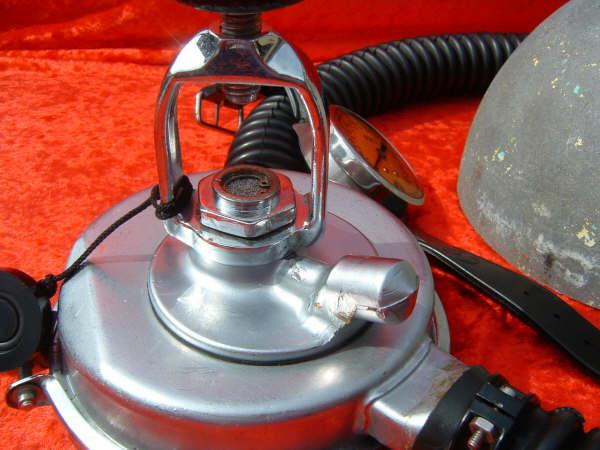 This is a fantastic example of a homemade regulator from the 1950’s.  It was most likely made using the July 1953 Popular Mechanics article and a WWII oxygen aviation regulator.  The regulator’s diaphragm have to be “waterproofed” before using it as an underwater regulator.  I have not dived this regulator, but the few old timers that I do know that have all said it was a very hard breather.  I acquired this regulator in the Ocala area and I do not know who made it or the history of it.  If you happen to know the maker and or the history please contact me.