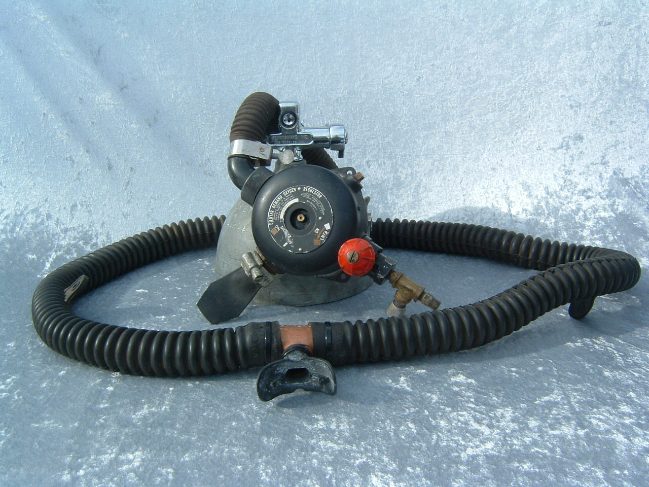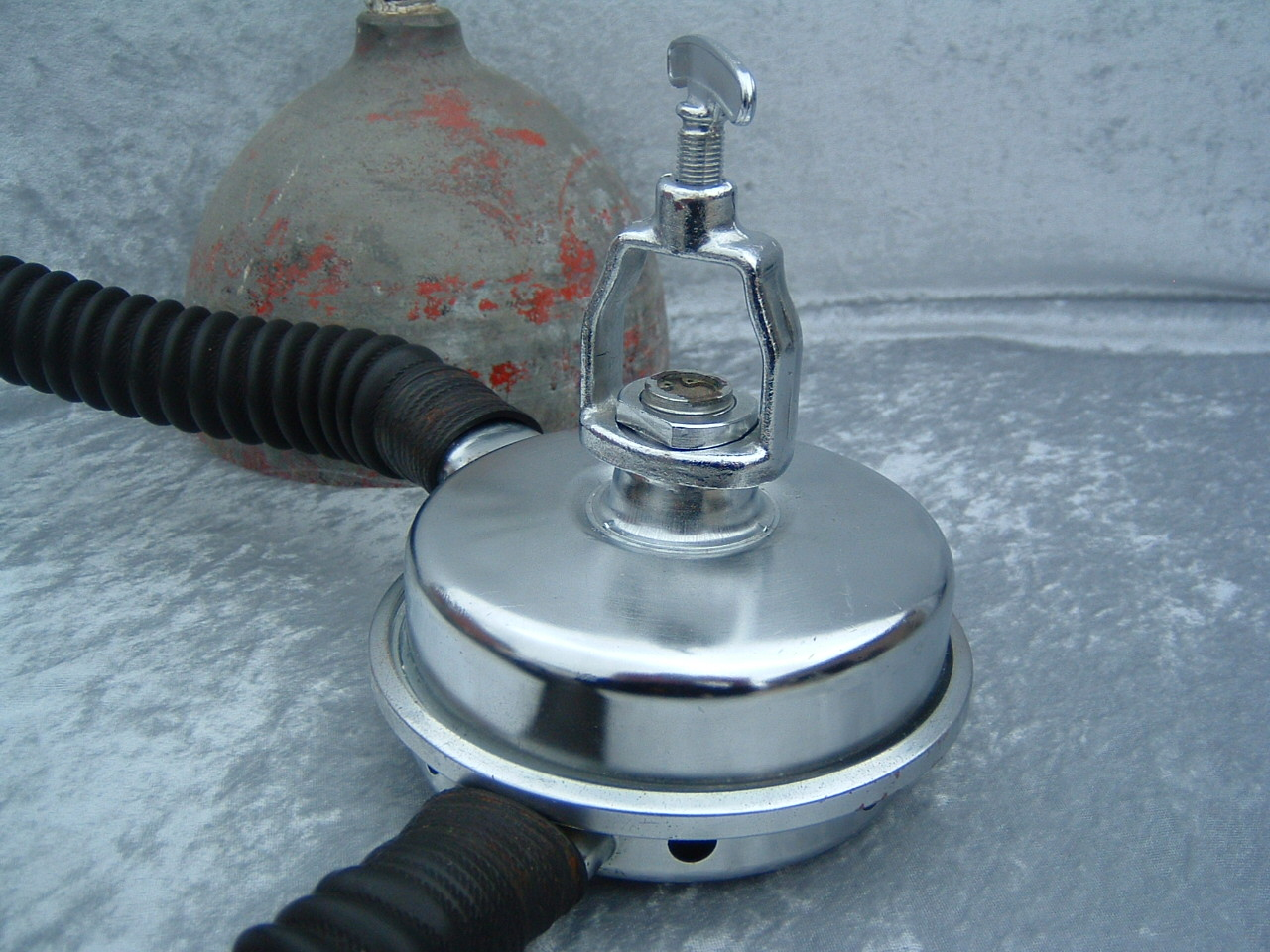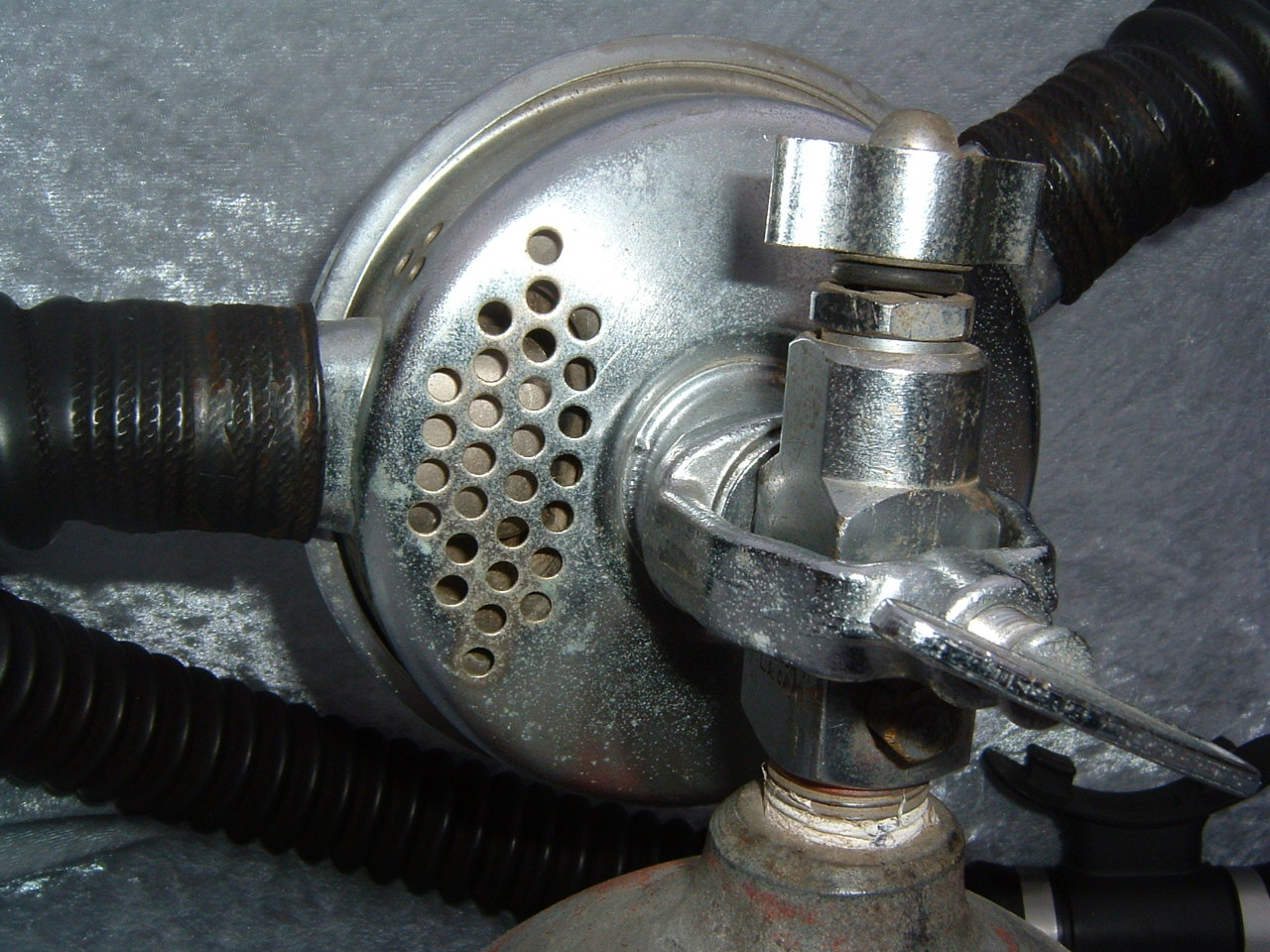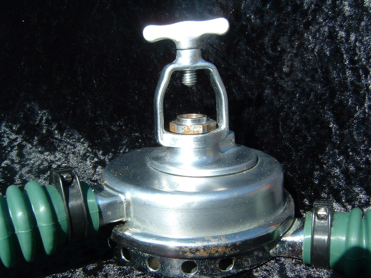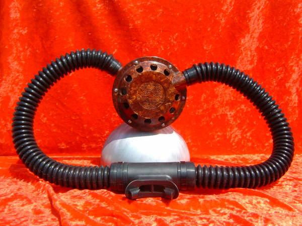 This is a fantastic example of a homemade regulator from the 1950’s.  It was most likely made using the July 1953 Popular Mechanics article and a WWII oxygen aviation regulator.  The regulator’s diaphragm have to be “waterproofed” before using it as an underwater regulator.  I have not dived this regulator, but the few old timers that I do know that have all said it was a very hard breather.  I acquired this regulator in the Ocala area and I do not know who made it or the history of it.  If you happen to know the maker and or the history please contact me.