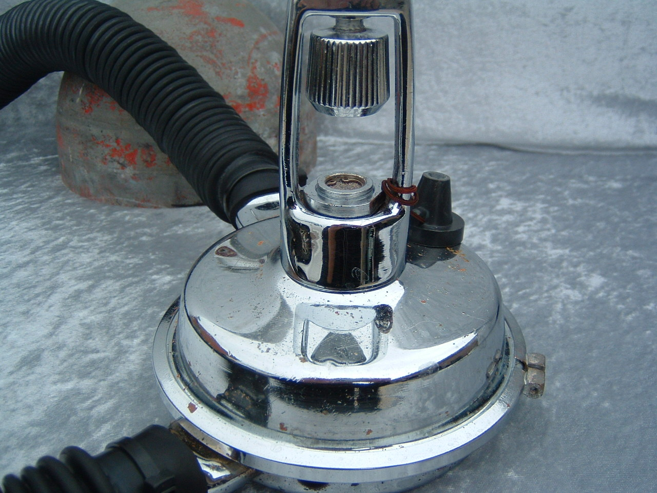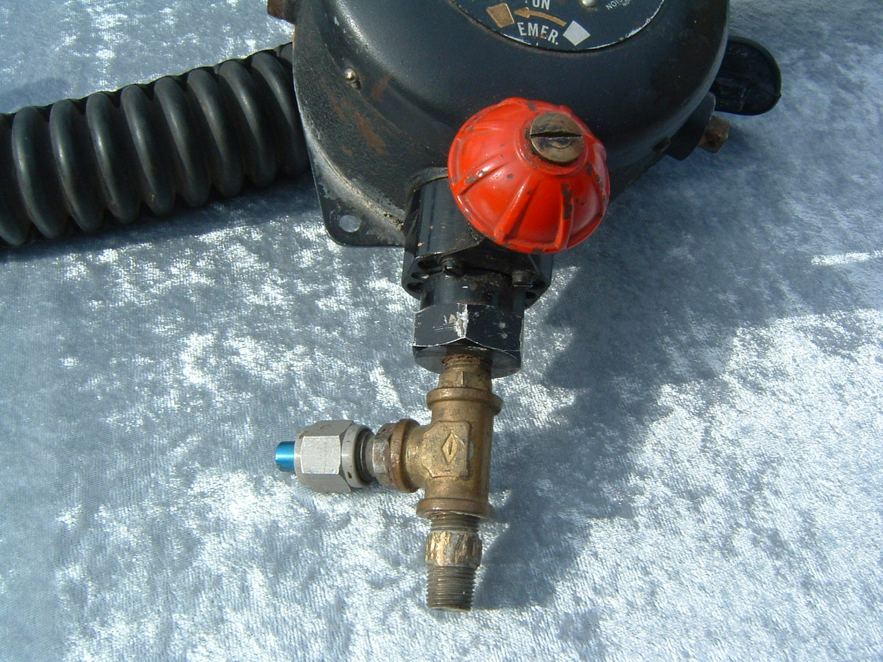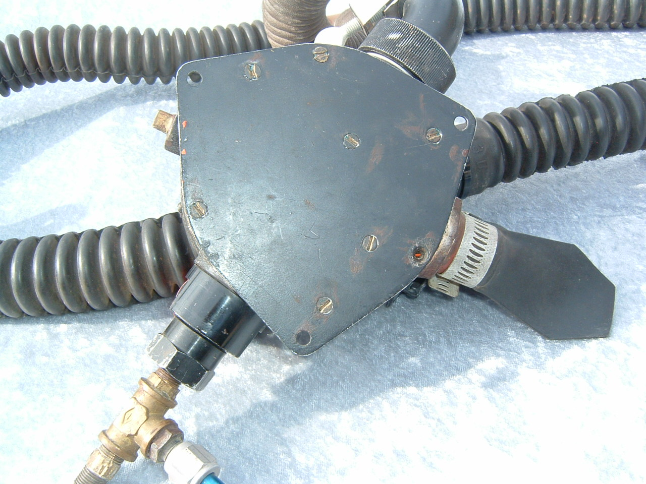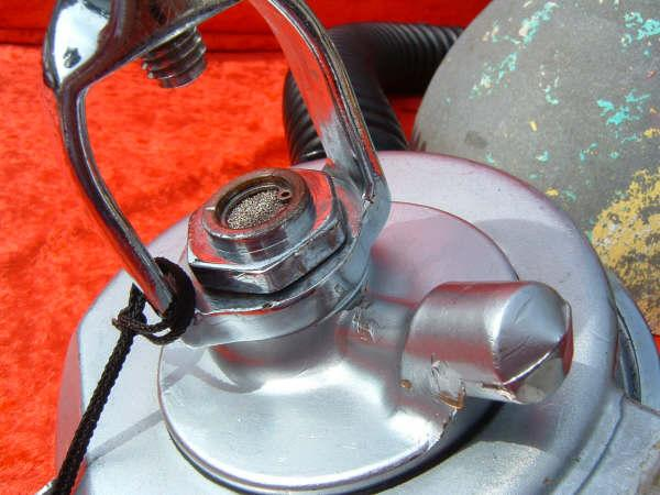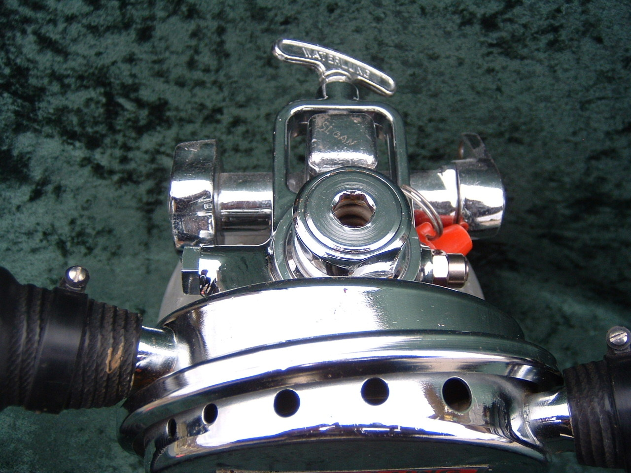 This is a fantastic example of a homemade regulator from the 1950’s.  It was most likely made using the July 1953 Popular Mechanics article and a WWII oxygen aviation regulator.  The regulator’s diaphragm have to be “waterproofed” before using it as an underwater regulator.  I have not dived this regulator, but the few old timers that I do know that have all said it was a very hard breather.  I acquired this regulator in the Ocala area and I do not know who made it or the history of it.  If you happen to know the maker and or the history please contact me.