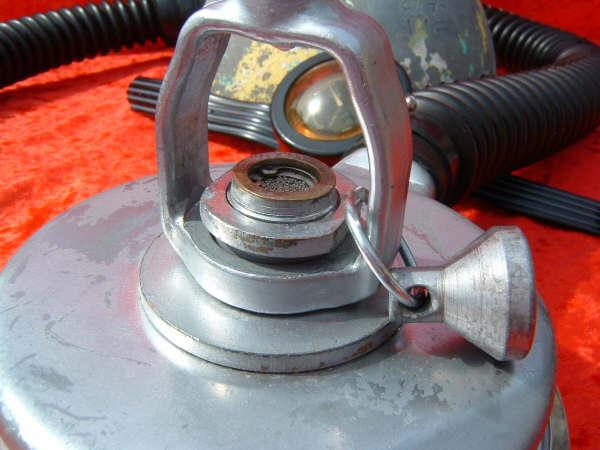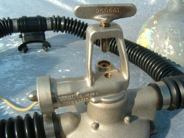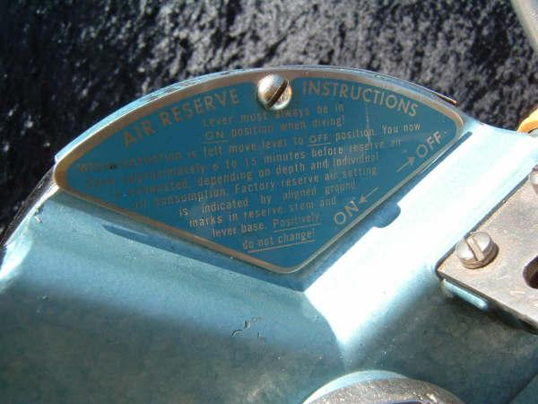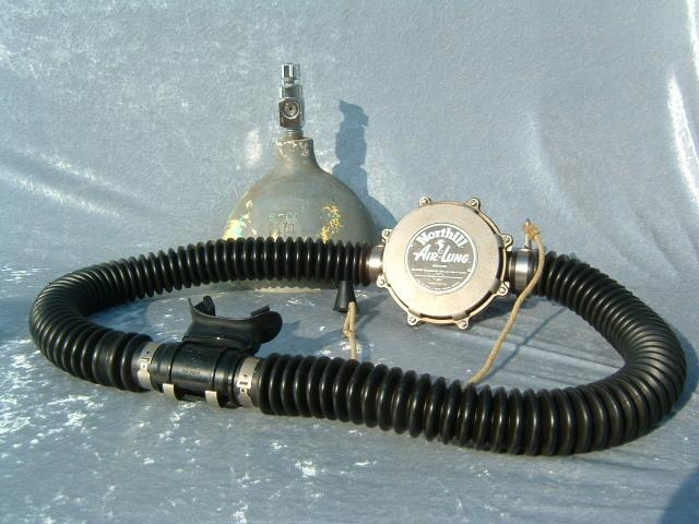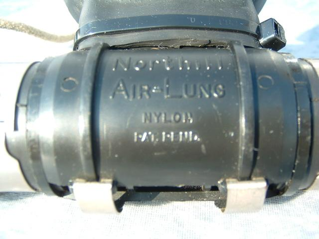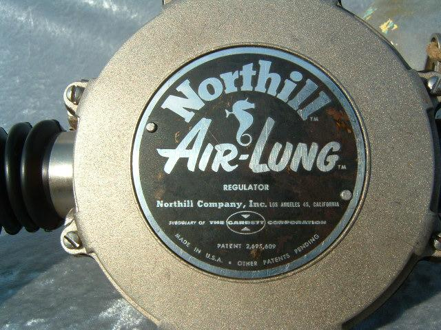 The Northill Air-lung was made of brass and weighs a substantial amount.  It was made by the Garrett Corp in the good old USA.  The mouthpiece was a DSV, see the dive and surface mode.  The regulator also has a built in reserve mechanism which was great in the days of the old post valves.