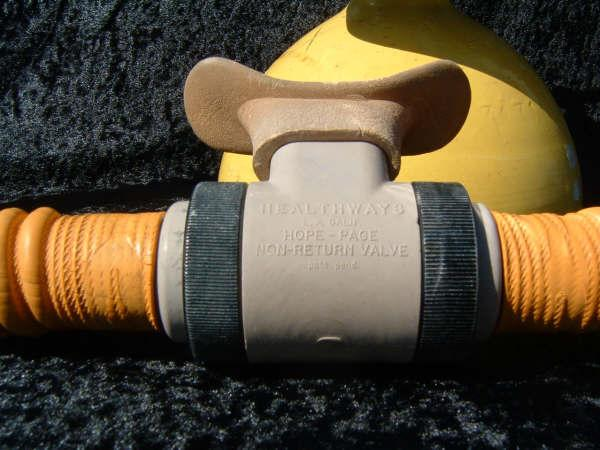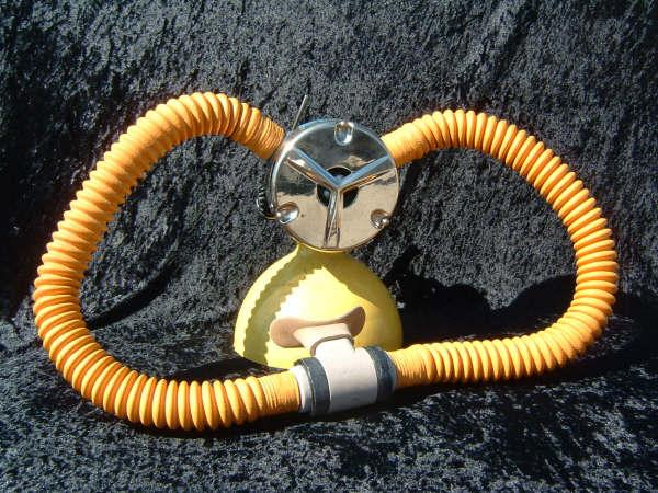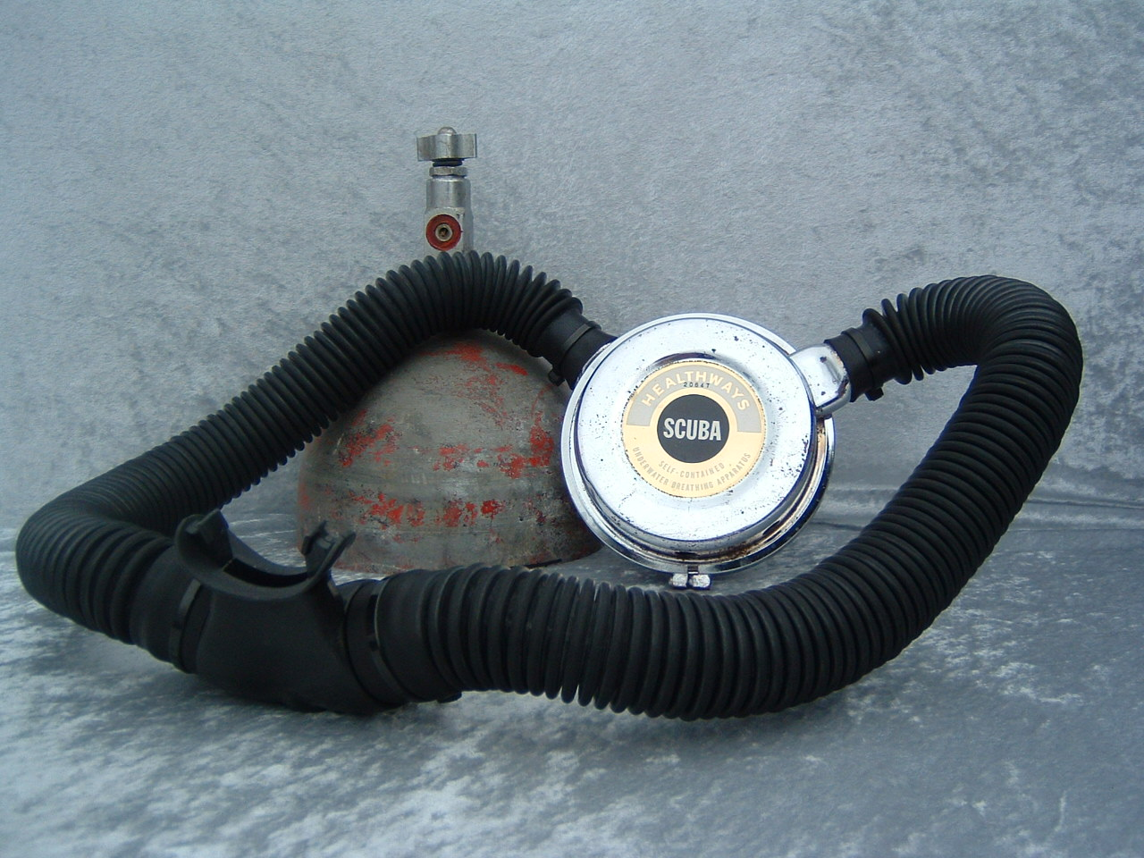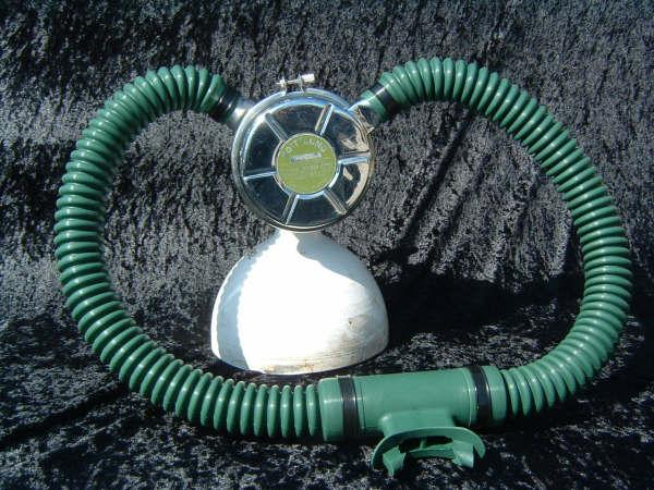 The Healthways Deluxe single stage was first cataloged in 1960 with the “high test neoprene hose” and sold for about $52.00.  It can standard with the mouthpiece shown but for an additional $7.95 you could have it retrofitted with a Hope Page mouthpiece; a major improvement.  The original diaphragms in these regulators perished and as a result until the food grade reproductions where made available these regs had to sit on the shore.  Now all three of the Healthways double hose regulators can return to the deep.