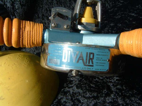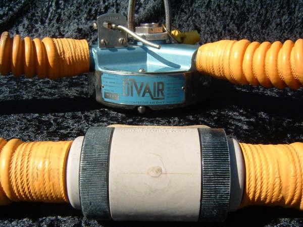 The DIVAIR Model B 1955.  Ed Fisher,now 86 years old did a 24 hour Endurance dive at French reef off Key Largo,Florida 21-22 August 1954 he used Divair regulators as a promotional stunt, at the time his dive made Time magazine and most major newspapers, the regulator went unnoticed, photos of the dive can be found in Jerry Greenberg’s book Manfish.  This Divair was brought back to life and dived by Museum staff along with a Model C 1956.  Divairs were not known for quality and resurrection was a challenge.