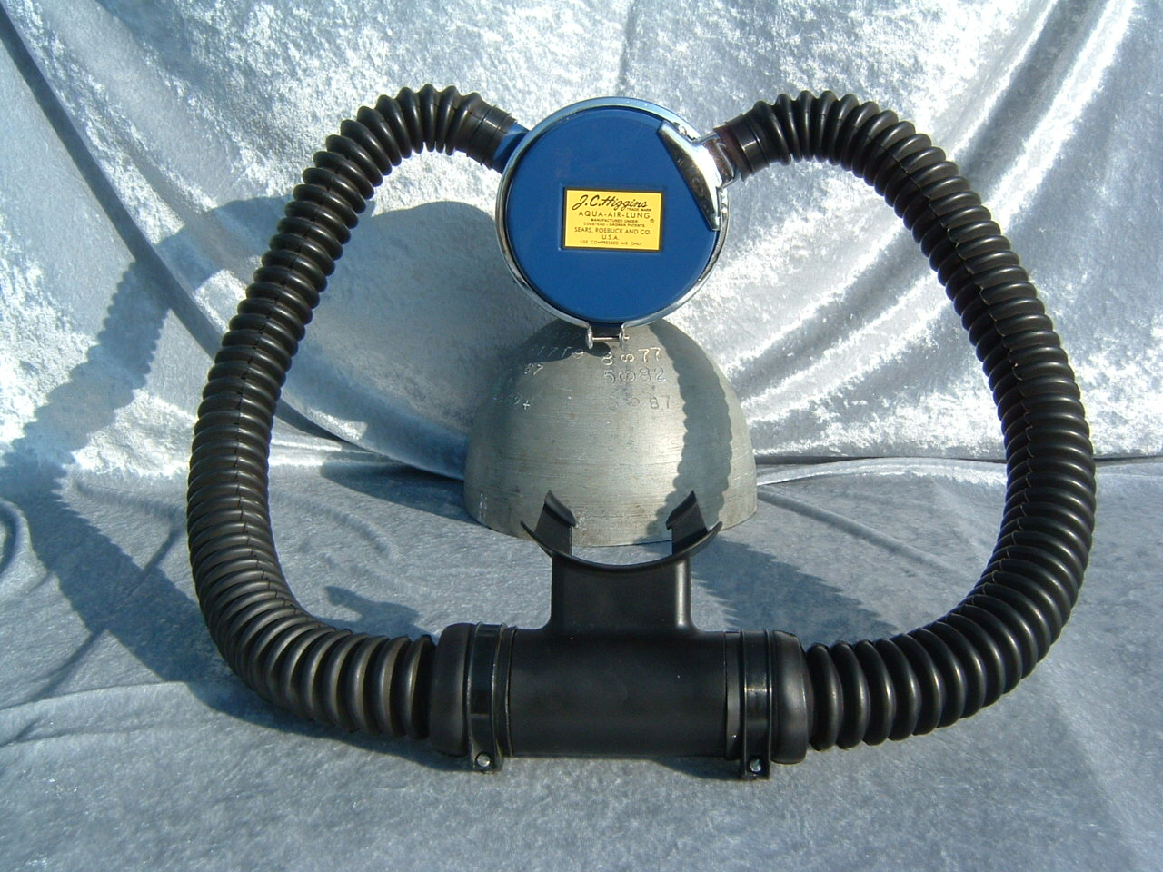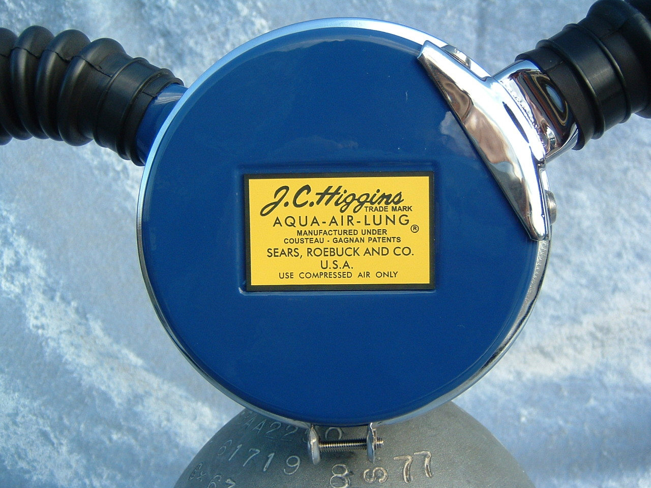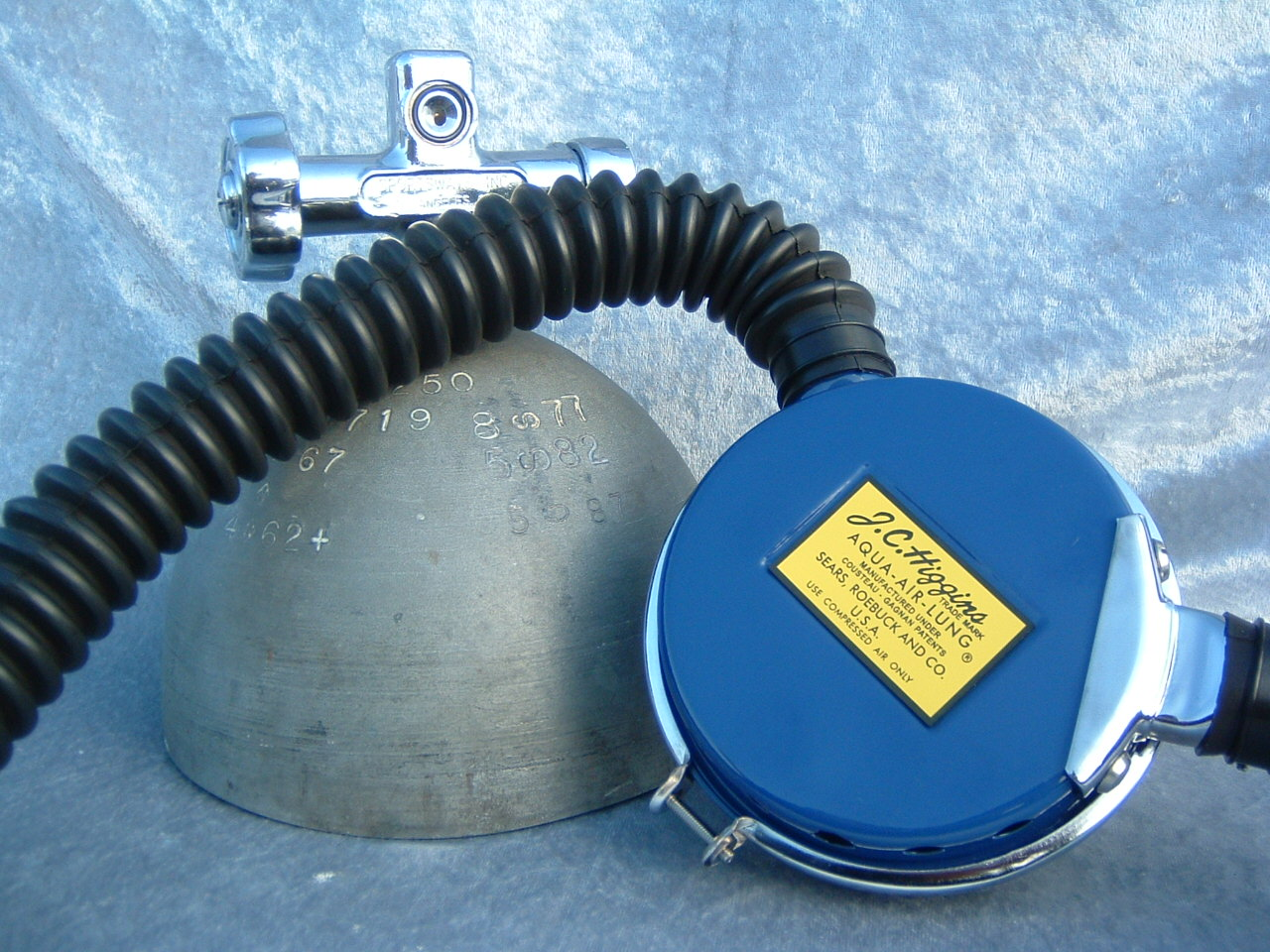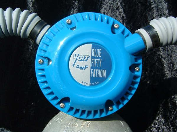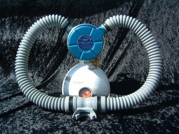 This VCR-5 was cataloged in both 1959 and 1960.  The 1961 version was chromed instead of painted blue.  This is an almost perfect example of a 50 FATHOM with nearly all of it’s original paint!  How this example has lasted in the shape that it has is not known.  I would guess that it was not dived very much when it was new.  I now treat it with kid’s gloves.  I have another “diver” now that I had repainted/restored so this one can stay safely on display.  Again the GRAY silicone hoses really set off the paint job on this regulator.  This regulator originally arrived from the factory with chromed tinnermanns instead of the nylon clamps seen here.  This regulator housed a downstream Gagnan valve mechanism.  Mike Nelson would surely have approved.