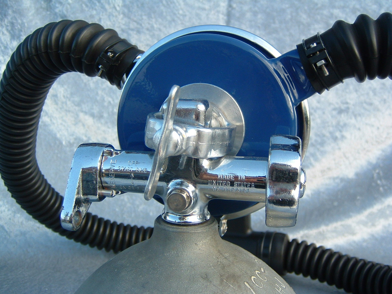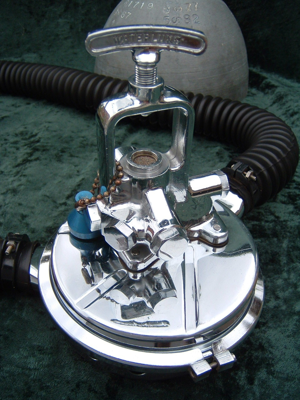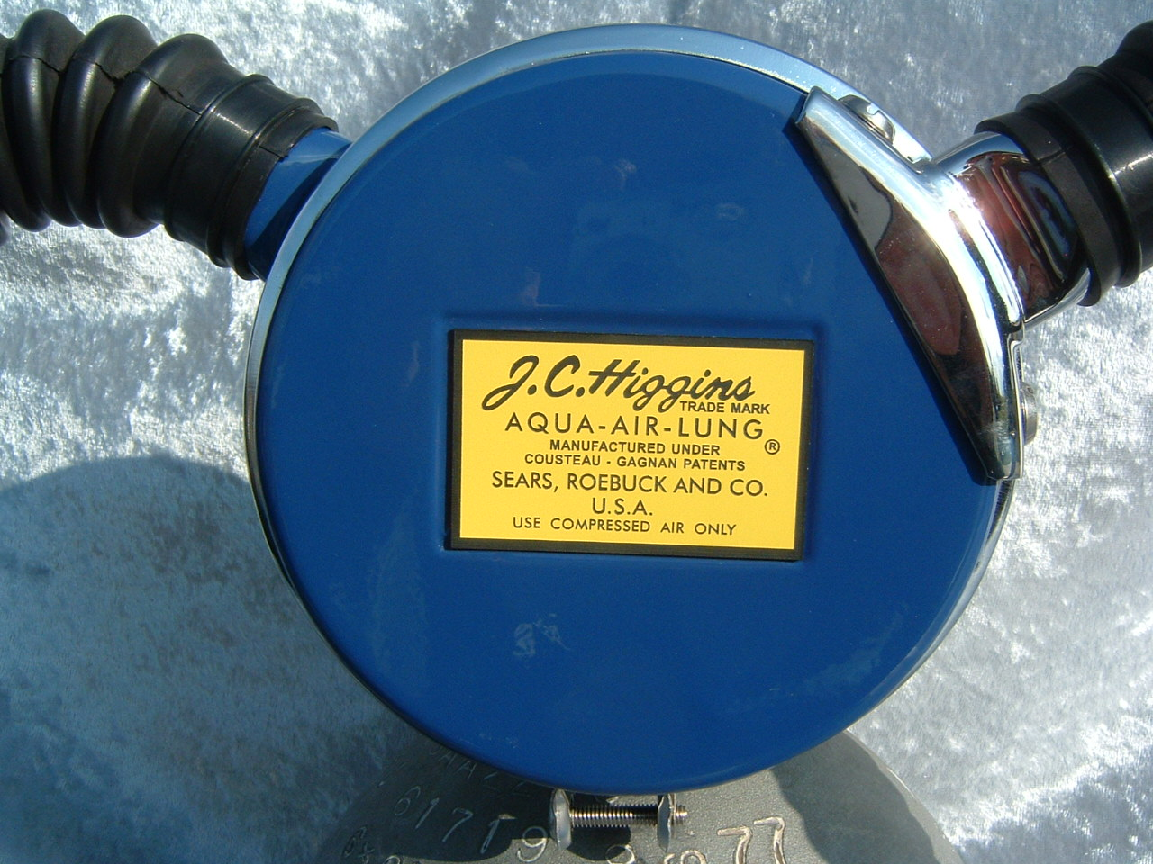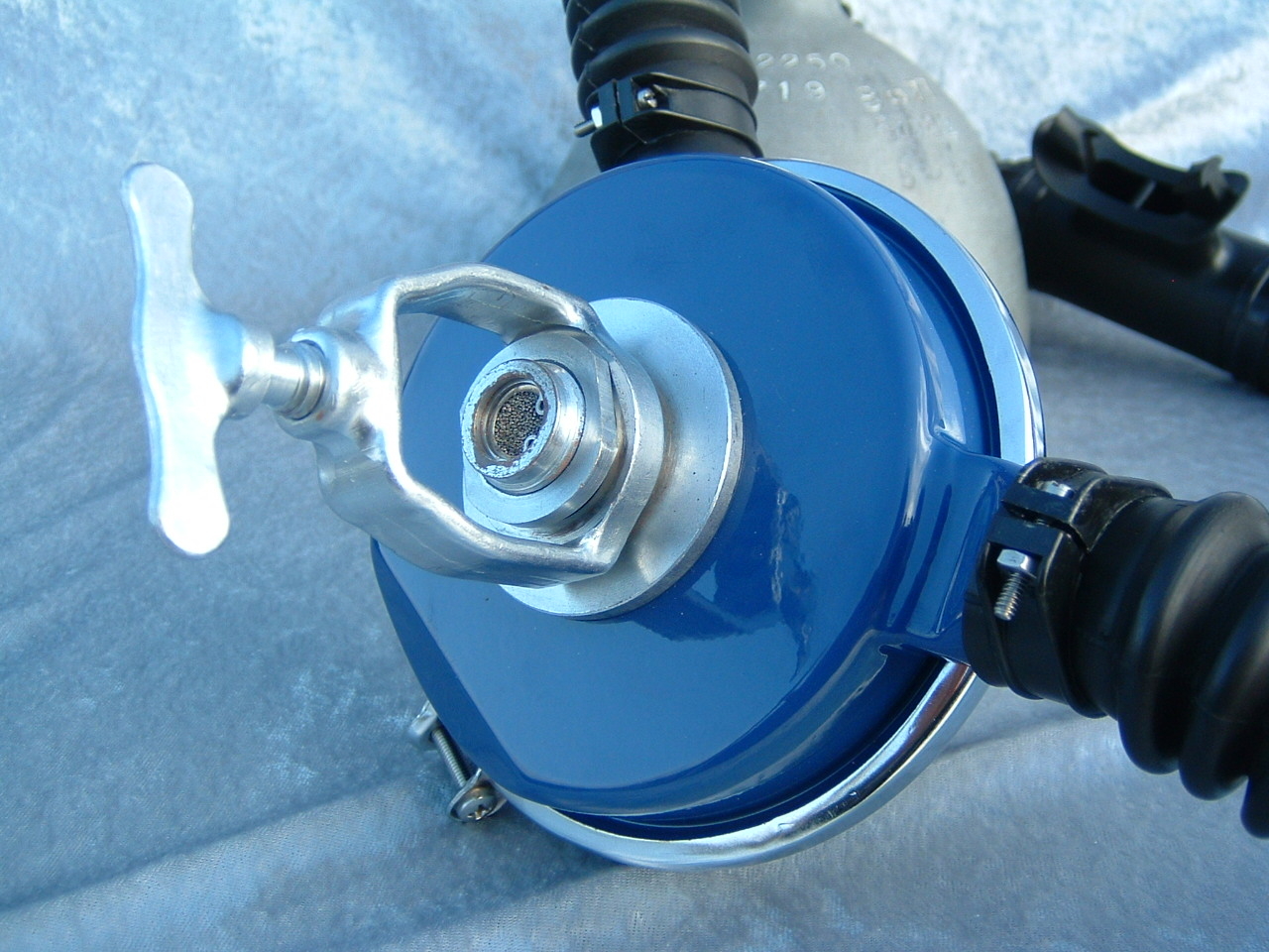 This VCR-5 was cataloged in both 1959 and 1960.  The 1961 version was chromed instead of painted blue.  This is an almost perfect example of a 50 FATHOM with nearly all of it’s original paint!  How this example has lasted in the shape that it has is not known.  I would guess that it was not dived very much when it was new.  I now treat it with kid’s gloves.  I have another “diver” now that I had repainted/restored so this one can stay safely on display.  Again the GRAY silicone hoses really set off the paint job on this regulator.  This regulator originally arrived from the factory with chromed tinnermanns instead of the nylon clamps seen here.  This regulator housed a downstream Gagnan valve mechanism.  Mike Nelson would surely have approved.