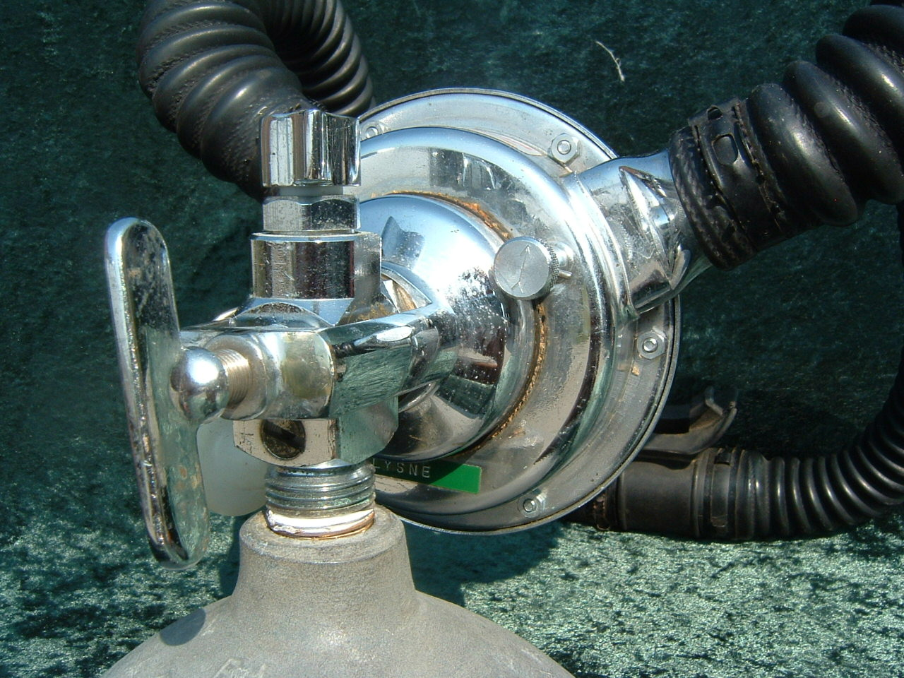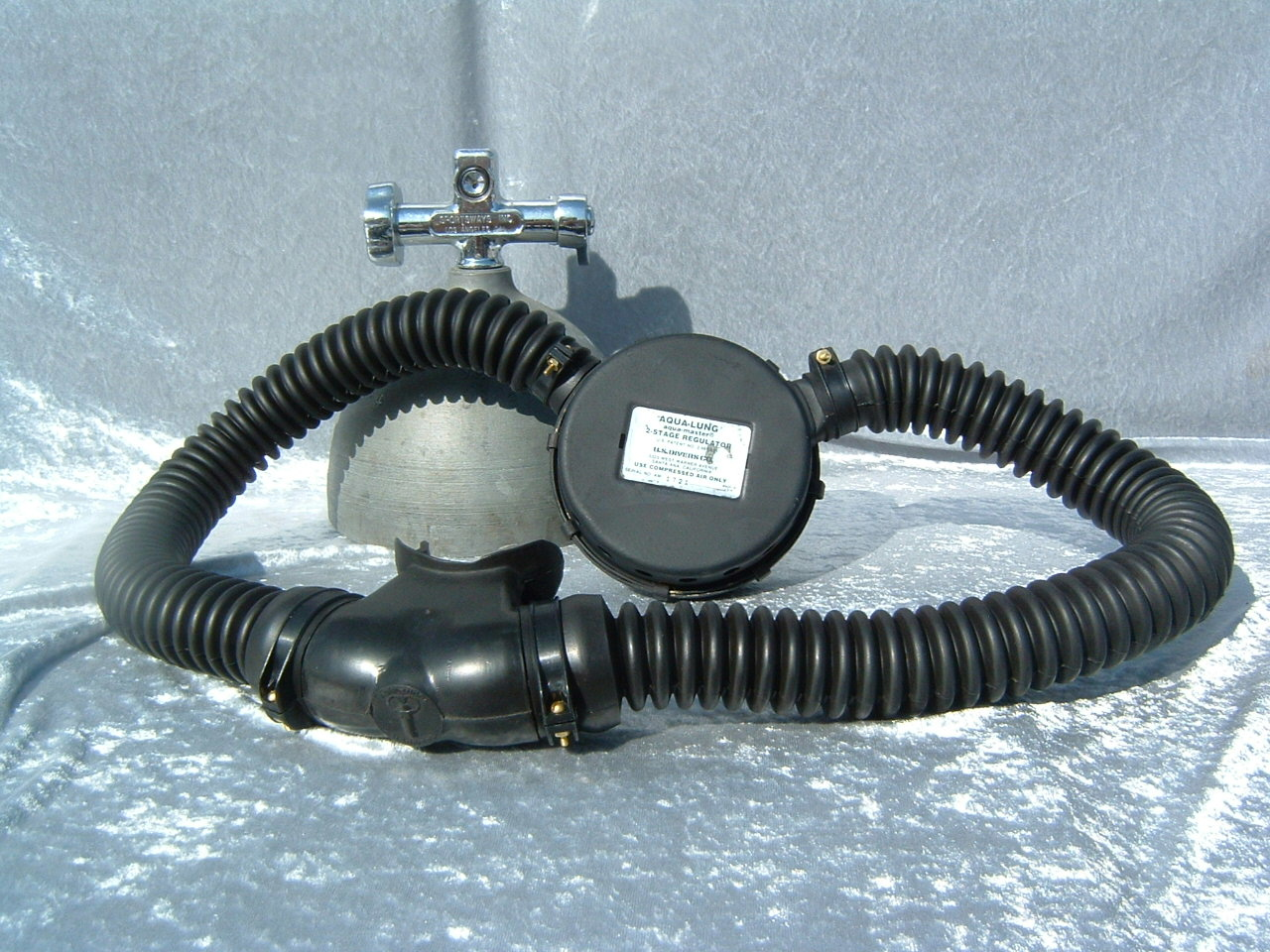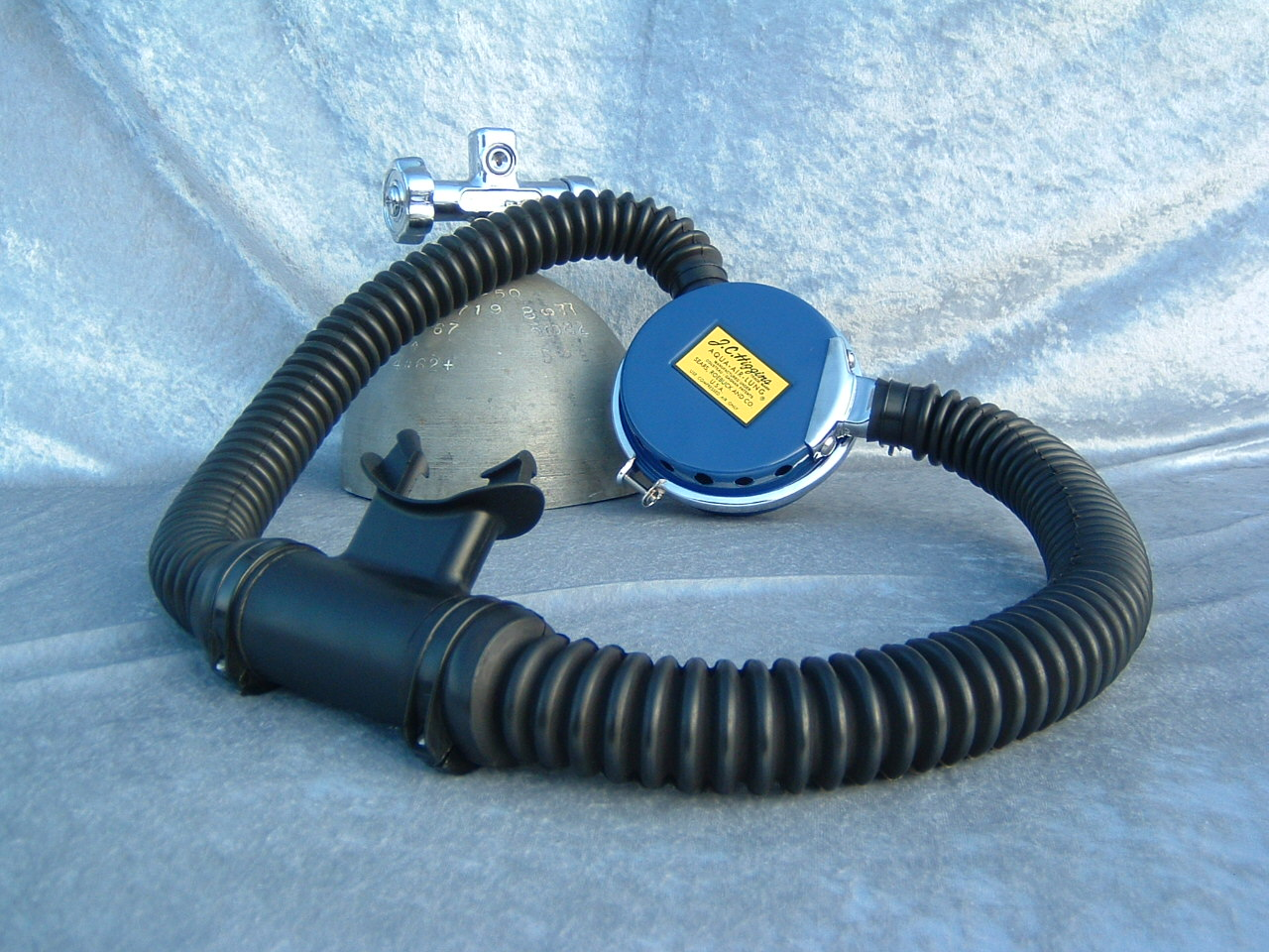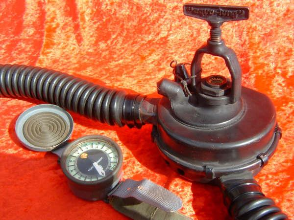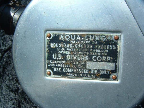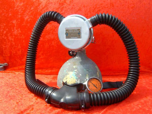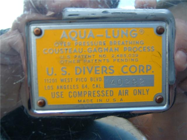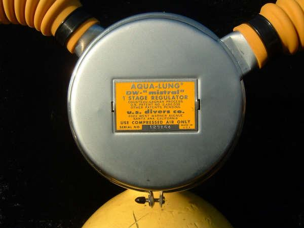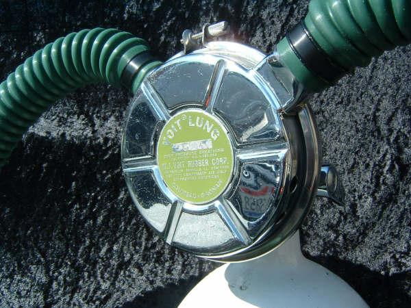 This Green label Trade Mark Aqua Lung predates the blue label and would have come with a black one hose piece assembly.  This model also has a rougher casting to the body than the later models.  This model has been retrofitted with a EZ clear hose and mouthpiece assembly as most were back in the day.  The Scuba Museum is actively seeking a RED and Black label to round out the display.