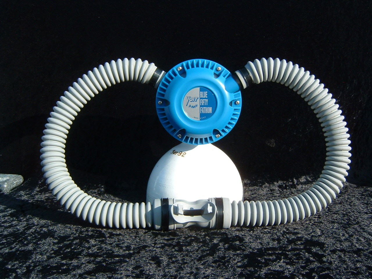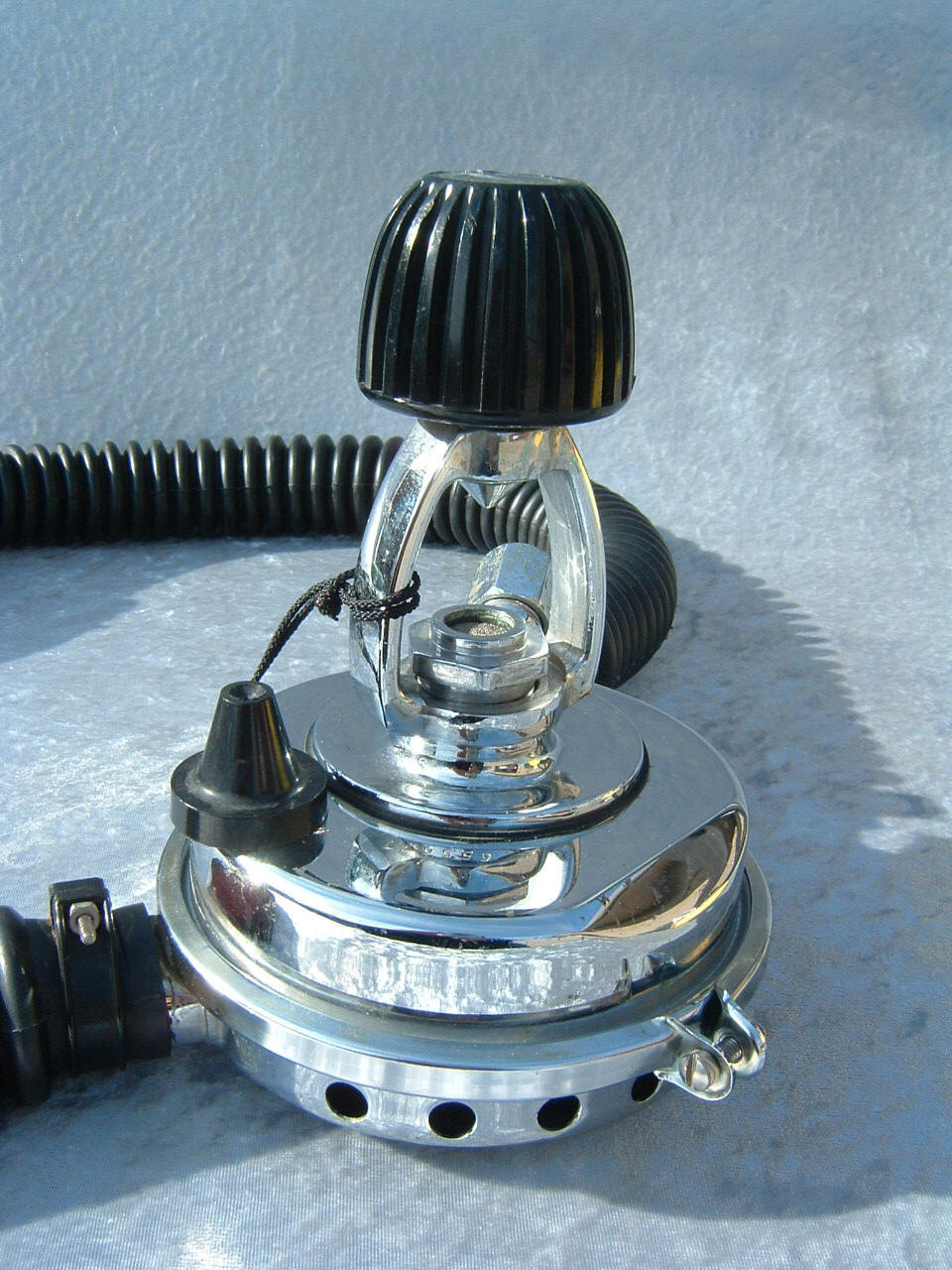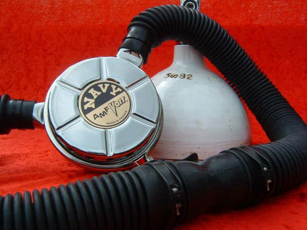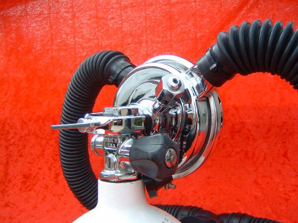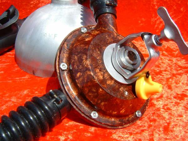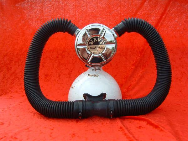 The Phoenix Royal Aquamaster or PRAM was designed by Luis Heros and manufactured by Bryan Pennington of www.vintagedoublehose.com .  The PRAM is perhaps the most modern vintage scuba regulator ever made.  What you are looking at is a DA Aquamaster that has an new updated nozzle installed giving it 3 high pressure ports and 3 low pressure ports.  I use this regulator almost exclusively when I dive my Viking dry suit.  It gives me the ability to use very high pressure cylinders given the heavy yoke.  I can also have a submersible pressure gauge without using a banjo, which can be a pain while wearing dry gloves.  The coolest part is the ability to run a low pressure hose to my dry suit inflator valve.  Of course in the case that you may want to have a bcd with an auto inflator you can run a hose to that as well.  This PRAM was powder coated black to mimic a Navy non magnetic da Aquamaster.  This was one of the first PRAMS built and is serial number 007.  My name is also stamped on the nozzle and I treasure it.  I will never part with this PRAM.