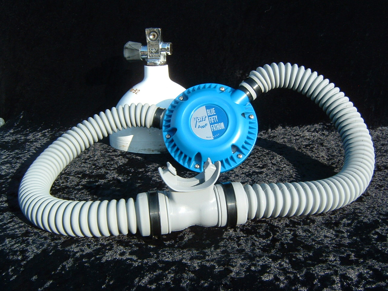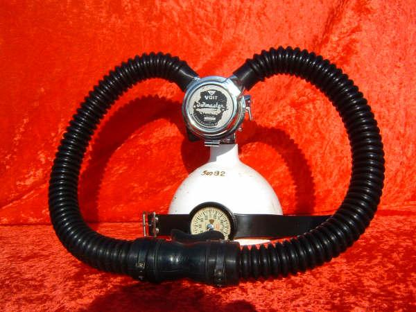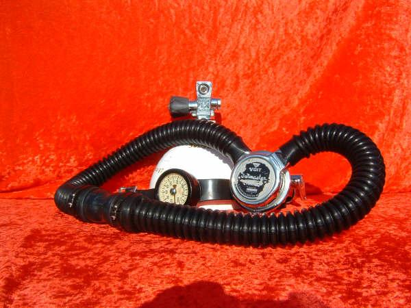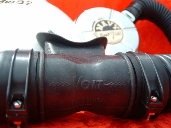 The Voit POLARIS was the Voit version of the US DIVERS MISTRAL basically.  It is a fine breather on low pressure tanks and is nearly bullet proof.  This particular regulator is in very nice shape and is unaltered by me except for the replacement of the brown perished hoses, mouthpiece, and diaphragm with silicone reproductions.  These Voit regs look so much nicer with the correct Gray hoses in my opinion.