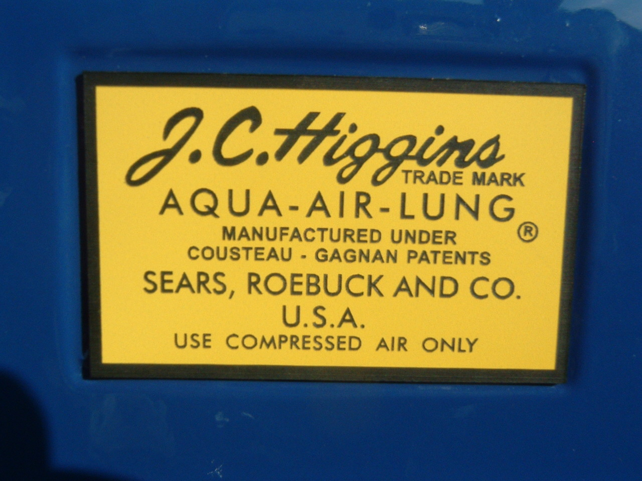 This Faux JC Higgins was made from an Over Pressure.  The original regulator was made for Sears by Aqua Lung, and sold under the JC HIGGINS name.  It was unique in that it used an early label side can with a separate exhaust housing like found on the early Aqua Lungs.  This one was made from an Over Pressure.  The label was fabricated, it is a decent reproduction, but not exact.  The can paint colour match was made by the aid of an original JC Higgins regulator using a paint computer.