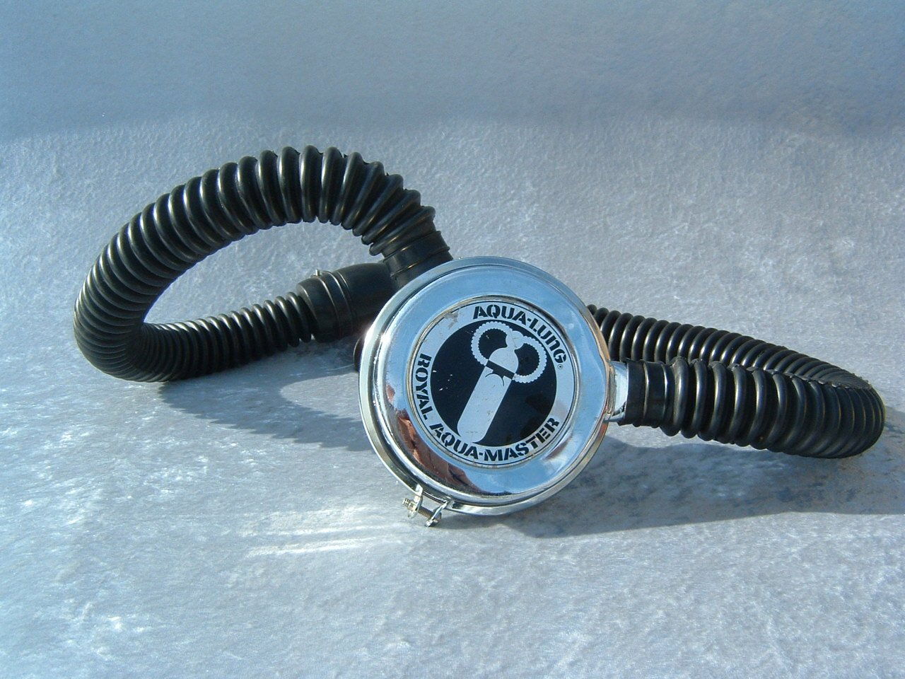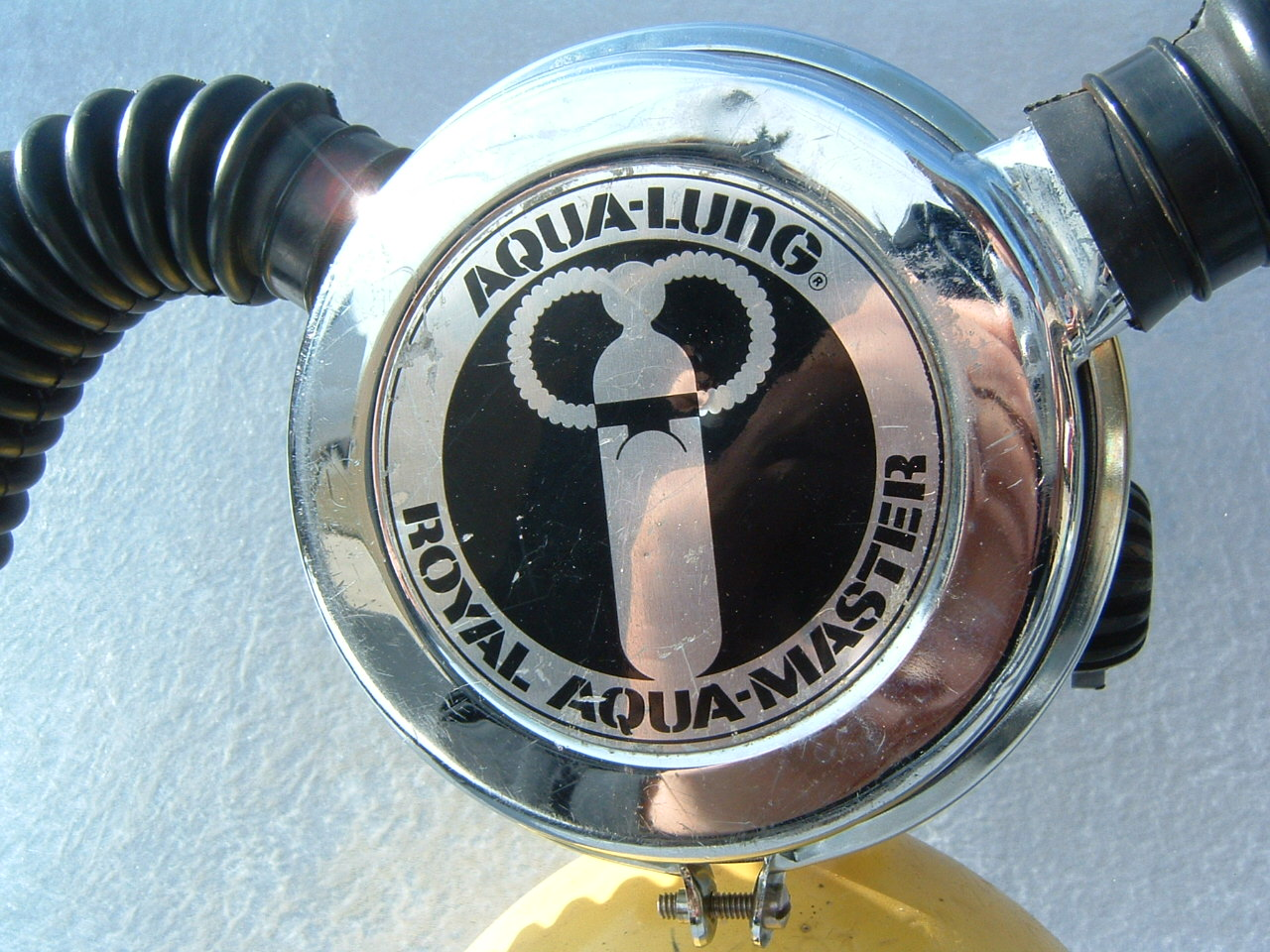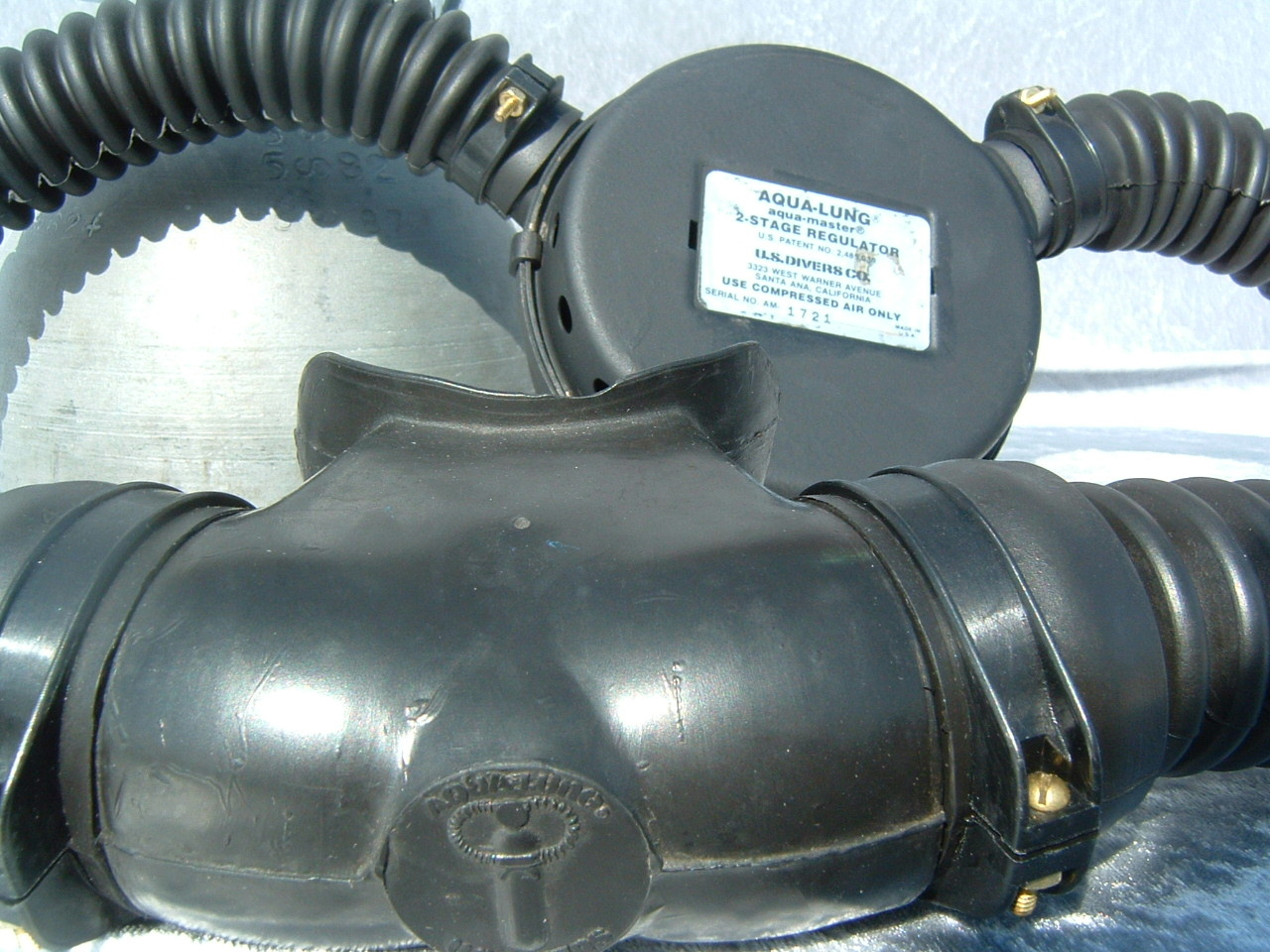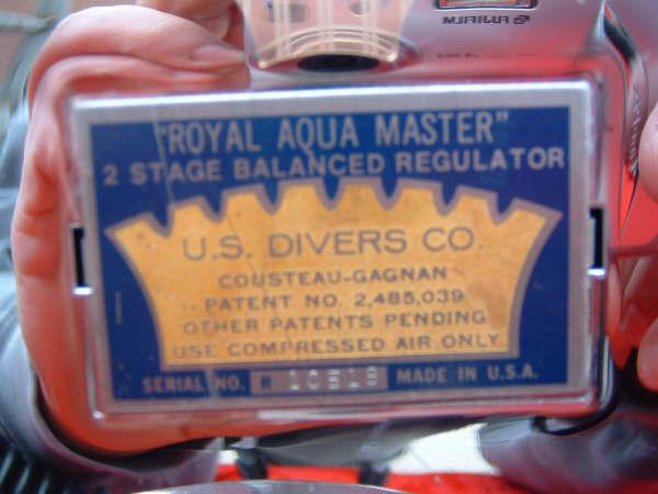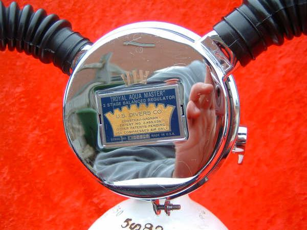 The ROYAL AQUAMASTER, AKA the RAM!  This is the best breathing regulator that US Divers had to offer.  If you want a vintage scuba regulator that will breathe well on a high pressure cylinder then this is the one you want.  It does not matter if it is at 3500 PSI or 300 PSI, it will supply you air like no other regulator out there.  This example came to me with mismatched hoses?  One hose appeared to be of DACOR DIVING LUNG origin and the other a regular US Divers,  The regulator itself looked as if it had been dived, if at all, a few times in fresh water only.  The label is a gorgeous blue and almost perfect.  The chrome also is so nice it was a pain to photograph.  I bet you can tell me what kind of camera I was using (see reflection).  I restored this regulator with correct US DIVERS hoses and dive it with great care.