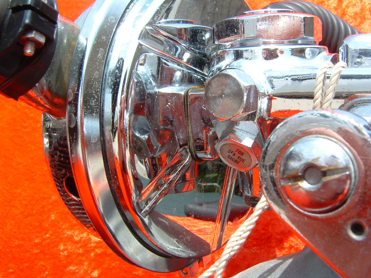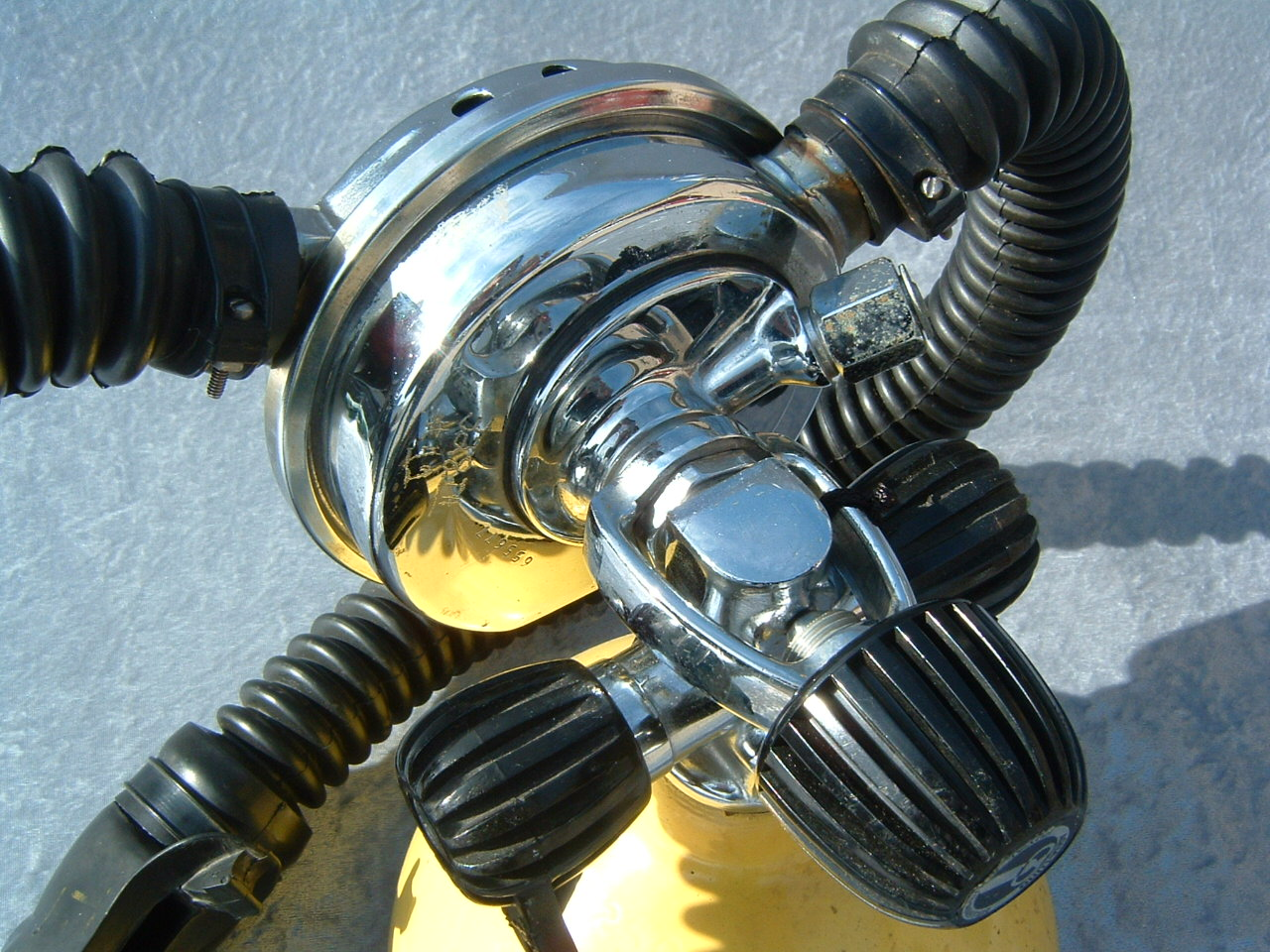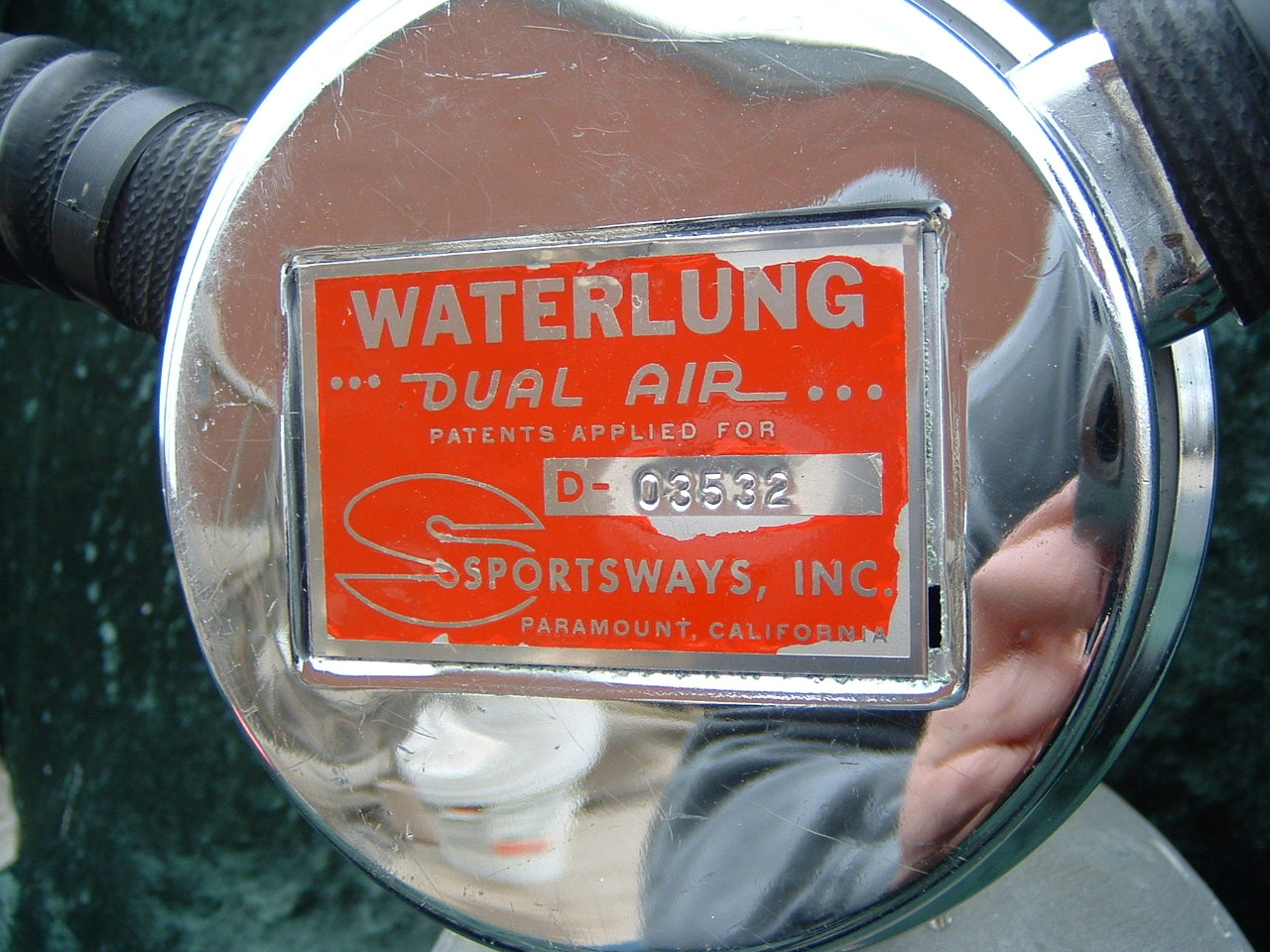 The ROYAL AQUAMASTER, AKA the RAM!  This is the best breathing regulator that US Divers had to offer.  If you want a vintage scuba regulator that will breathe well on a high pressure cylinder then this is the one you want.  It does not matter if it is at 3500 PSI or 300 PSI, it will supply you air like no other regulator out there.  This example came to me with mismatched hoses?  One hose appeared to be of DACOR DIVING LUNG origin and the other a regular US Divers,  The regulator itself looked as if it had been dived, if at all, a few times in fresh water only.  The label is a gorgeous blue and almost perfect.  The chrome also is so nice it was a pain to photograph.  I bet you can tell me what kind of camera I was using (see reflection).  I restored this regulator with correct US DIVERS hoses and dive it with great care.