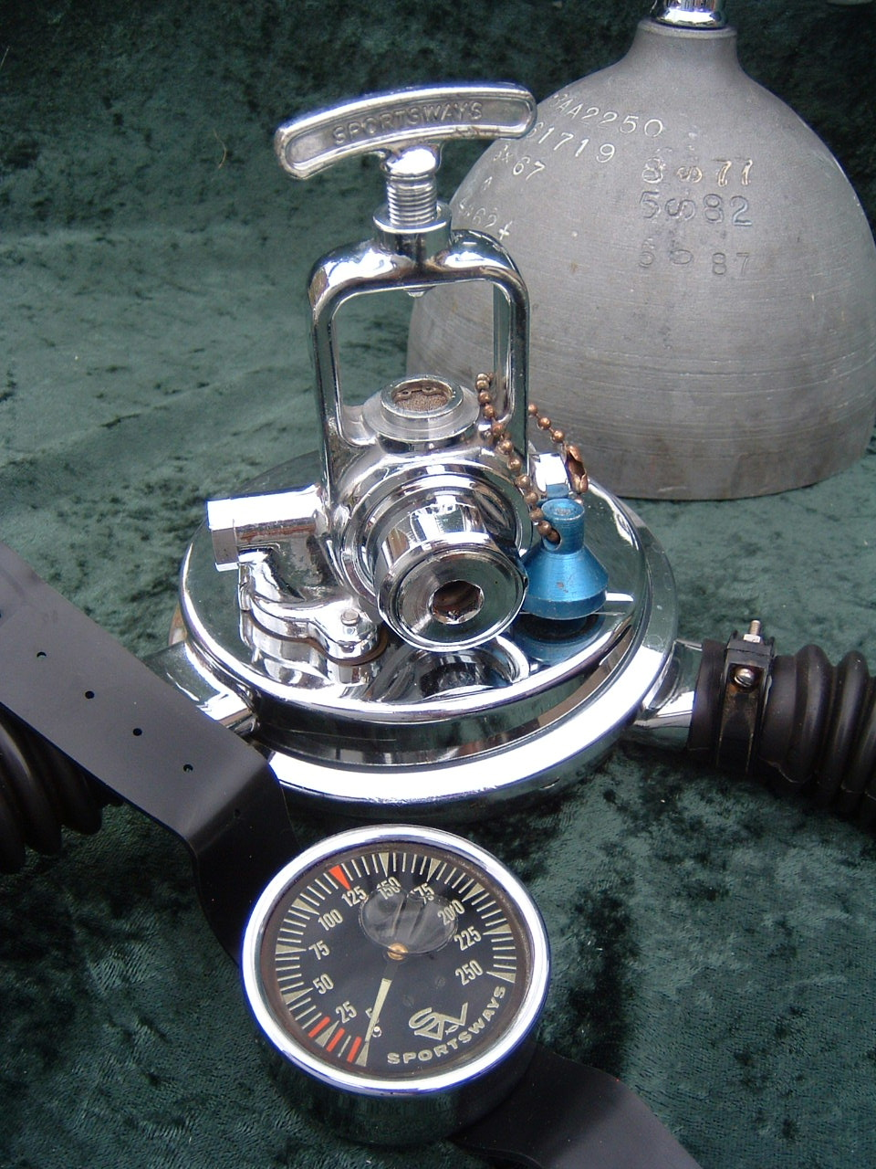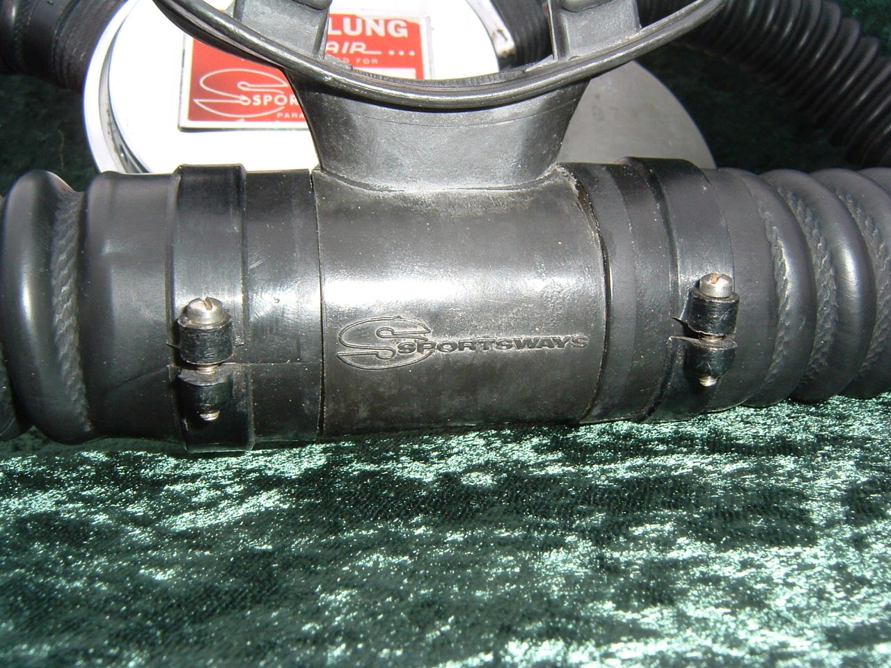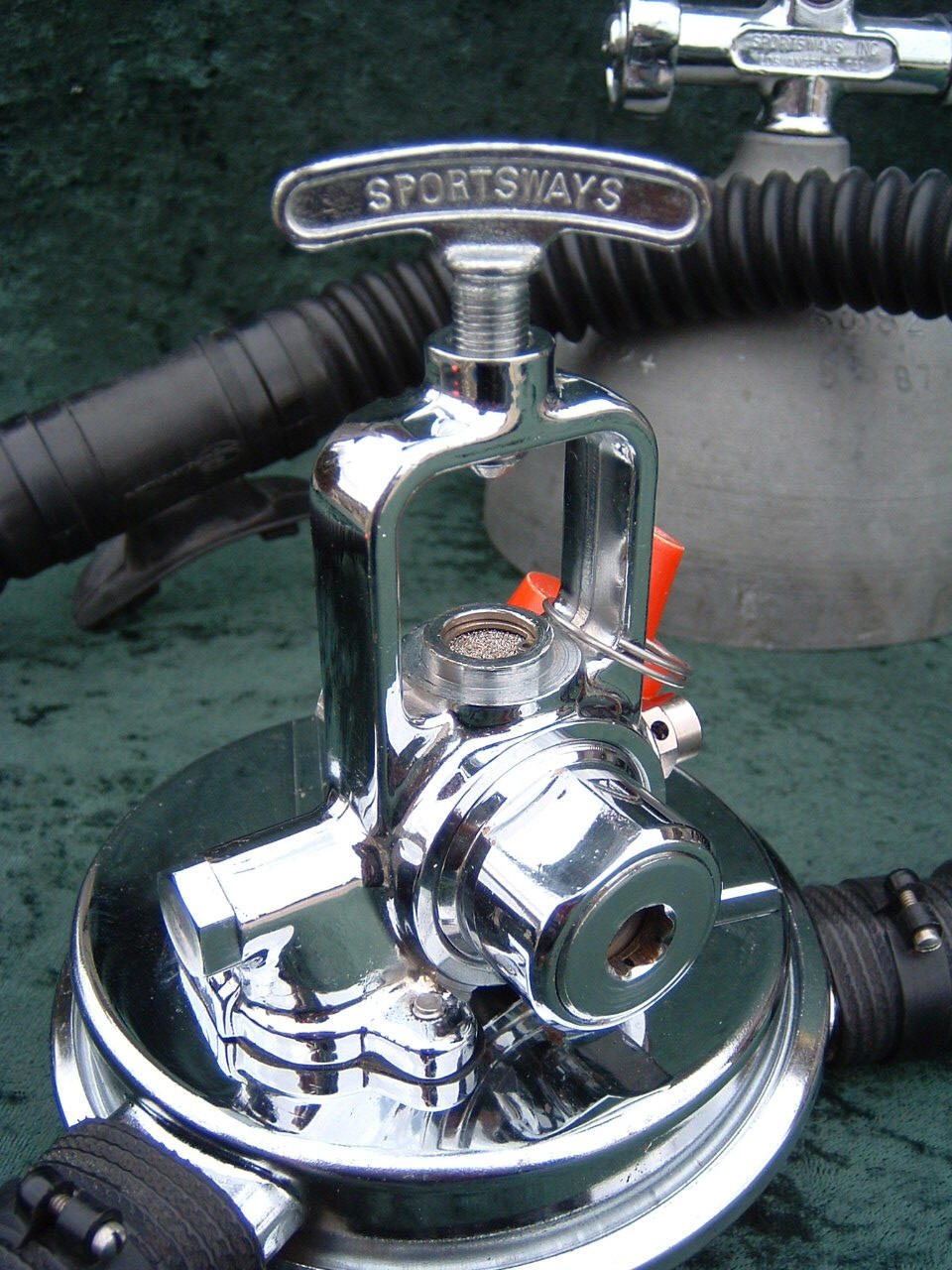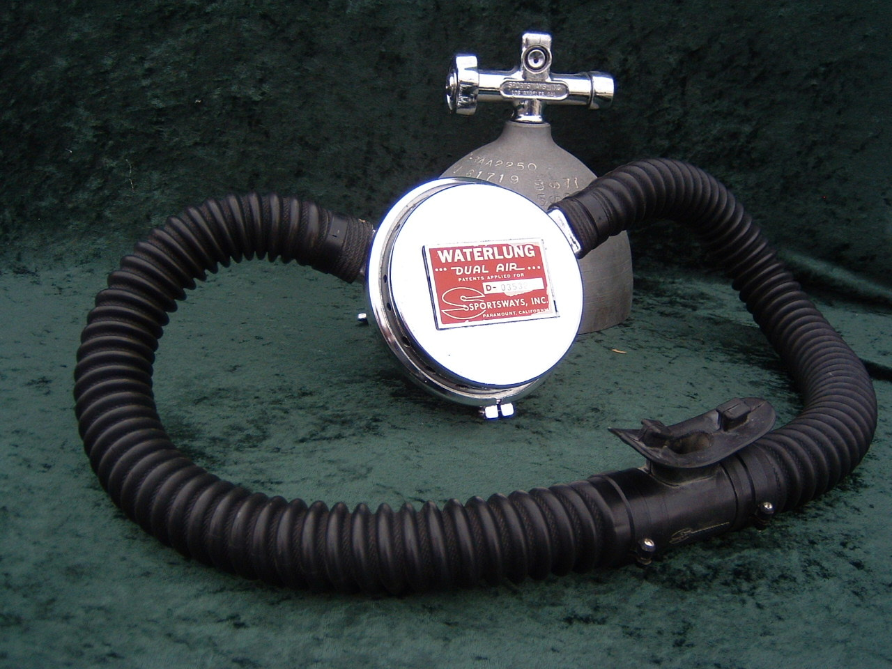 The Dual Air was the brainchild of Sam Lecoq.  Sportsways made the double hose regulator after they had been making the single hose regulator.  One really neat thing about these vintage double hose regulators is that you can adjust the intermediate pressure without taking the regulator apart.  This regulator also had high and low pressure ports.