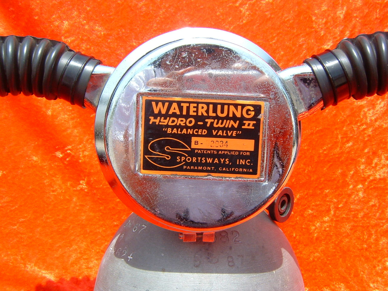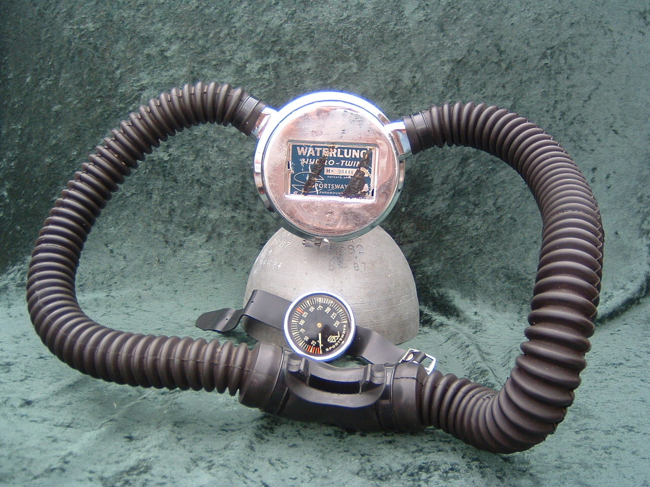 This is the Hydro Twin by Waterlung.  It was an unbalanced 2 stage regulator and like other Waterlung 2 hose regs the IP could be adjusted externally without taking the regulator apart.  The Hydro Twin was offered in 1963 as a replacement for the tilt valved Dual Air. The Hydro Twin has a downstream 2nd stage. It also had a high pressure and low pressure port. The Hydro Twin II succeeded it in 1964. This regulator had a balanced 1st stage.  This particular regulator has been dived to 138 feet by The Scuba Museum staff at Paradise Springs in Ocala Florida and it performed very well.  The label has some tar like substance on it that cannot be removed without damaging the label.  The hoses were in poor condition so a US Divers set were substituted.
