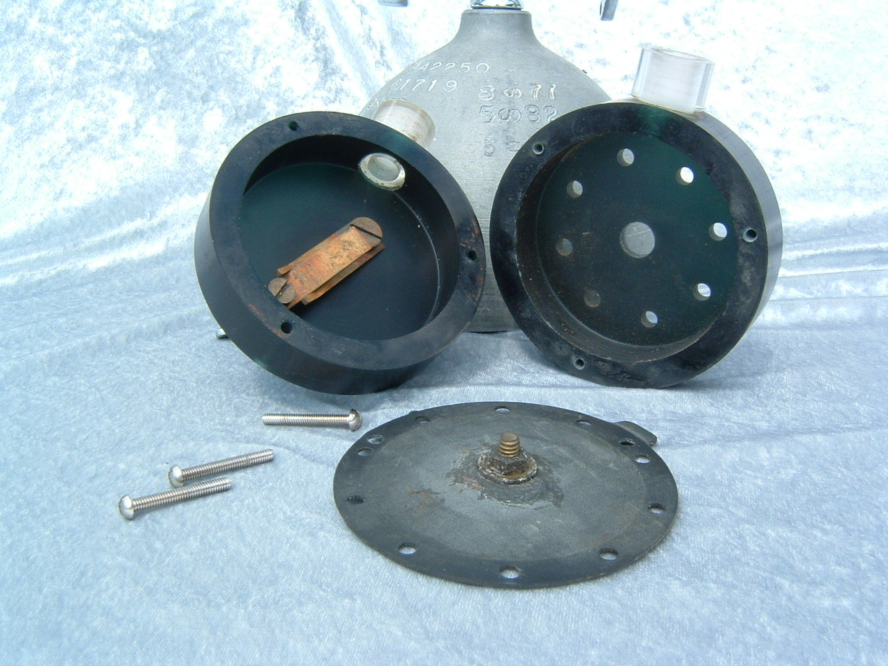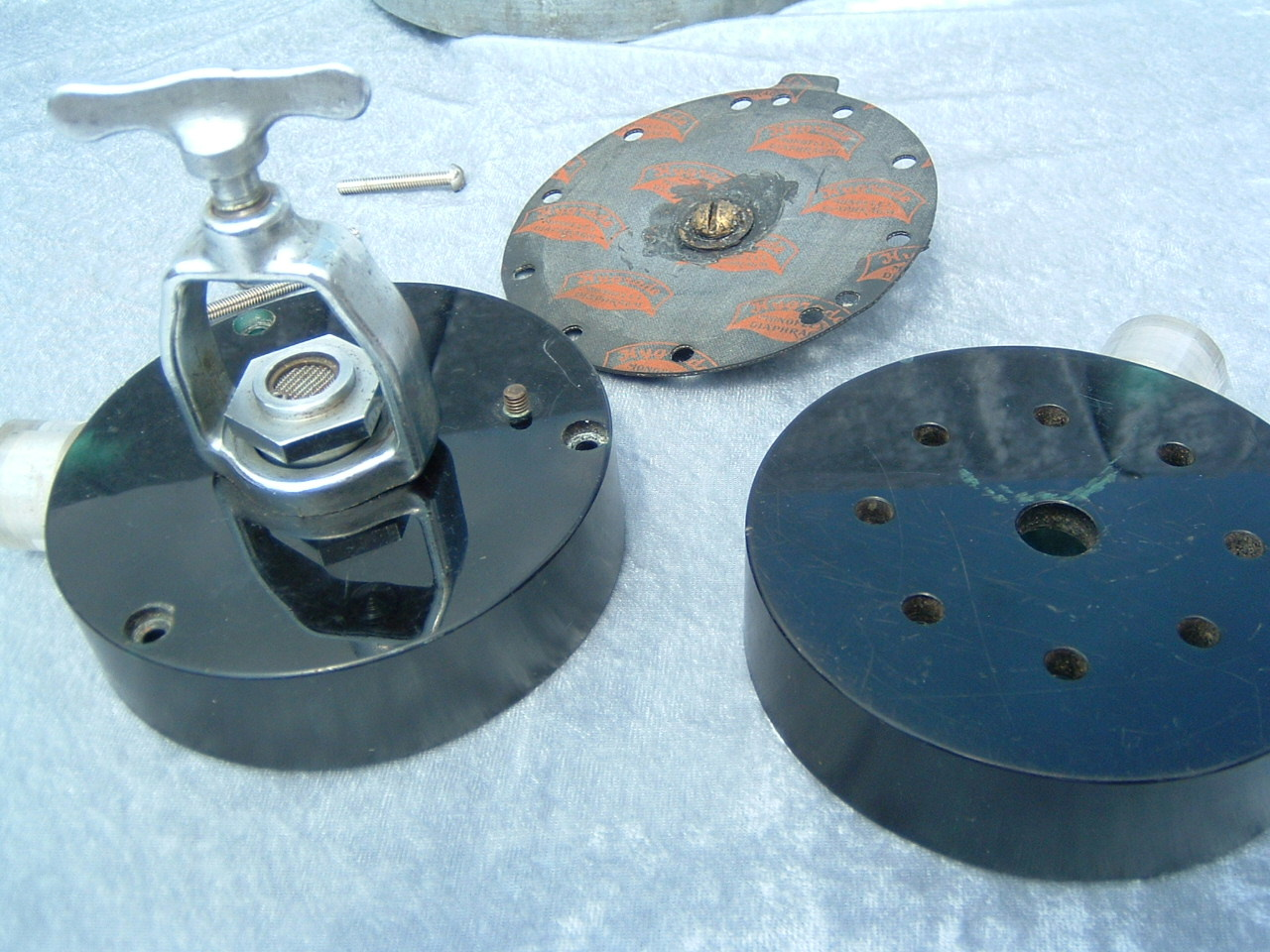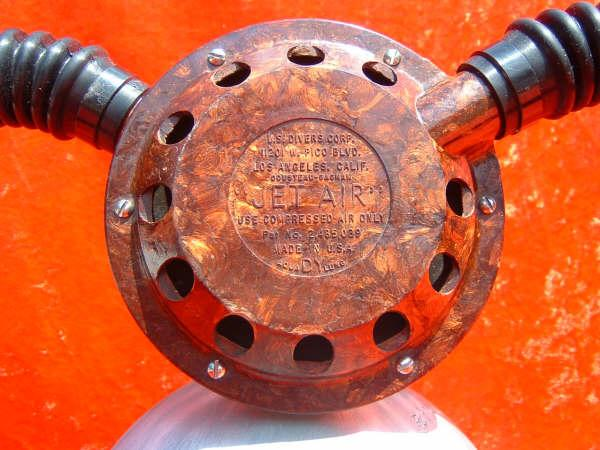 The first Jet Air circa 1956 was made of a brown plastic compound with raised lettering.  It was a cheap alternative to the more expensive brass case regulators of the day.  I fact the plastic case with 6 screws was probably a superior design and definitely sealed the main diaphragm.  This regulator is very unique looking and is beautiful in is ugliness.  These cases prove to be very durable and resistant to corrosion. The internals were basically a Stream Air.