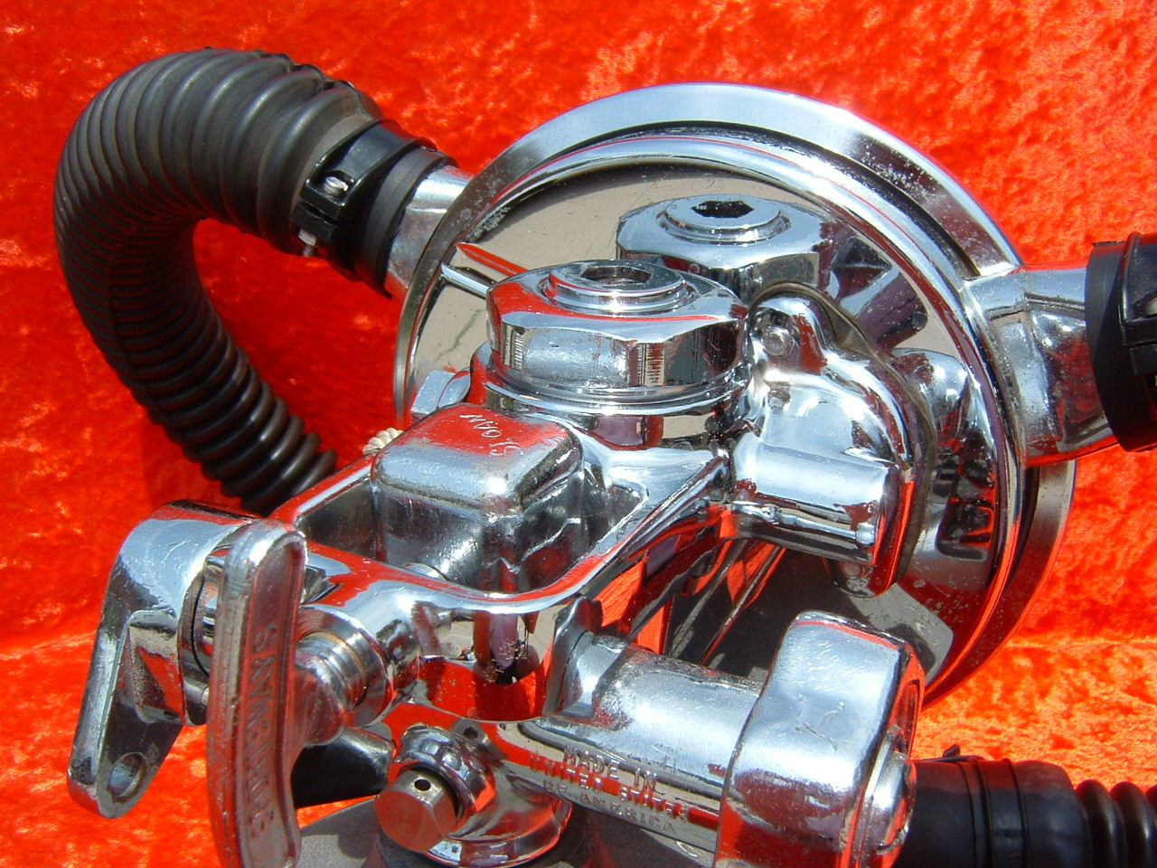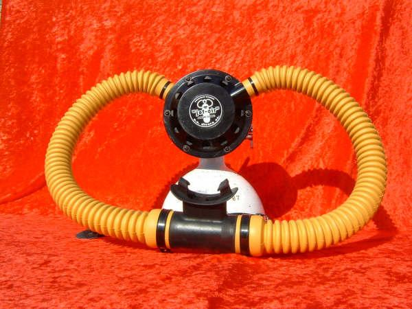 I know nothing about this regulator or it’s maker.  I do not even know if it was made in the USA.  It is a simple one stage like a mistral and appears to have a US Divers yoke on it.  The case is machined plastic and is screwed together.  The diaphragm is very stiff but should be easy to replicate.  The horns look as if they are valve inserts used in the early Broxton av Trade Mark one hose assemblies in the 50s.  I would guess this regulator was made in the 50s and it still works even today.
