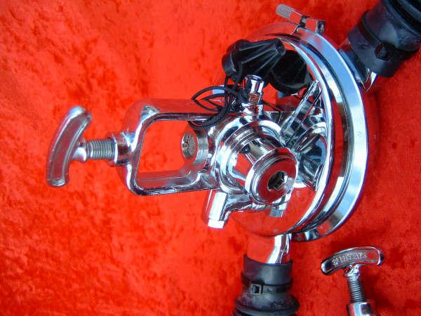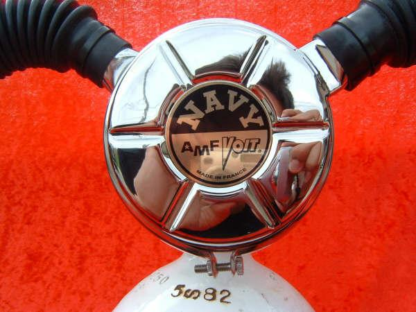 The Voit Navy was simply a relabeled Us Divers Da Aquamaster.  It is one of the most common Voit regulators you will find today and this particular model has several aftermarket features.  I have replaced the hoses and label with reproductions.  The mouthpiece is of course a silicone reproduction.  The front cover has been rechromed making photography a challenge to say the least.  I have also installed a long yoke to facilitate the use of  banjo fitting with pressure gauge.  The nozzle was replaced with a Royal Aquamaster nozzle as well.  The Navy was made in France and came with 2 different label colours and 2 different chrome combinations.
