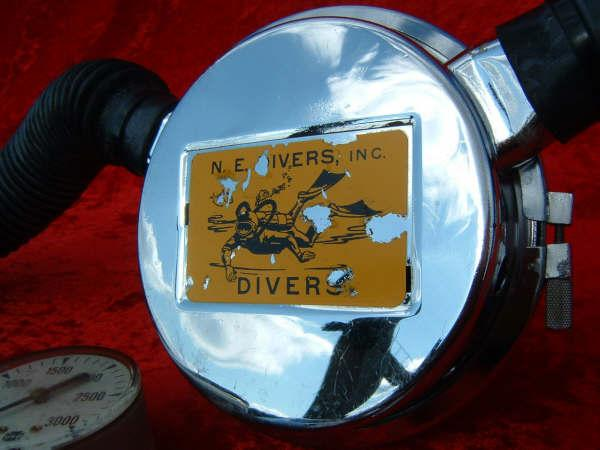 The New England Divers Company rebranded Sportsways Waterlungs.  This example has a little missing off the label, but not enough to have a reproduction made.  The hoses were long gone when I got it so I took this opportunity to use some one inch hoses from a company in Ohio and a Hope Paige mouthpiece.  I think everything mates up rather well and this regulator breathes very nicely.  I have dived this regulator on several vintage scuba dives in Maine, Ohio, Florida, and Massachusetts.