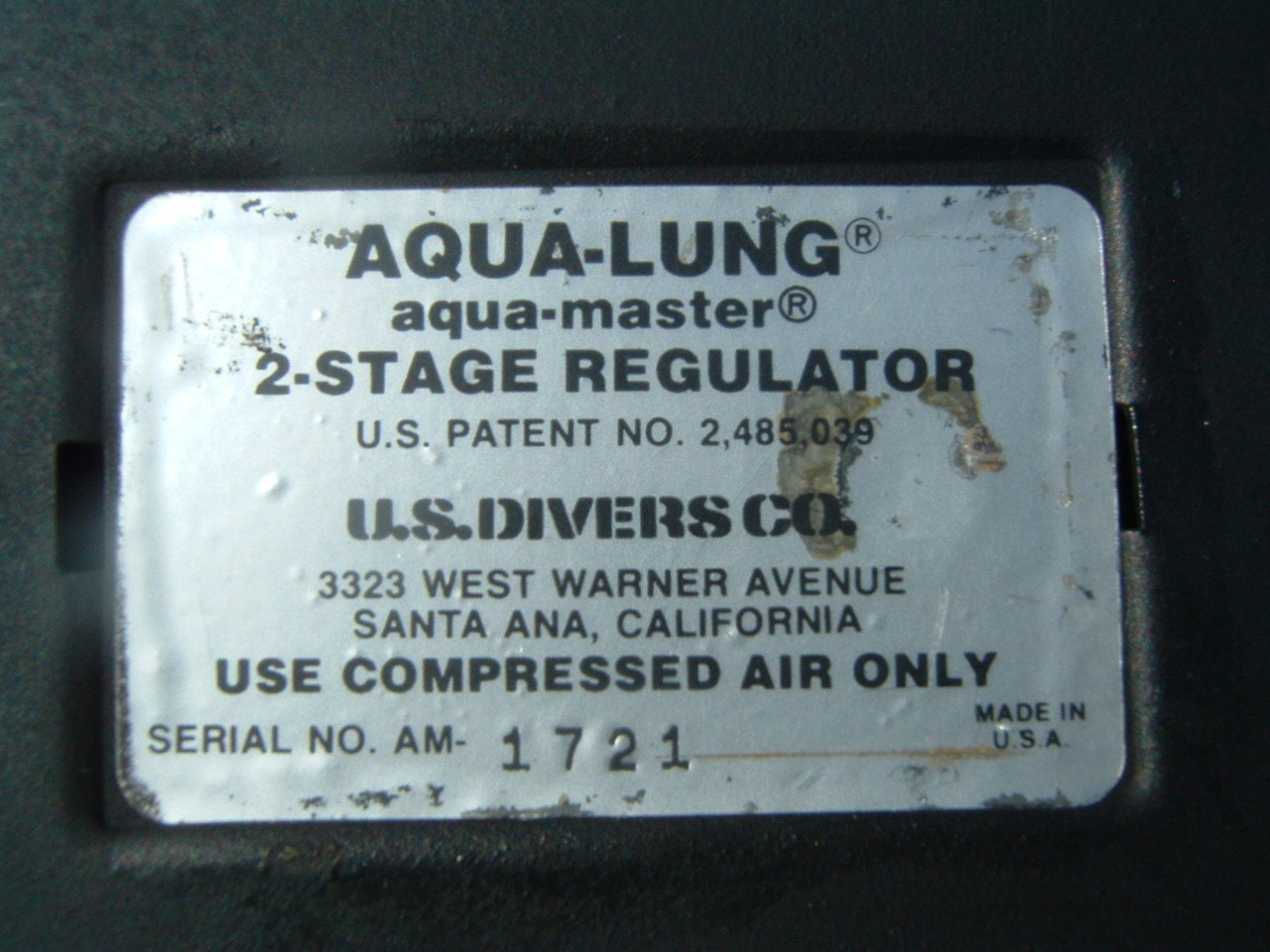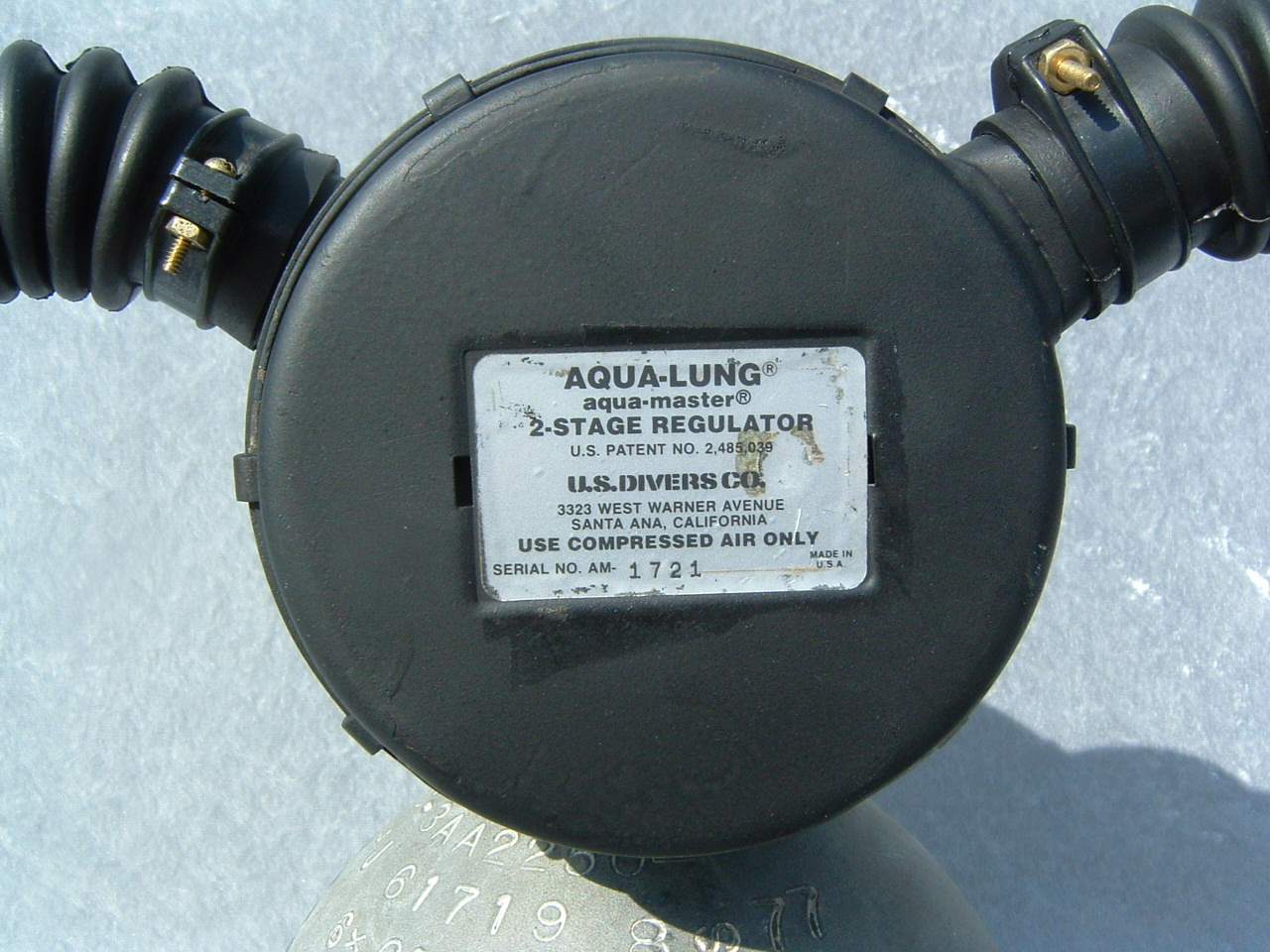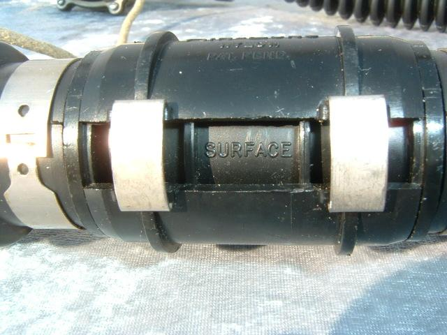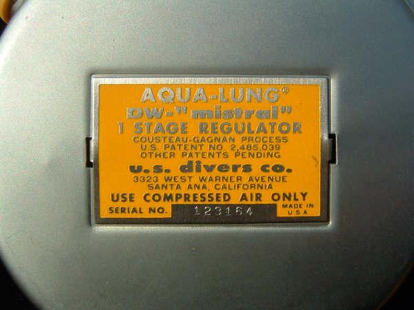 This NON MAGNETIC does not actually have low MU markings and is composed of non magnetic parts that failed the military’s signature testing.  These are very easily identified by the unique foil style label US Divers placed on them as well as the heavy yoke with small yoke screw.  It is reported that approximately 90% of the non mags submitted to the US Military failed the test and did not receive the low MU marking.  Some of these regulators still went into the service of the country for missions that did not require a low magnetic signature and were used in various “tactical” missions.  This model is serial number 1721, however I do know of one other in a private collection serial number 2018 indicating that perhaps over 2000 tactical non magnetic regulators were made by US Divers.