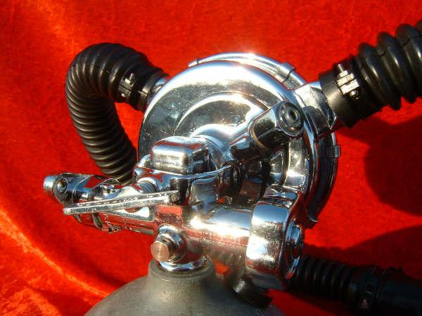 This was the last of the Royal Aqua-masters.  It featured a heavy Conshelf style yoke designed for the higher pressures of the newer tanks.  I also featured the round label and a nice deep chrome finish (making it very hard to photograph).  While definitely not as elegant as the first RAMs it is one of the most coveted Royals by divers that wish to use it on newer high pressure cylinders.