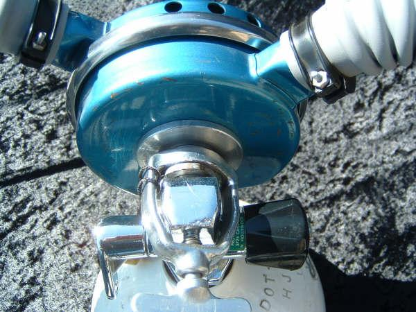 The Navy Type DA is another riveted label 1950s regulator from US Divers.  This particular model has the original tinnermann hose clamps still on it.  These clamps are period correct but are prone to rust, difficult to deal with, and ruin the original hoses in my opinion.  I almost always remove the tinnermans from the regulators I dive to make it easier on maintenance.  I have not had this model rebuilt as it is basically the same regulator as my beloved DIVE LAB tested Trade Mark Aqua Lung blue label, Broxton.